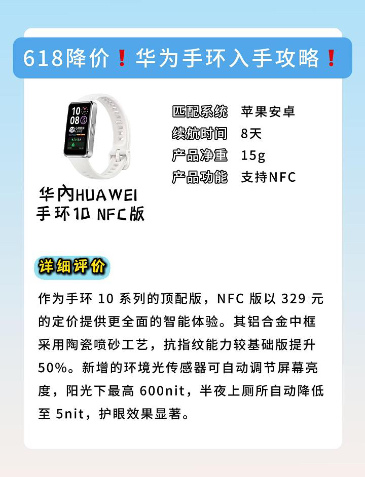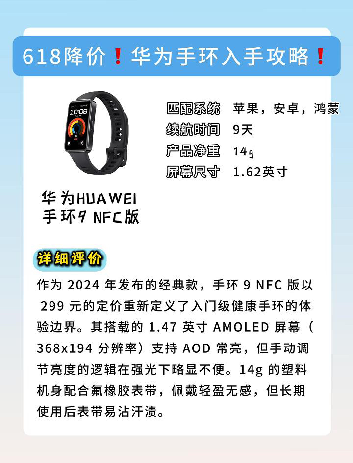 宝子们!华为手环三款热门型号 618 集体大跳水,价格直接砍到 “骨折”!作为一名科技博主,今天拆解参数、功能、降价幅度,教你精准 pick 最值款 【华为手环 9 NFC 版:125 元的通勤神器】 ✅核心亮点: * 跨系统兼容:安卓 8.0+/iOS13.0+/ 鸿蒙 2,苹果安卓用户通吃; * 续航抗打:常规使用 9 天不用充电,摆脱 “电量焦虑”; * NFC 秒通勤:公交 / 地铁 /...