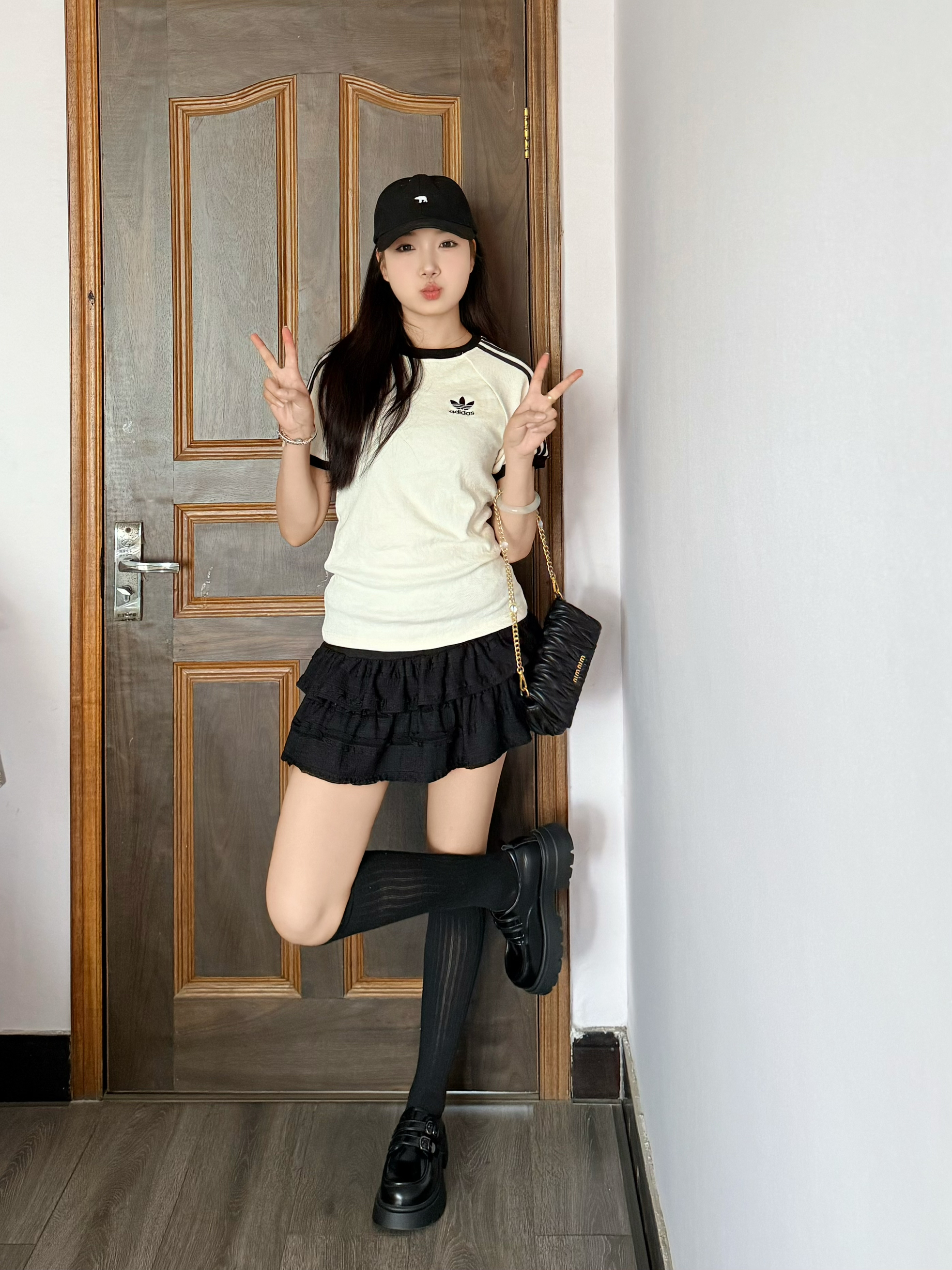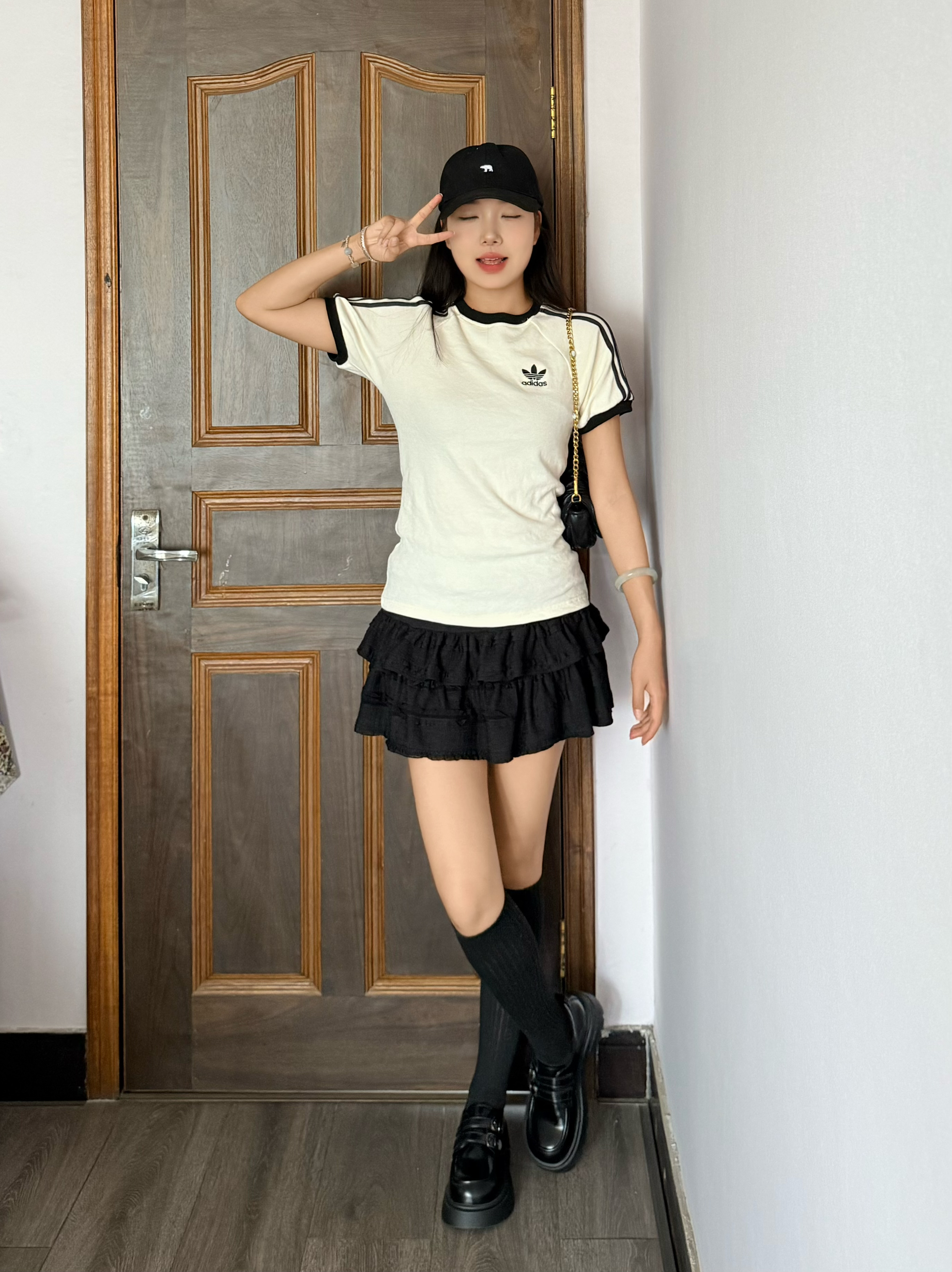 这套穿搭真的太绝啦!黑白配色的阿迪达斯短袖,经典的三条纹和三叶草标志,运动感十足。搭配黑色的多层蛋糕短裙,俏皮又可爱。黑色长筒袜配上厚底小皮鞋,甜酷感直接拉满。再戴上黑色棒球帽,斜挎一个小链条包,整个造型又酷又时尚。