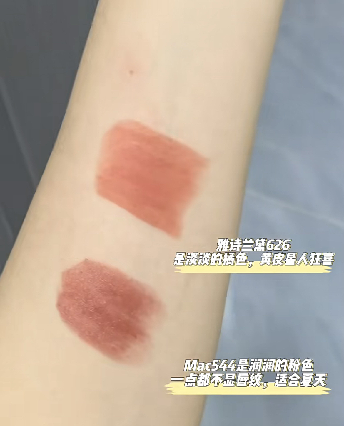 •雅诗兰黛626 是很显白的橘色不容易蹭掉色! 吃完东西也不要担心要补口红啦夏天叠涂一个唇油,就是玻璃唇了! • mac544 我个人比较喜欢这个色号 涂上很显嫩,很显气色的一个色号 你们喜欢哪个??