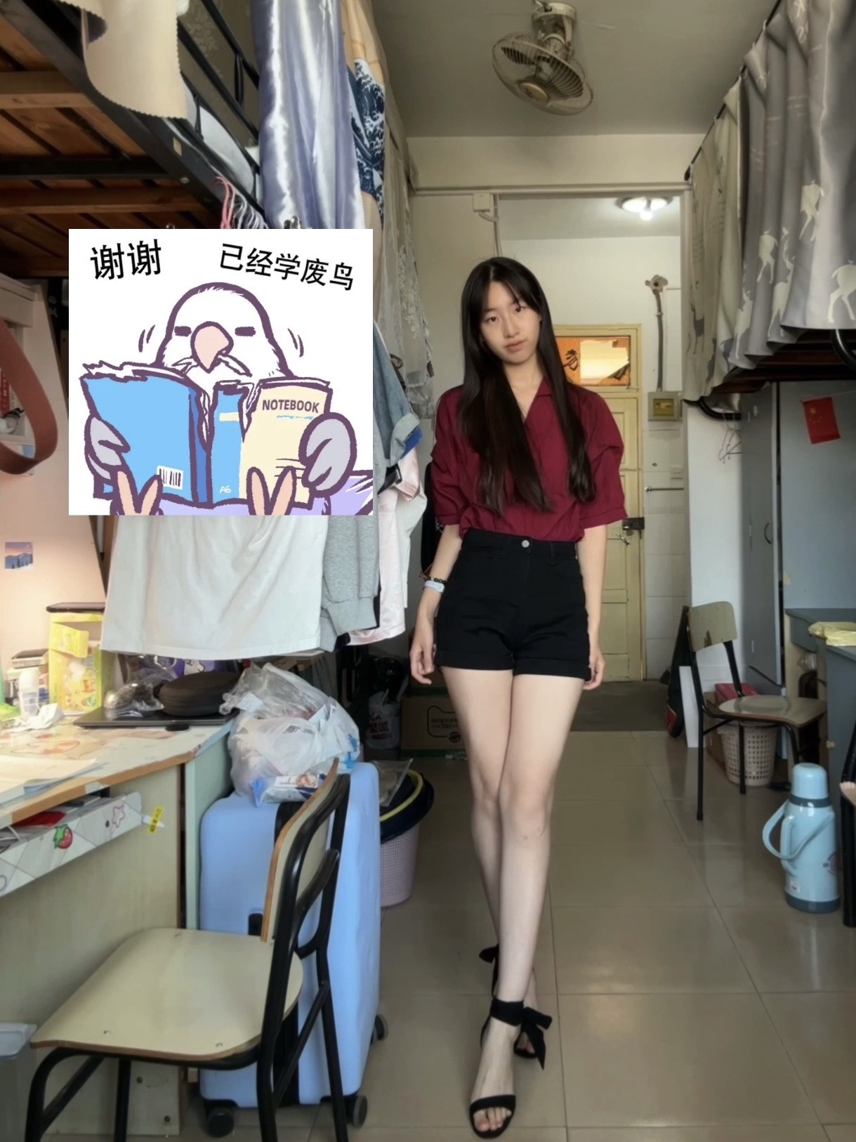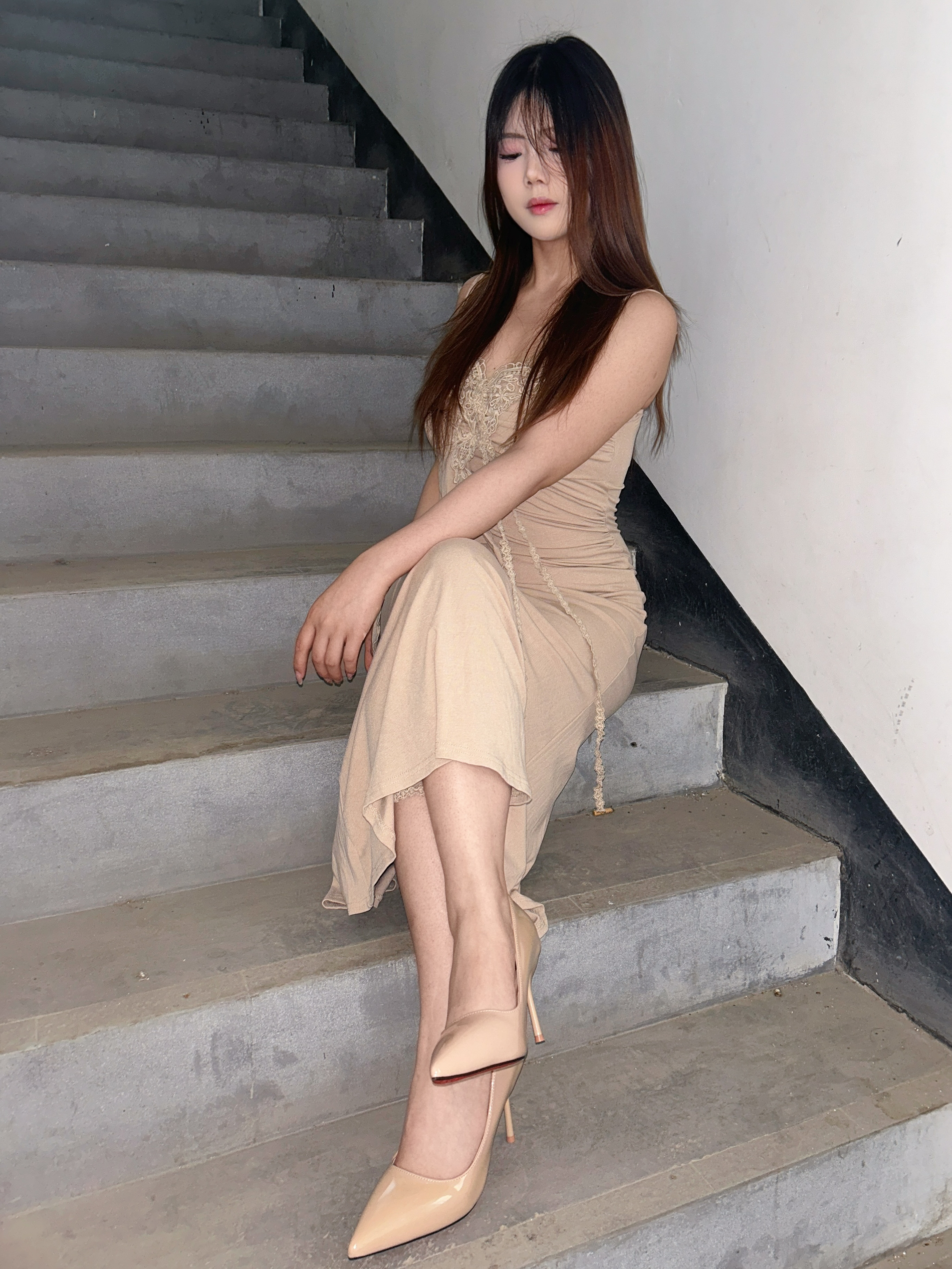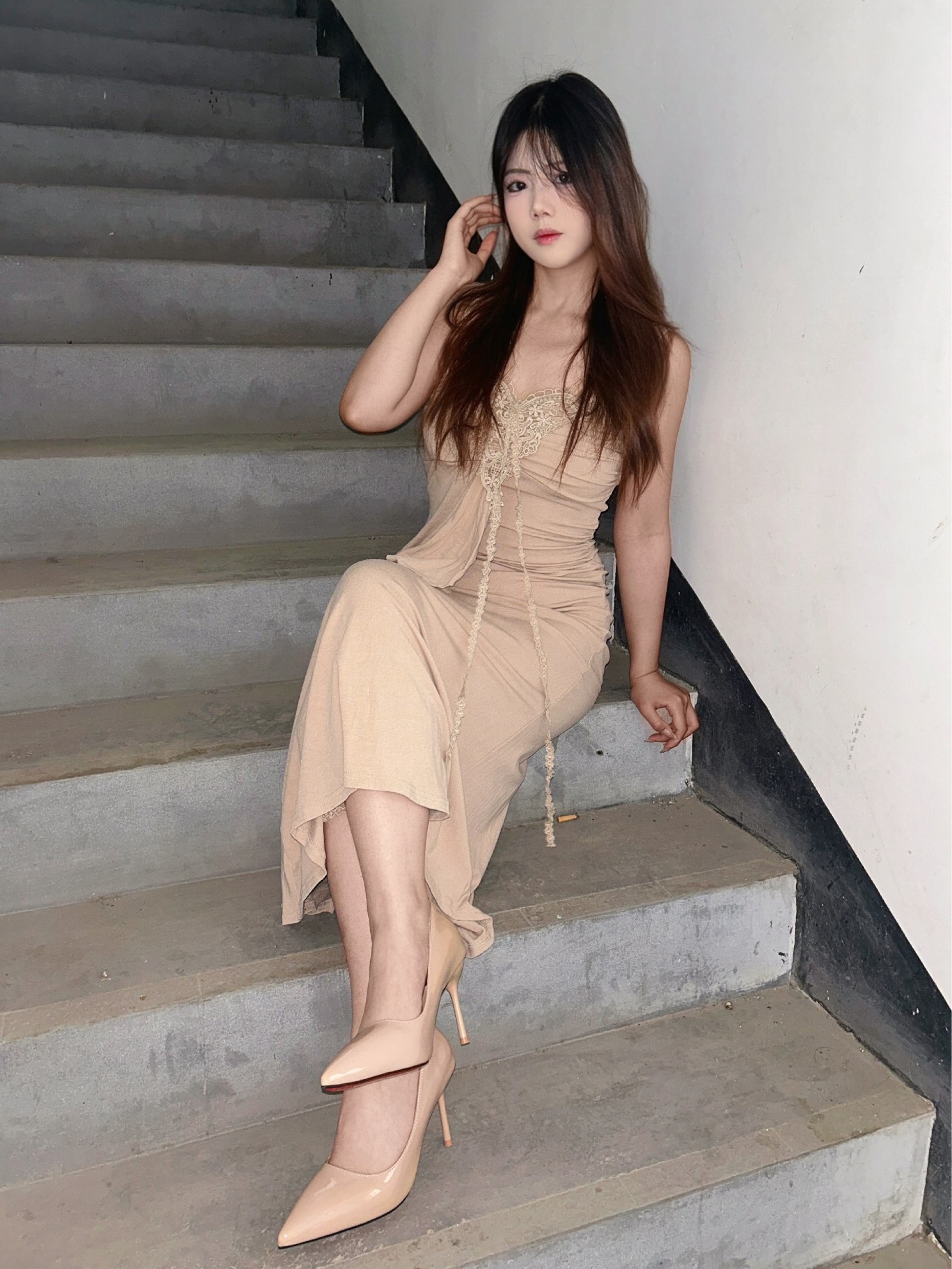 高跟鞋是裸色的很好搭配 底面还是红色的的很有气质 主要我觉得穿脚上不会不舒服 日常出勤很可以的也不会磨脚 不管是搭配日常衣服还是上班穿都可