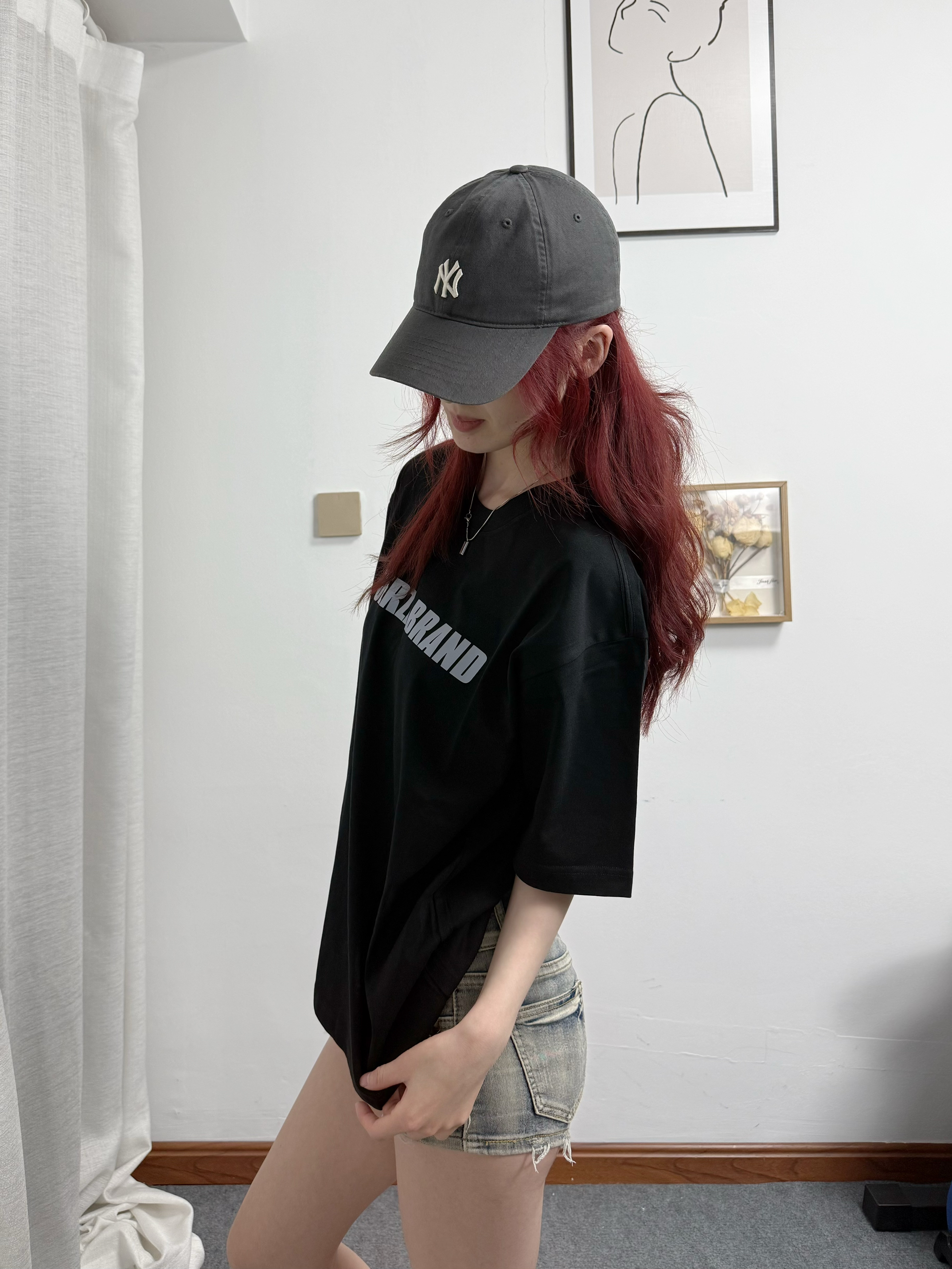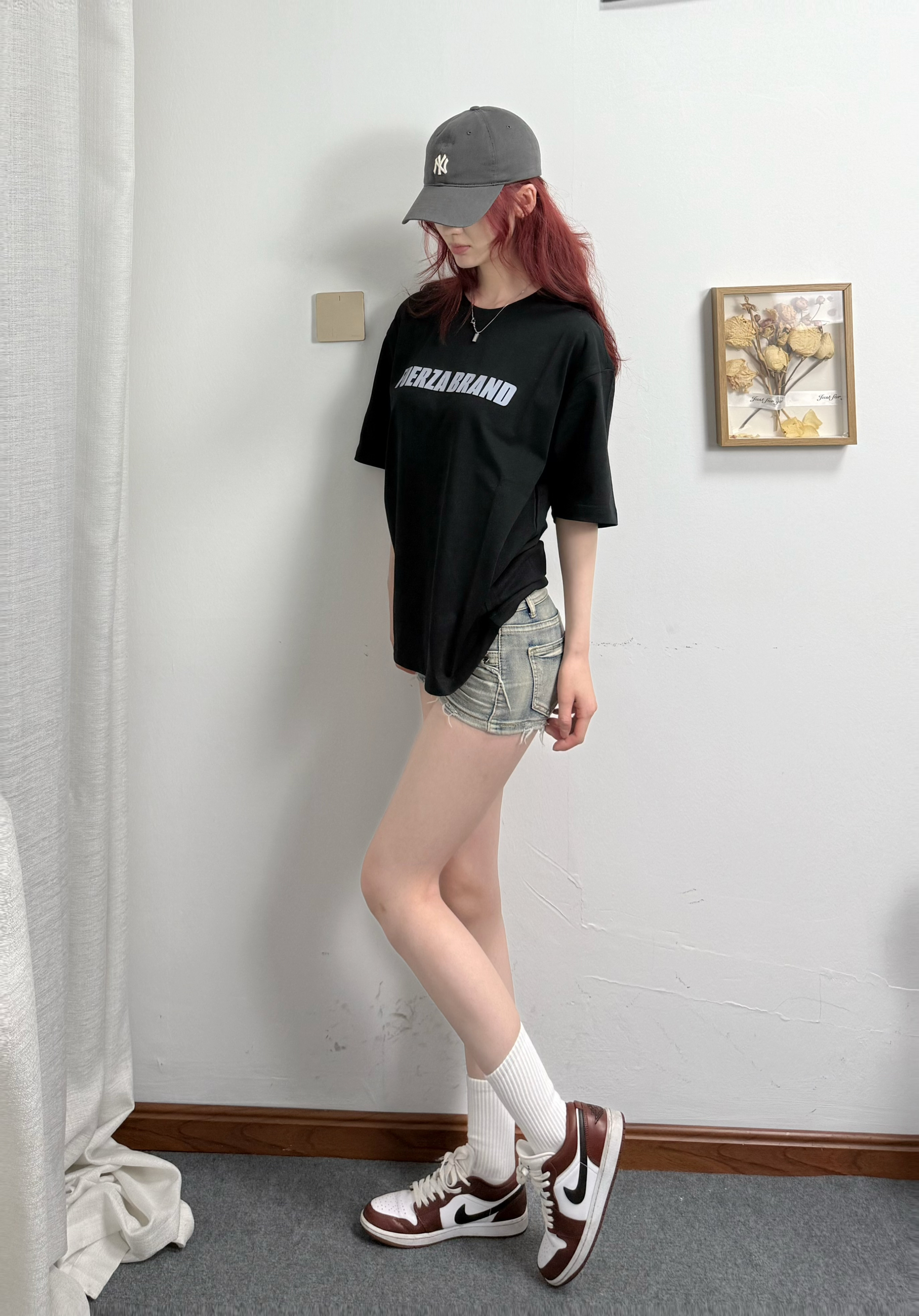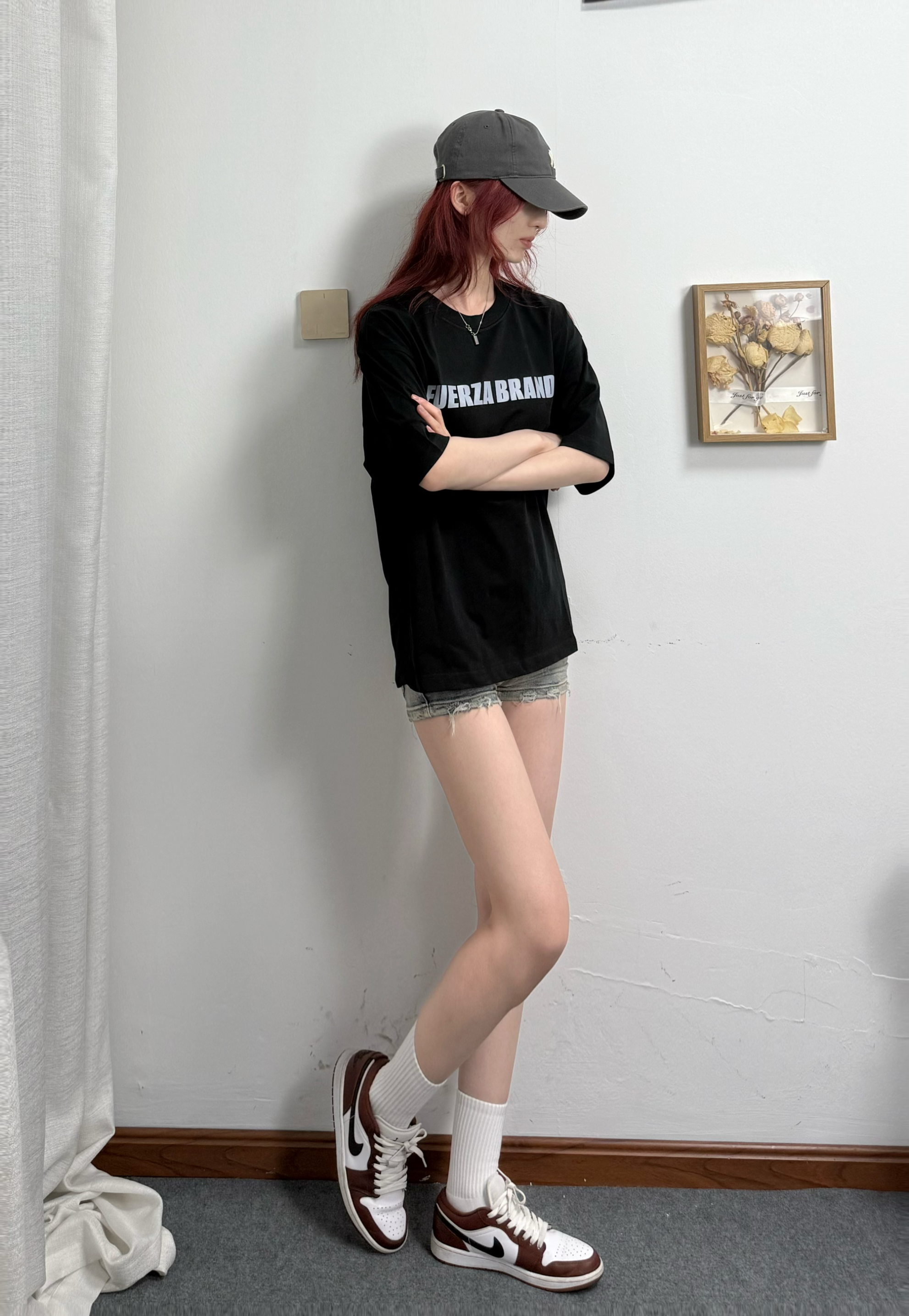 黑色短袖T恤搭配白色字母logo✨️ 经典又简约的搭配尊的好好搭! 版型也很正 宽松又不显臃肿 还是纯棉的材质 落肩圆领~ 我168/46kg穿的s码刚刚好 日常或者通勤也hin百搭哒 搭了一条牛仔短裤和aj1 轻轻松松穿出时髦松弛感😲