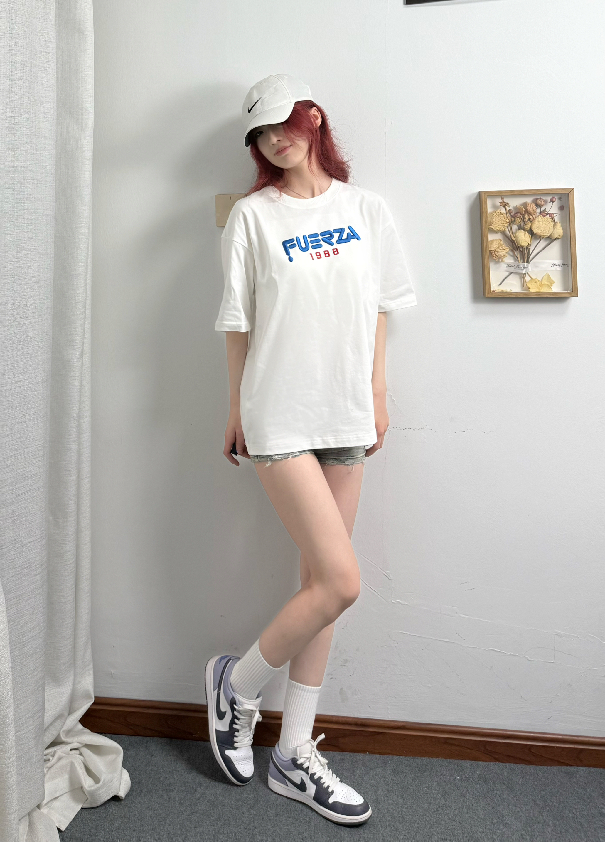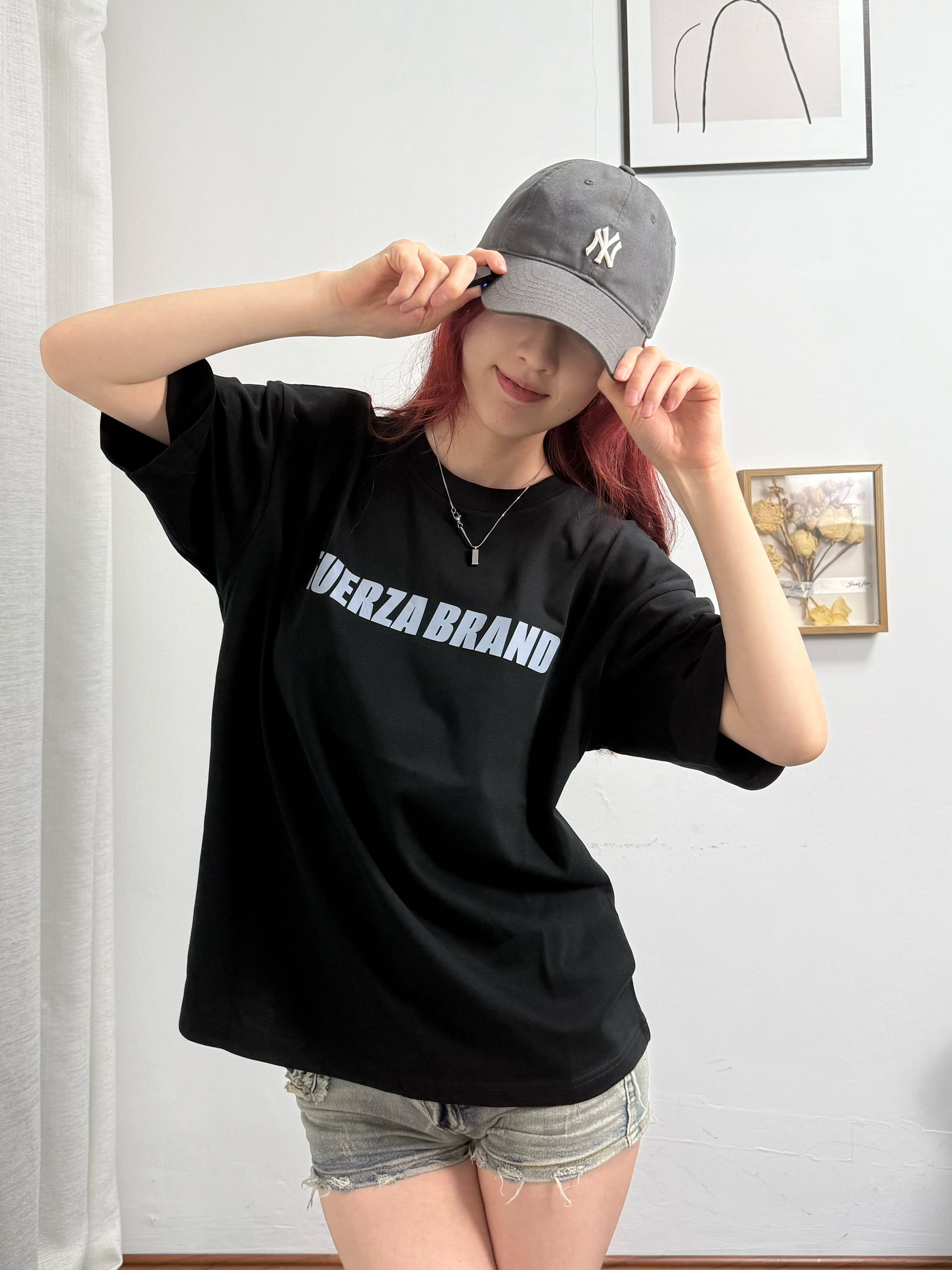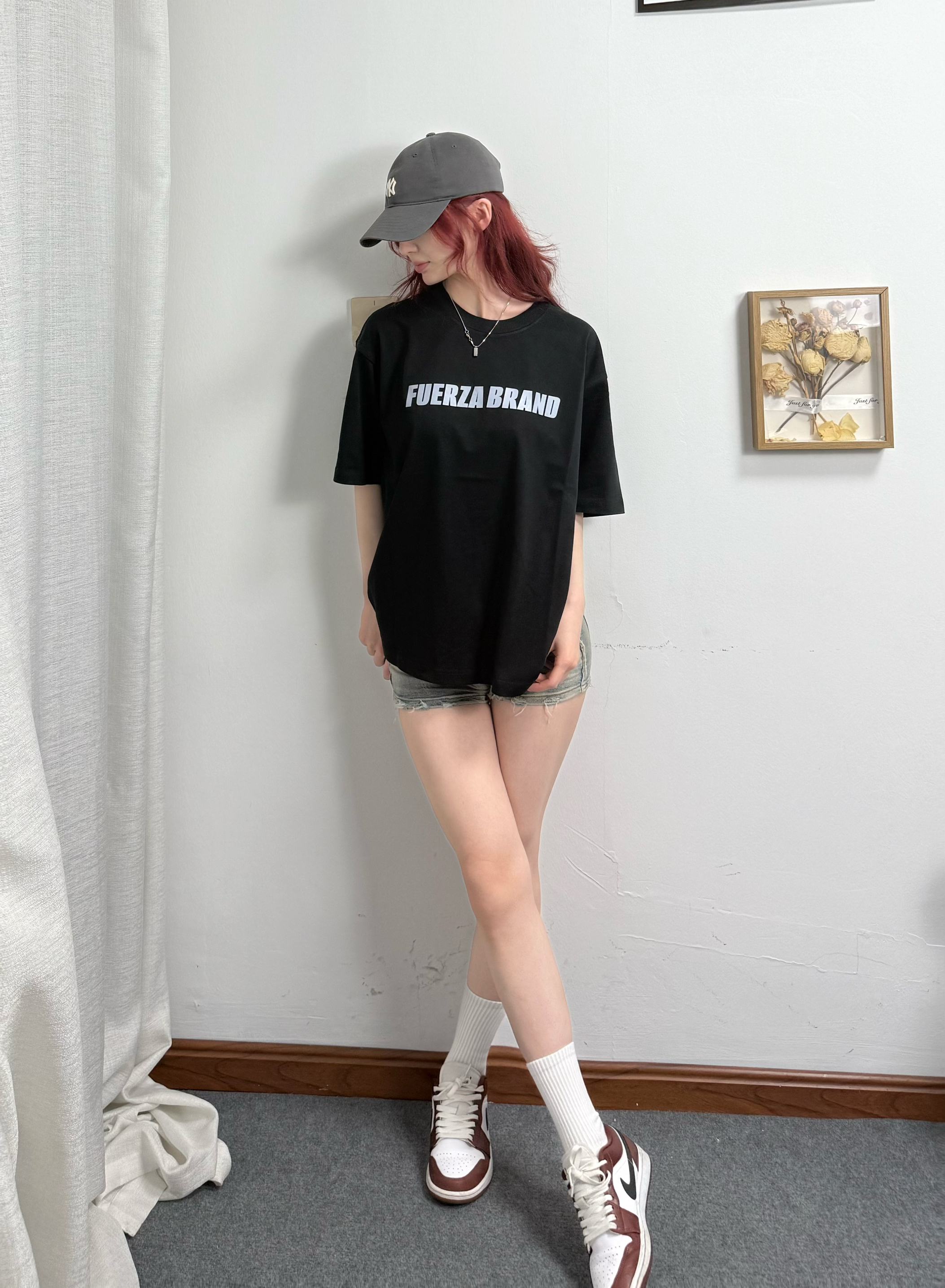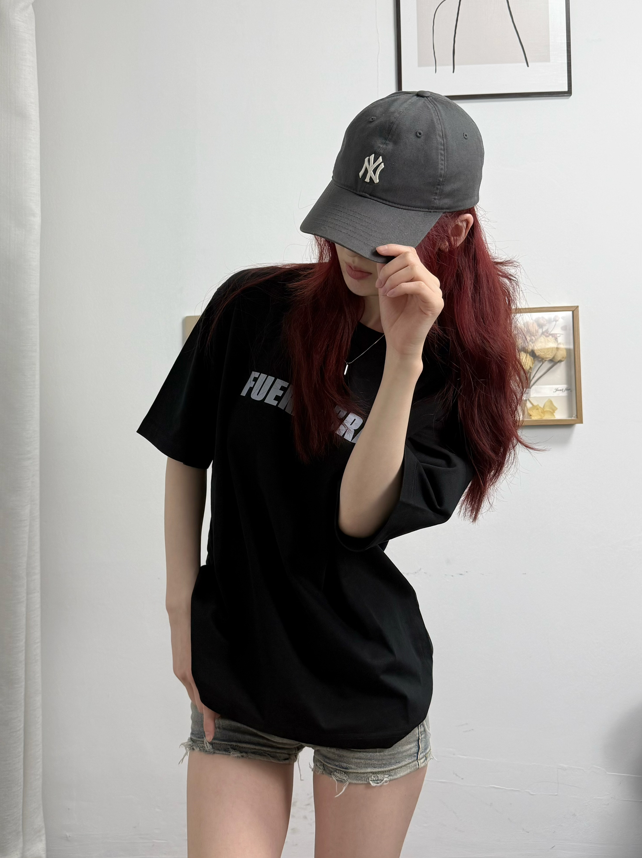 黑色短袖T恤搭配白色字母logo✨️ 经典又简约的搭配尊的好好搭! 版型也很正 宽松又不显臃肿 还是纯棉的材质 落肩圆领~ 我168/46kg穿的s码刚刚好 日常或者通勤也hin百搭哒 搭了一条牛仔短裤和aj1 轻轻松松穿出时髦松弛感😲