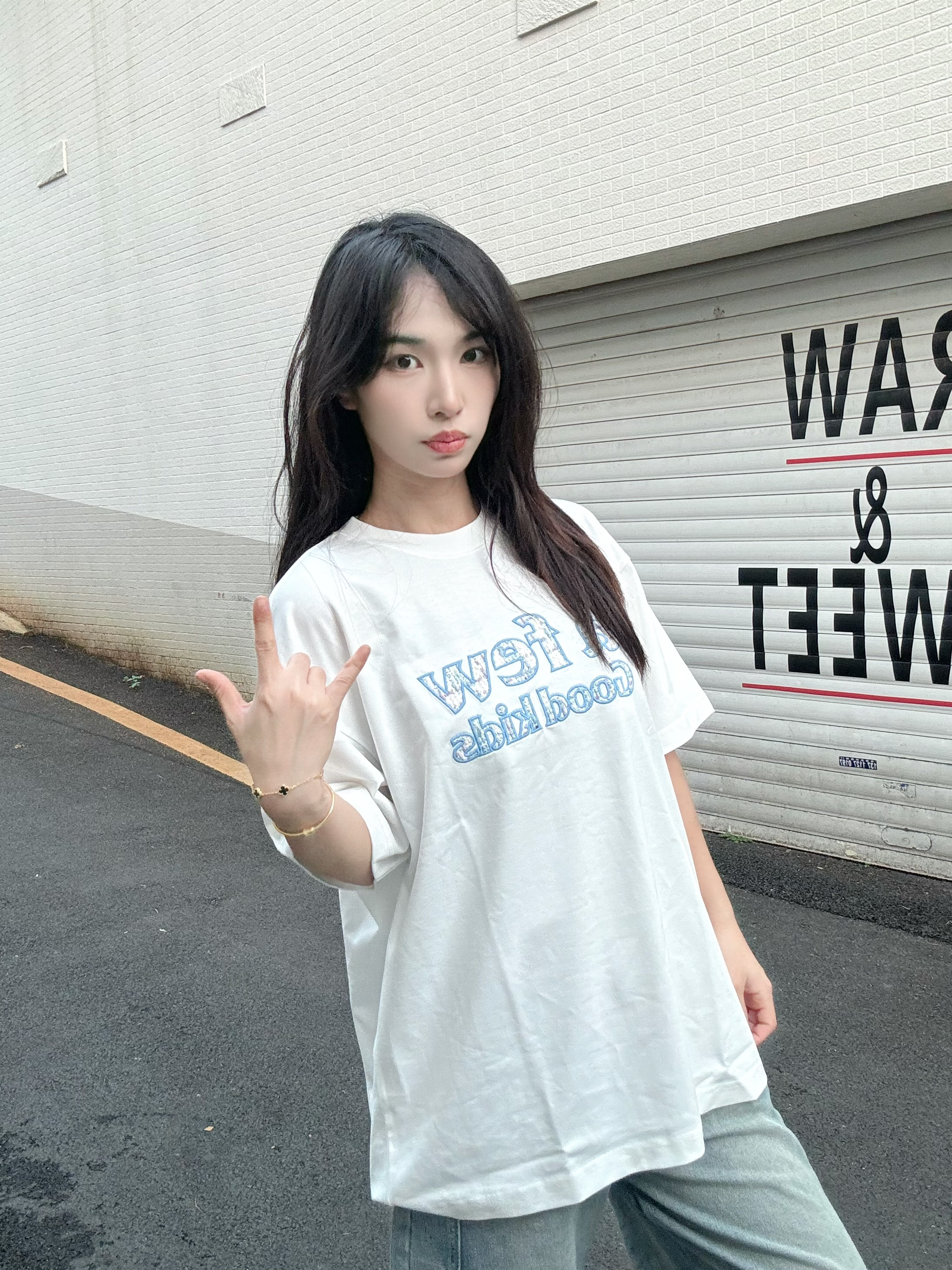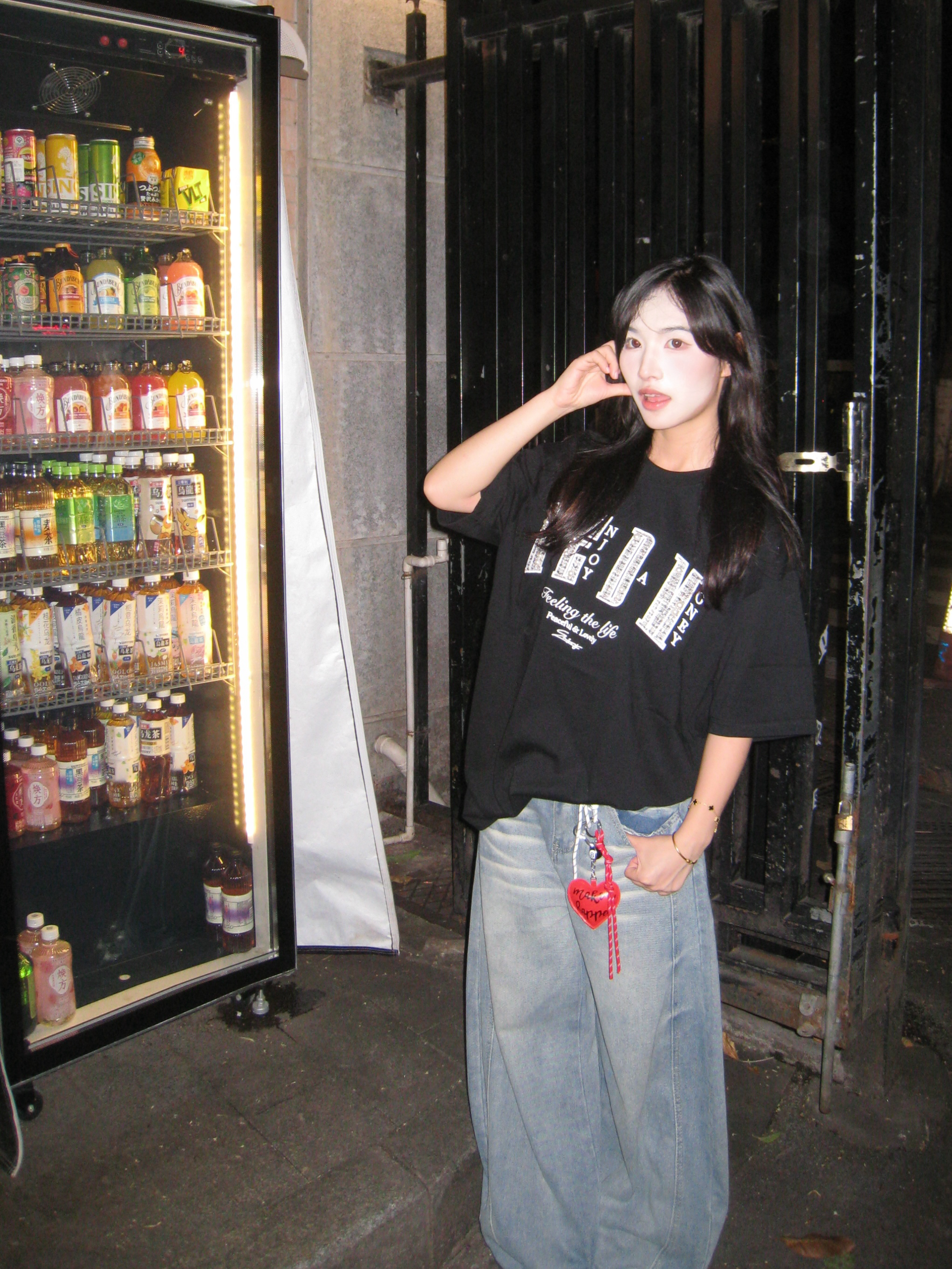 今天穿了MEDM的珍珠短袖 黑色的T恤上有白色的字母印花 很有设计感、搭配了一条浅色的牛仔裤,整体造型很休闲!