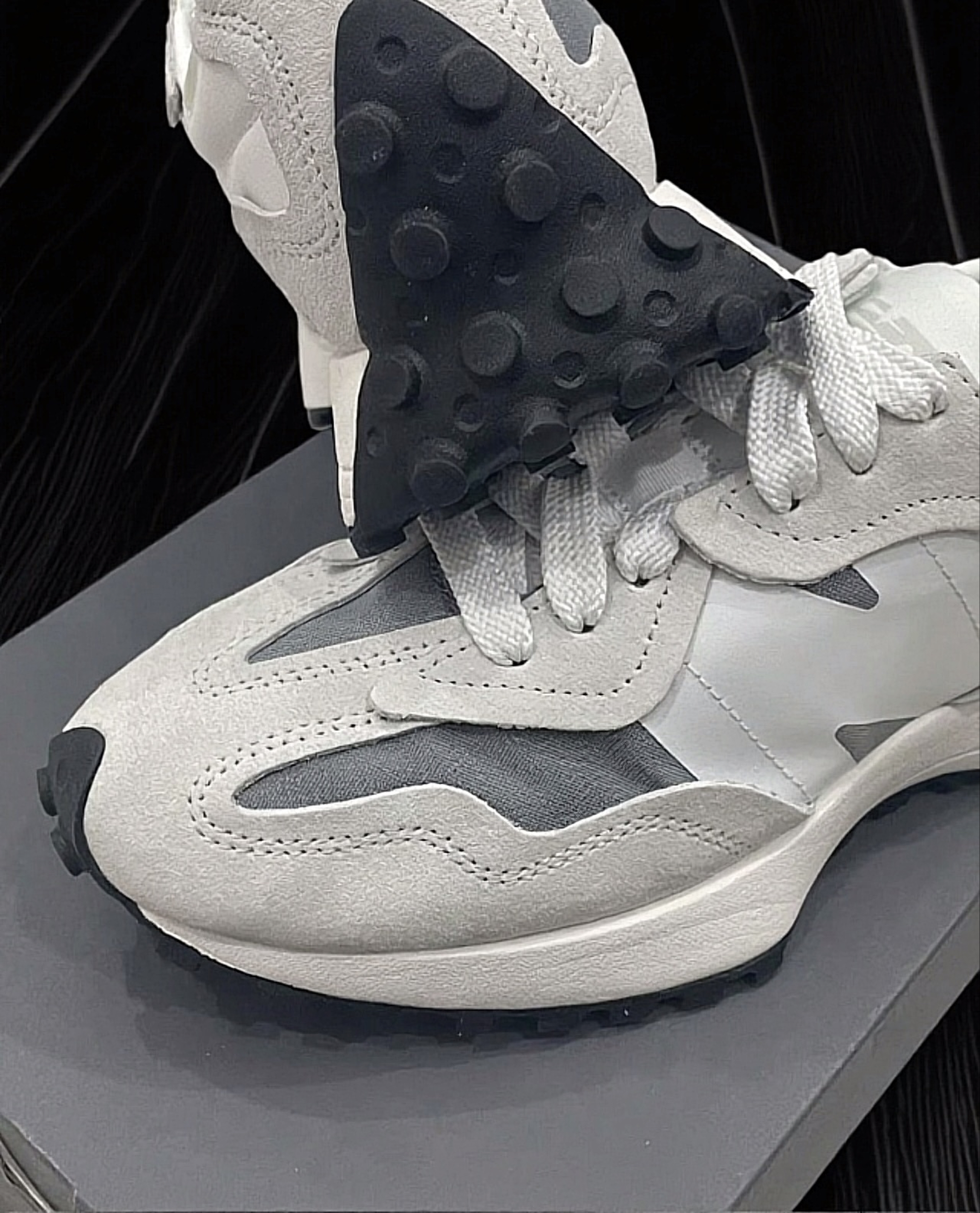 327#配色有点高级,鞋身整体使用灰白蓝配色拼接,侧面采用深灰色搭配白色,logo另一侧采用全白色帆布,这么低调且高级的配色可以安排上了