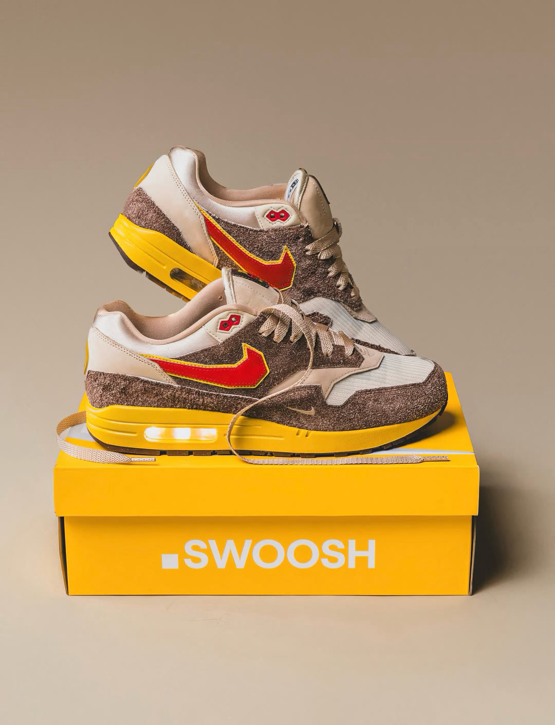 谁懂啊!这双 Nike Air Max 1 直接把「复古氛围感」拉满💥 麂皮+网面拼接,棕调主色自带故事感,红勾+黄底撞色超绝,复古又时髦,出街秒变街头焦点✨ Air Max 标志性气垫💨 脚感依旧能打,日常出街、慢跑都适配,复古党&机能控狂喜! 📦鞋盒都藏小心思,「SWOOSH」黄盒+大勾设计,收藏党狂喜! 复古风回潮期,这双必须锁🔒 点击入手,拿捏今夏复古穿搭密码~