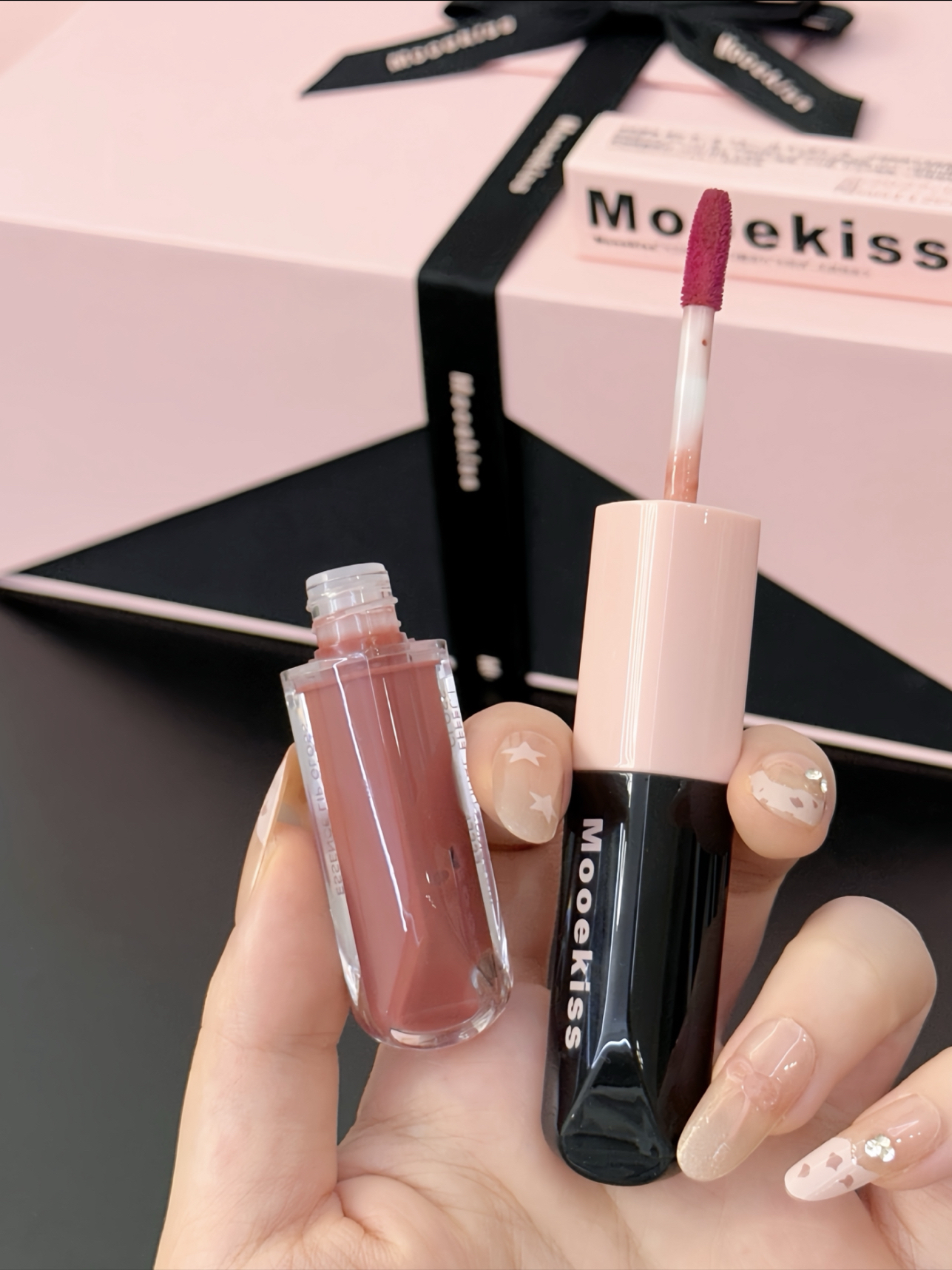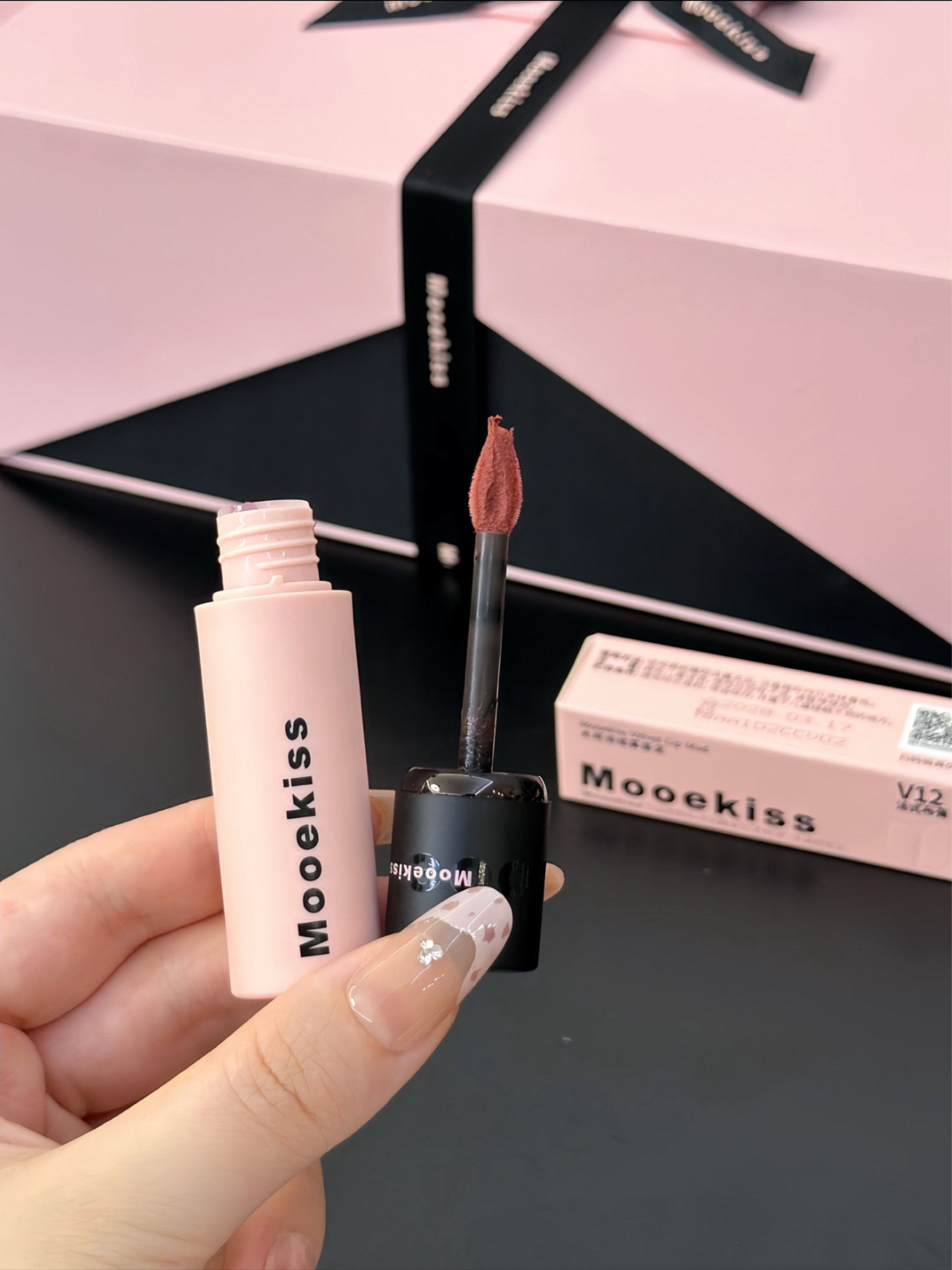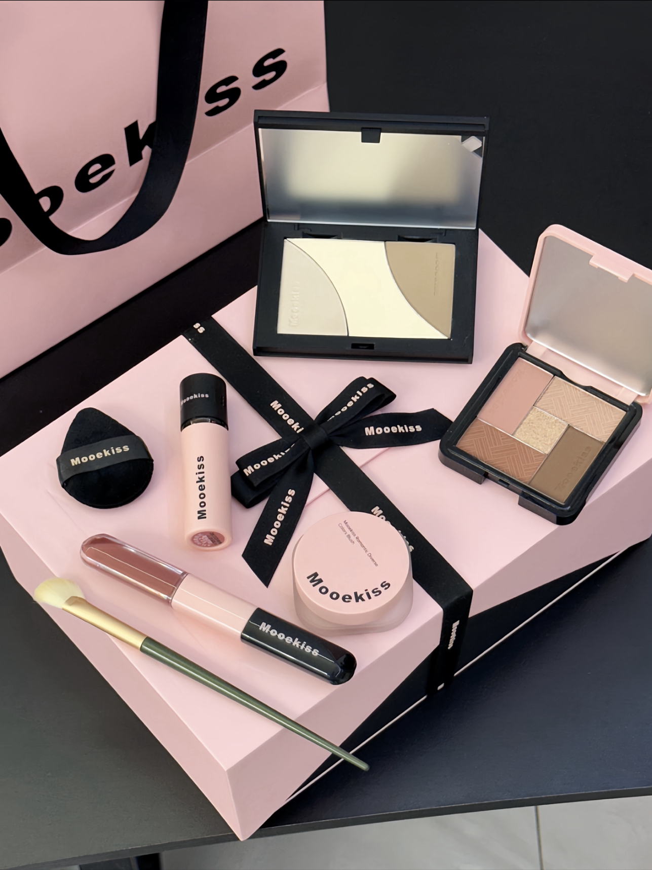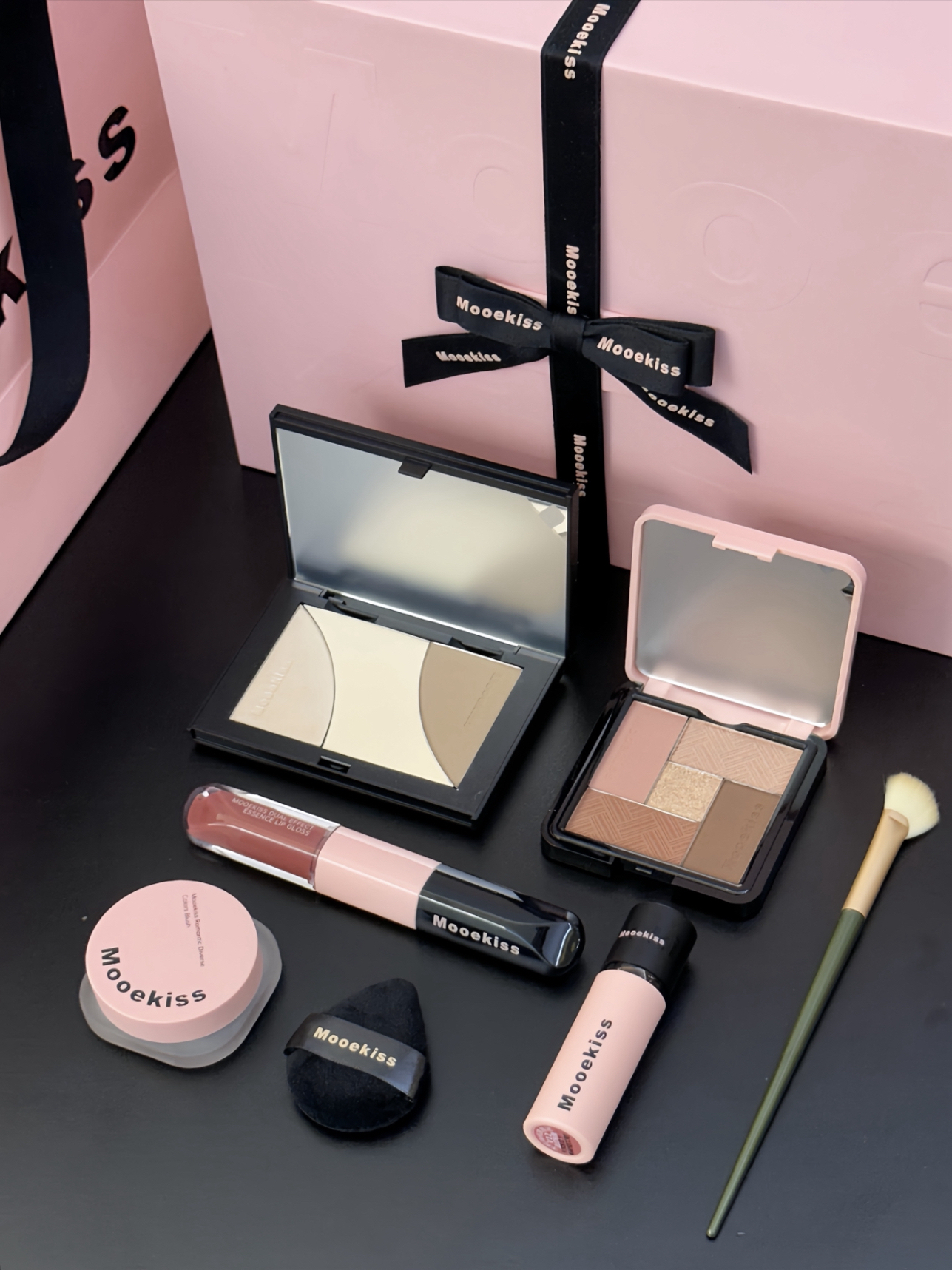 就是木柯诗滴介个心意满满礼盒🎁 黑粉配色滴包装 好好看哇 打开之后是满满一大盒彩妆 有眼影盘、修容盘、腮红、唇泥、双头唇釉 还送了修容刷和拇指粉扑 我感觉色号都是日常百搭滴那种 随便搭配起来都好看 而且礼盒包装送人也是嘎嘎有排面滴!