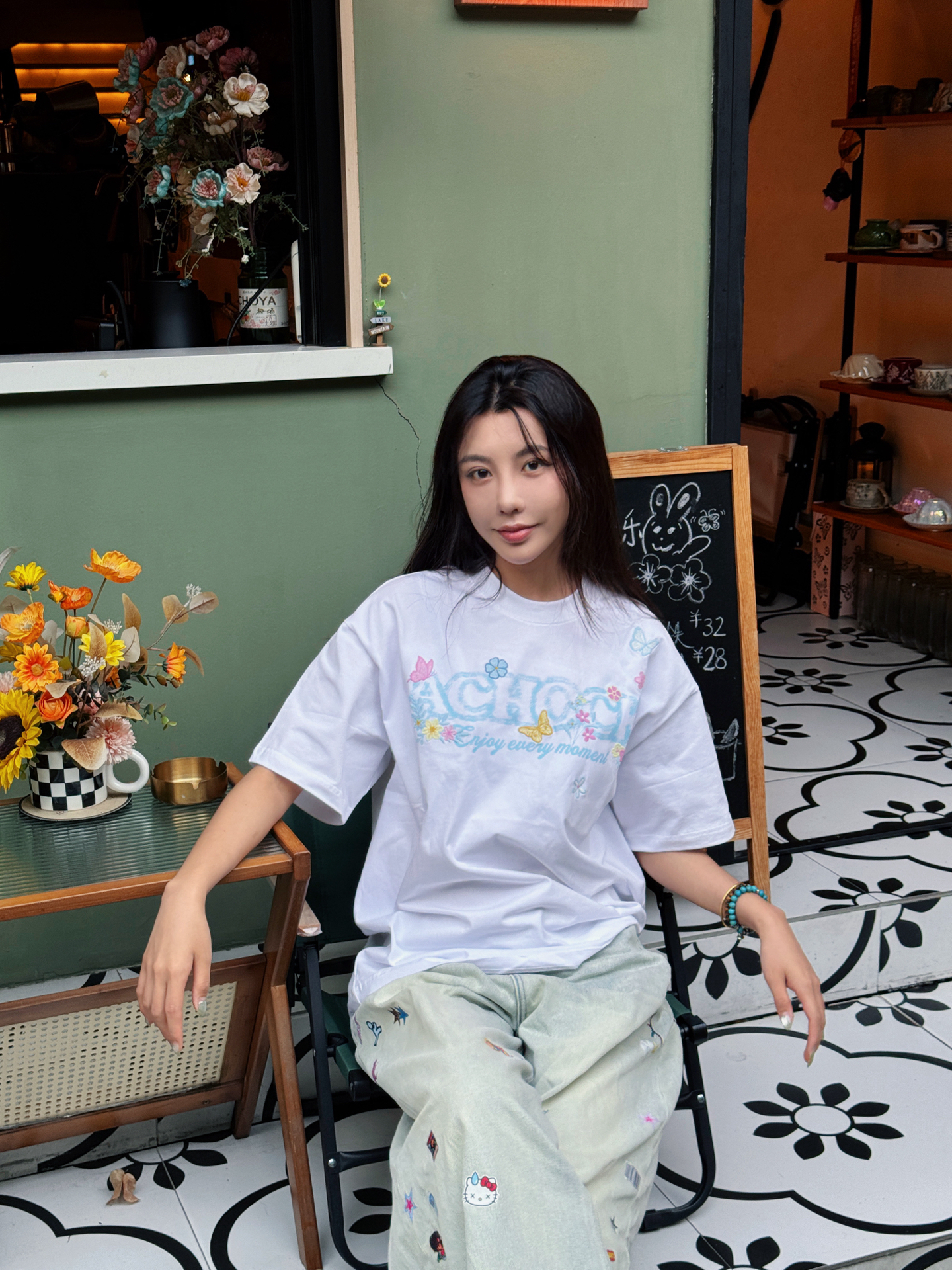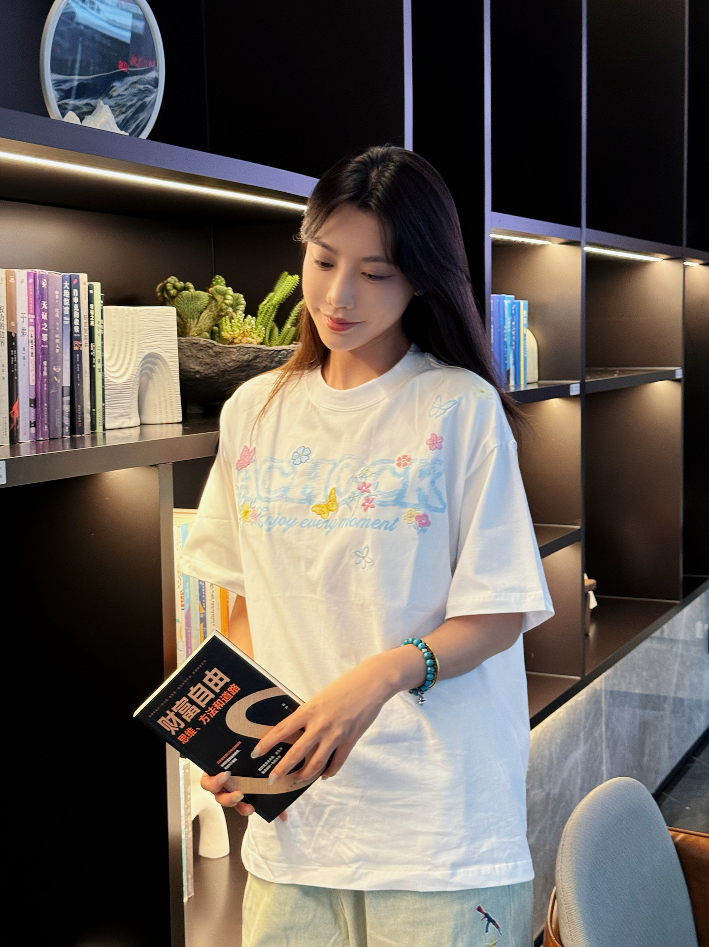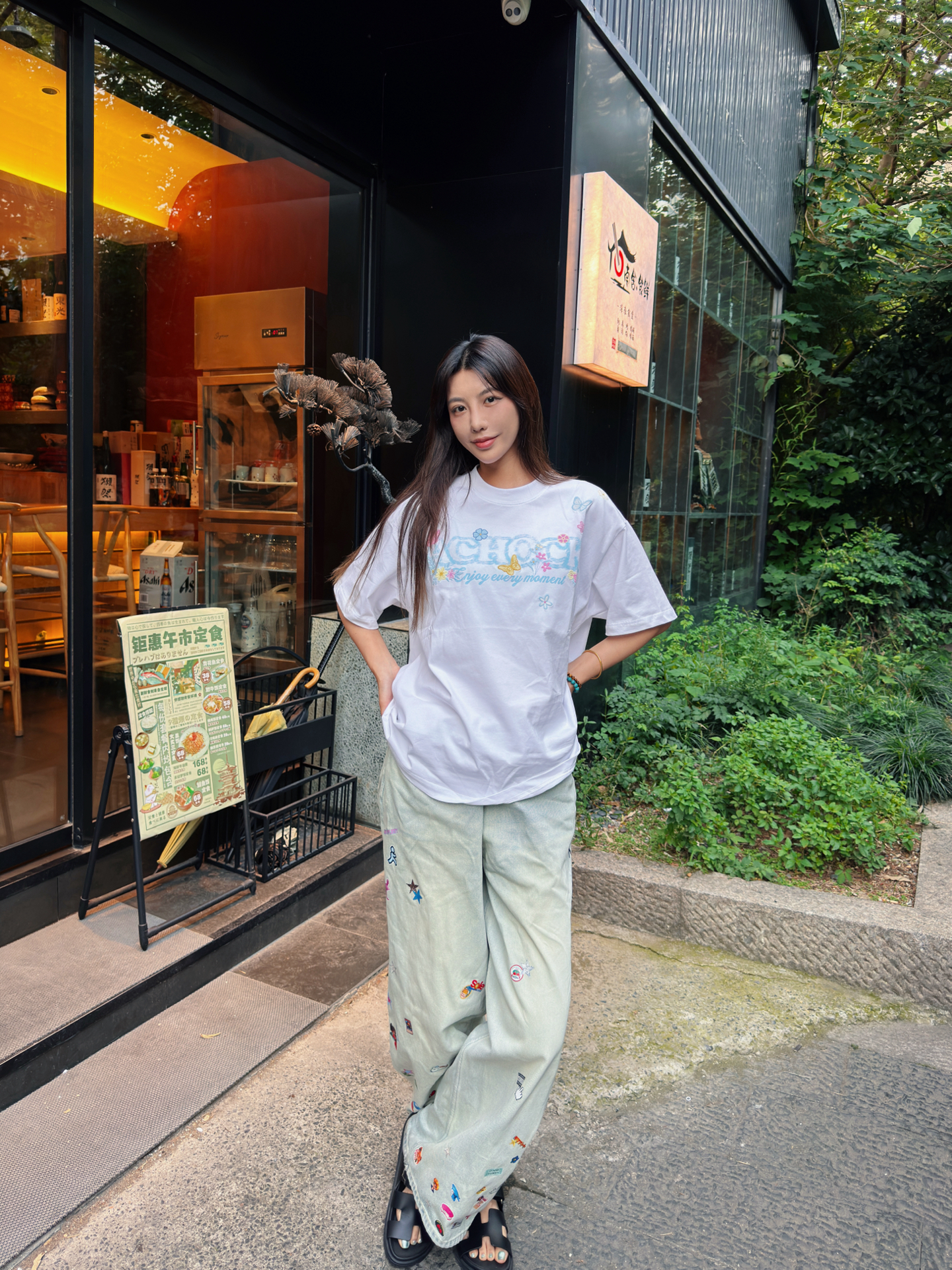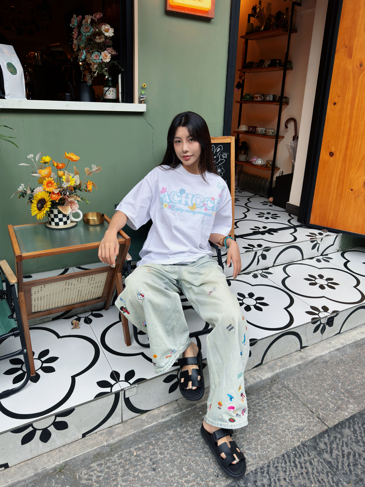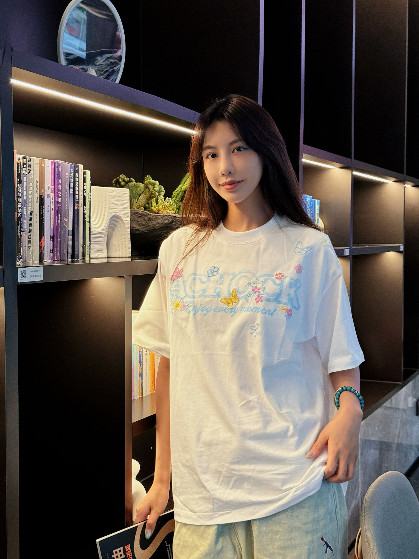 今天也算是抽出一个下午休闲一下 看看书喝喝咖啡吃个三文鱼放题~ 想必高考后你们也是要狠狠放松休息~ 今天这套穿搭就很适合放松休闲! 首先短袖选了一个白色的 真的很干净 前面刺绣是蓝色的加上一些蝴蝶元素点缀 很夏日的感觉~ 裤子是我自己家的mokufleet的 贴画牛仔裤 真的很酷~ 超级好看 最近也是每天都在穿它 好穿休闲~ 搭配了新买的拖鞋 整一身休闲风格 很凉快 舒服 ~ #今日宝藏...
