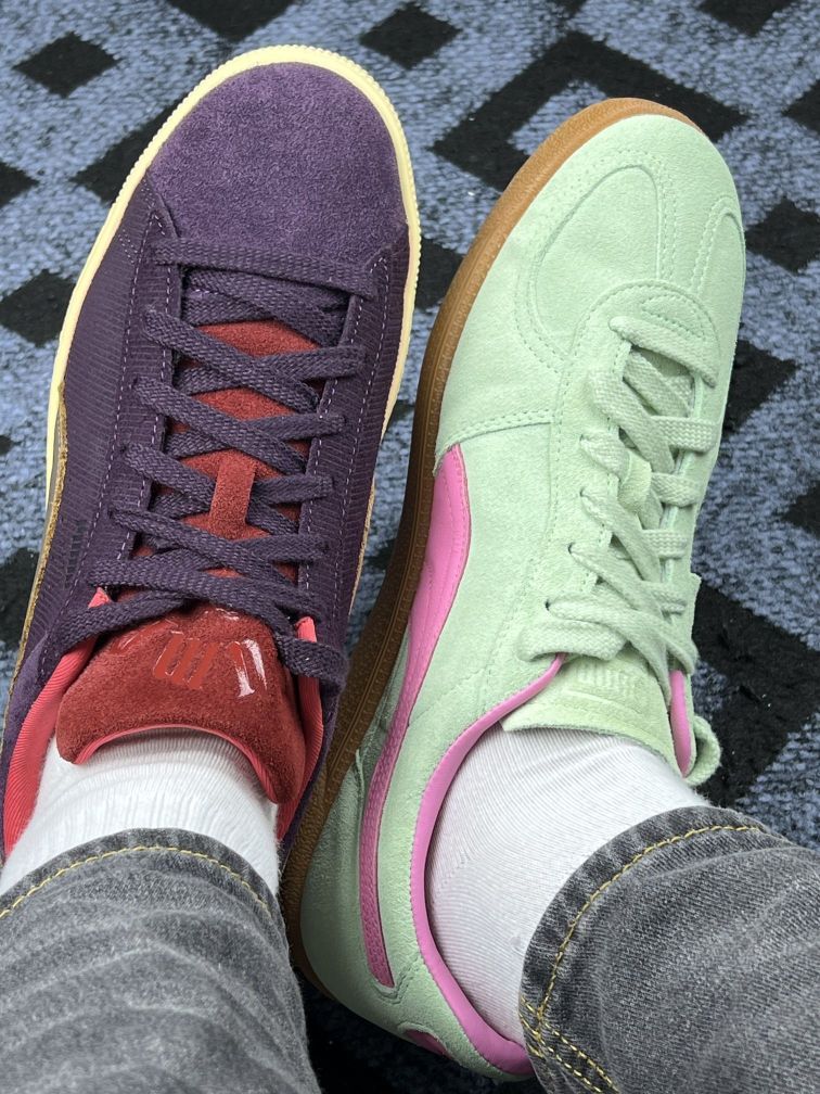 被姐妹按头安利的彪马板鞋,到手直接真香!两双配色乍看“有点怪”,上脚直接锁死💥 真实体验 ✅ 脚感绝了!麂皮+牛皮拼接,软乎乎又有支撑,暴走一下午不累脚~ ✅ 配色越看越爱!紫棕撞银,复古又好看;薄荷绿配粉,清新又炸街,搭啥都出彩! ⚠️ 缺点:麂皮不太耐脏,下雨得躲着走 细节 & 搭配 鞋型是经典德训风,低帮显腿长,尺码很正! - 紫棕款:配黑色工装裤+白T,酷飒街头感拿捏🤏 - 薄...