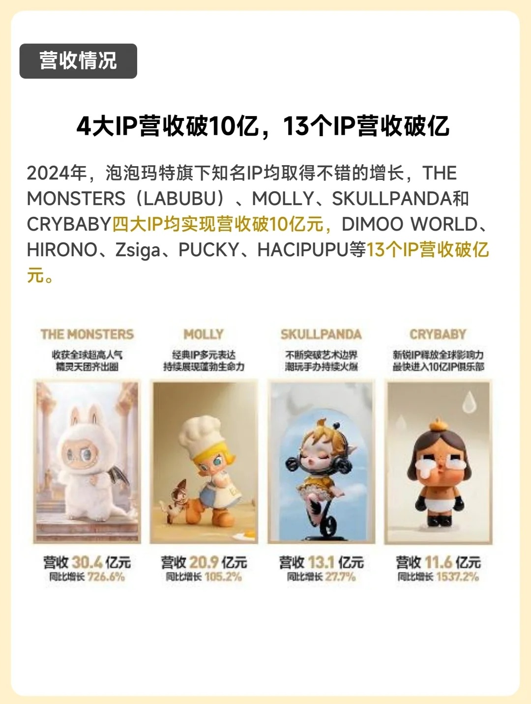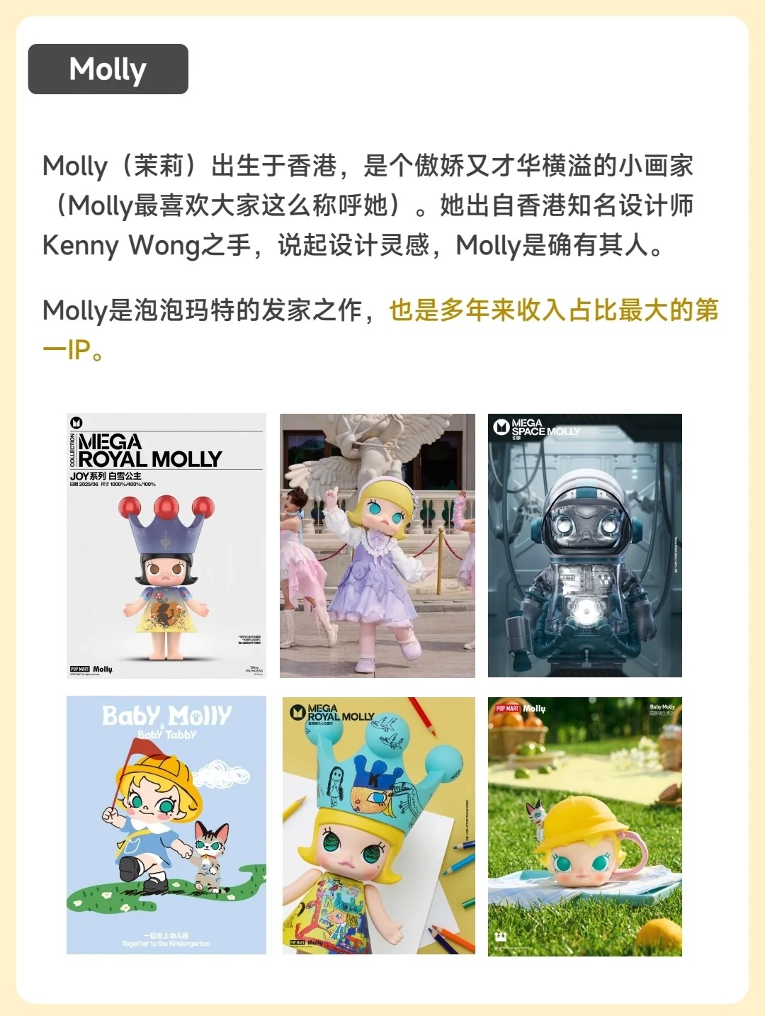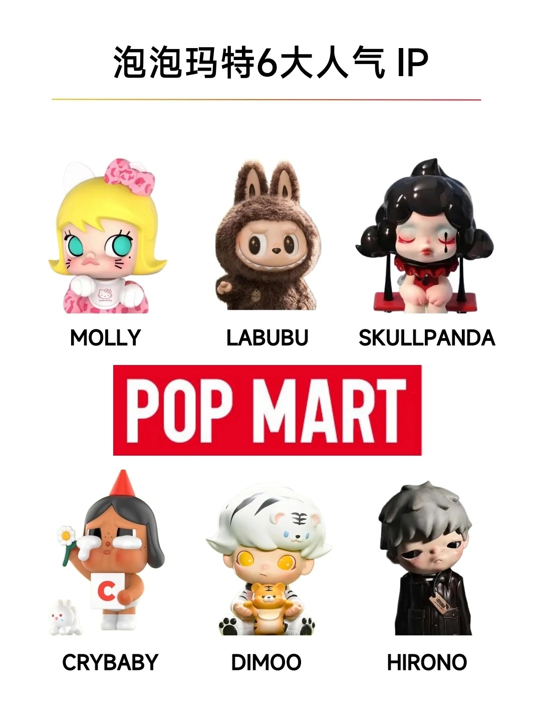 🤗Molly(茉莉) 出生于香港,是个傲娇又才华横溢的小画家。她是泡泡玛特的发家之作,也是多年来收入占比最大的第一IP。 😬THE MONSTERS(精灵天团) 一个虚构的精灵族群,设定背景以北欧神话为灵感,成员生活在神秘森林中。包含多个角色,如Labubu、Zimomo、Tycoco、Spooky等。 🐼SKULLPANDA(骷髅熊猫) 由中国设计师熊喵创作、泡泡玛特旗下的潮流玩具IP,...
