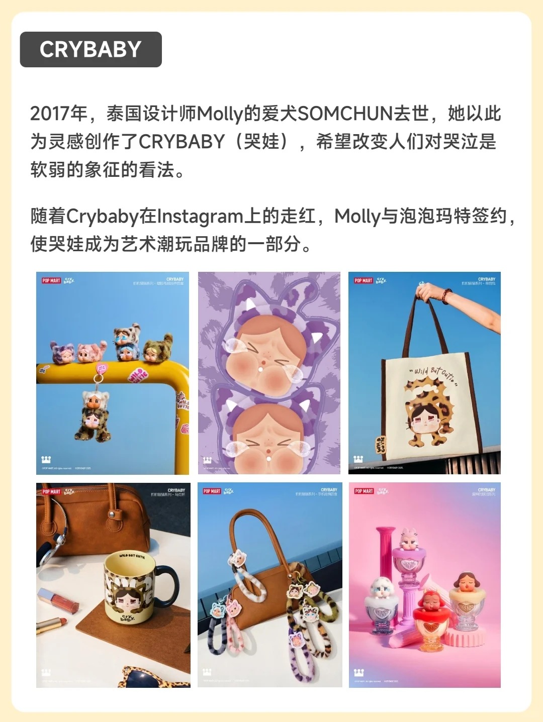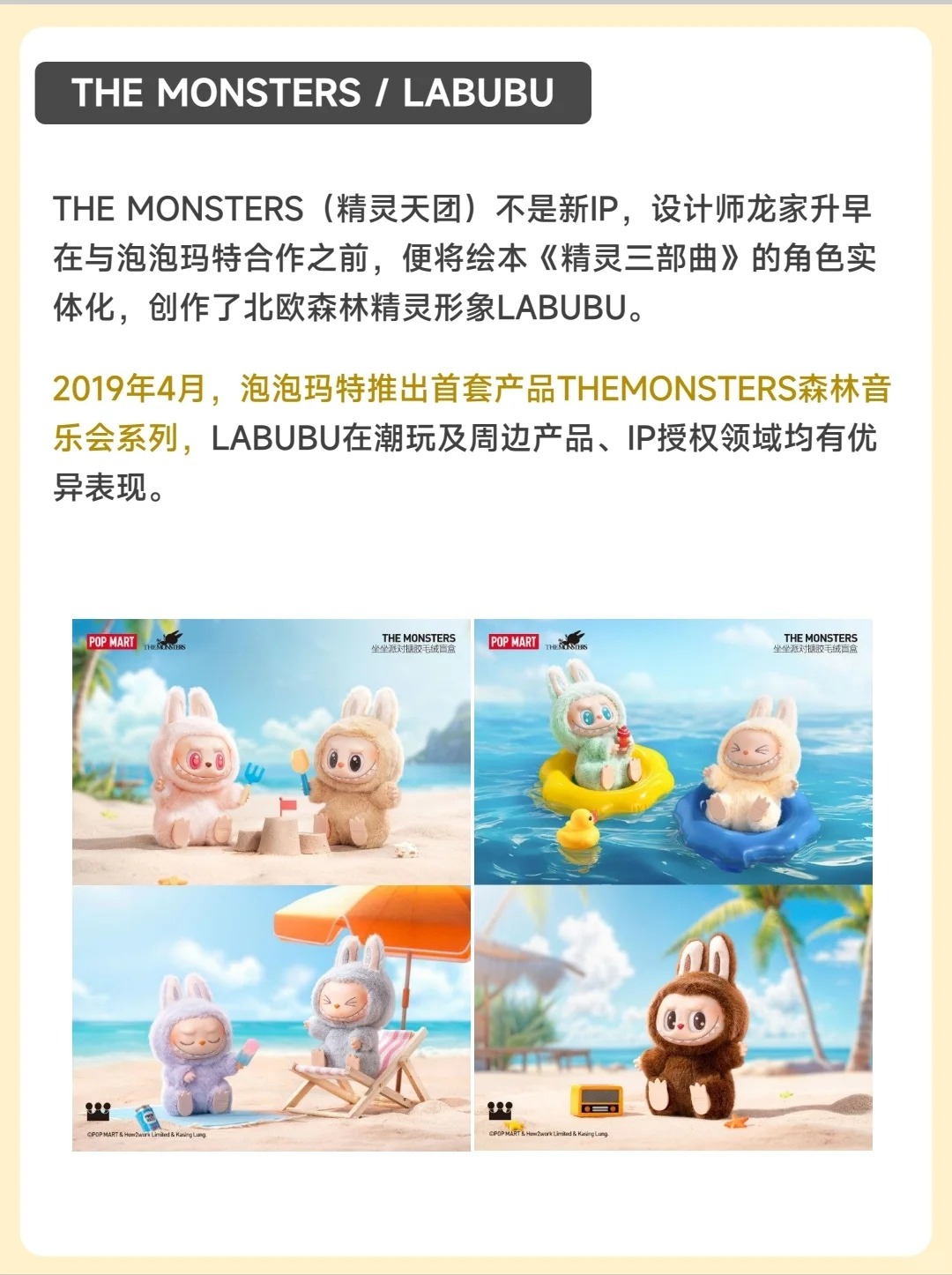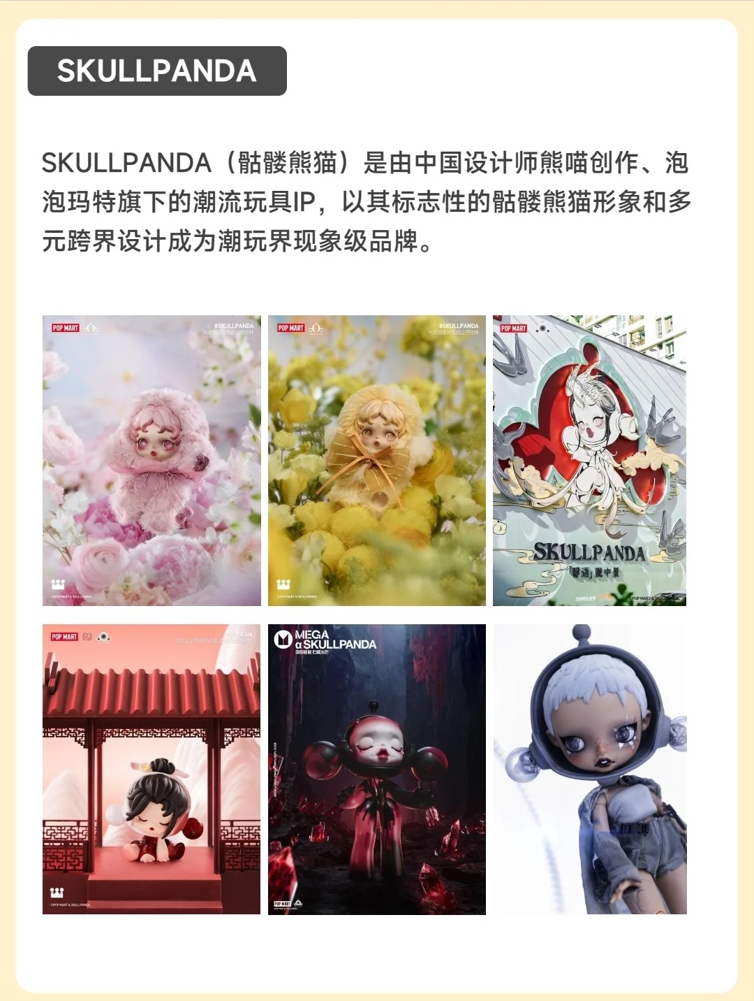 🤗Molly(茉莉) 出生于香港,是个傲娇又才华横溢的小画家。她是泡泡玛特的发家之作,也是多年来收入占比最大的第一IP。 😬THE MONSTERS(精灵天团) 一个虚构的精灵族群,设定背景以北欧神话为灵感,成员生活在神秘森林中。包含多个角色,如Labubu、Zimomo、Tycoco、Spooky等。 🐼SKULLPANDA(骷髅熊猫) 由中国设计师熊喵创作、泡泡玛特旗下的潮流玩具IP,...