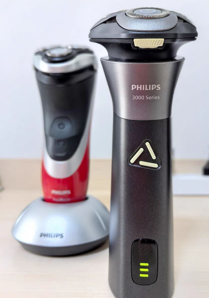 飞利浦剃须刀,三刀头贴合脸部轮廓,来回剃几下就把胡茬清理得干干净净,亲肤模式真的很温和,老爸说以前刮完脸会泛红,现在完全不会。 机身设计很有科技感,还送了便携收纳盒和牛仔帽,实用又贴心。