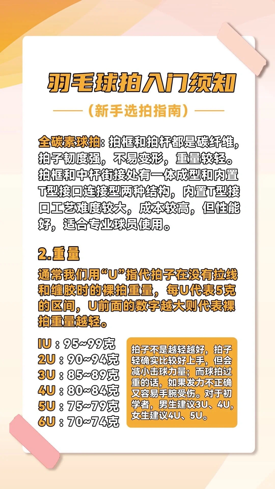 ✅新手如何选择适合自己的羽毛球拍: 1️⃣重量: • 通常选择 4U(80-84.9 克)或 5U(75-79.9 克)的球拍,可减少手臂负担,利于快速挥拍。 • 考虑自身力量,力量较弱者可选择更轻的球拍。 2️⃣平衡点: • 新手宜选择平衡点在 285-295 毫米之间的球拍,提供较好的操控性和稳定性。 • 进攻型选手可稍偏向头重,防守型则可选择头轻的球拍。 3️⃣中杆硬度: • 中杆偏软(...