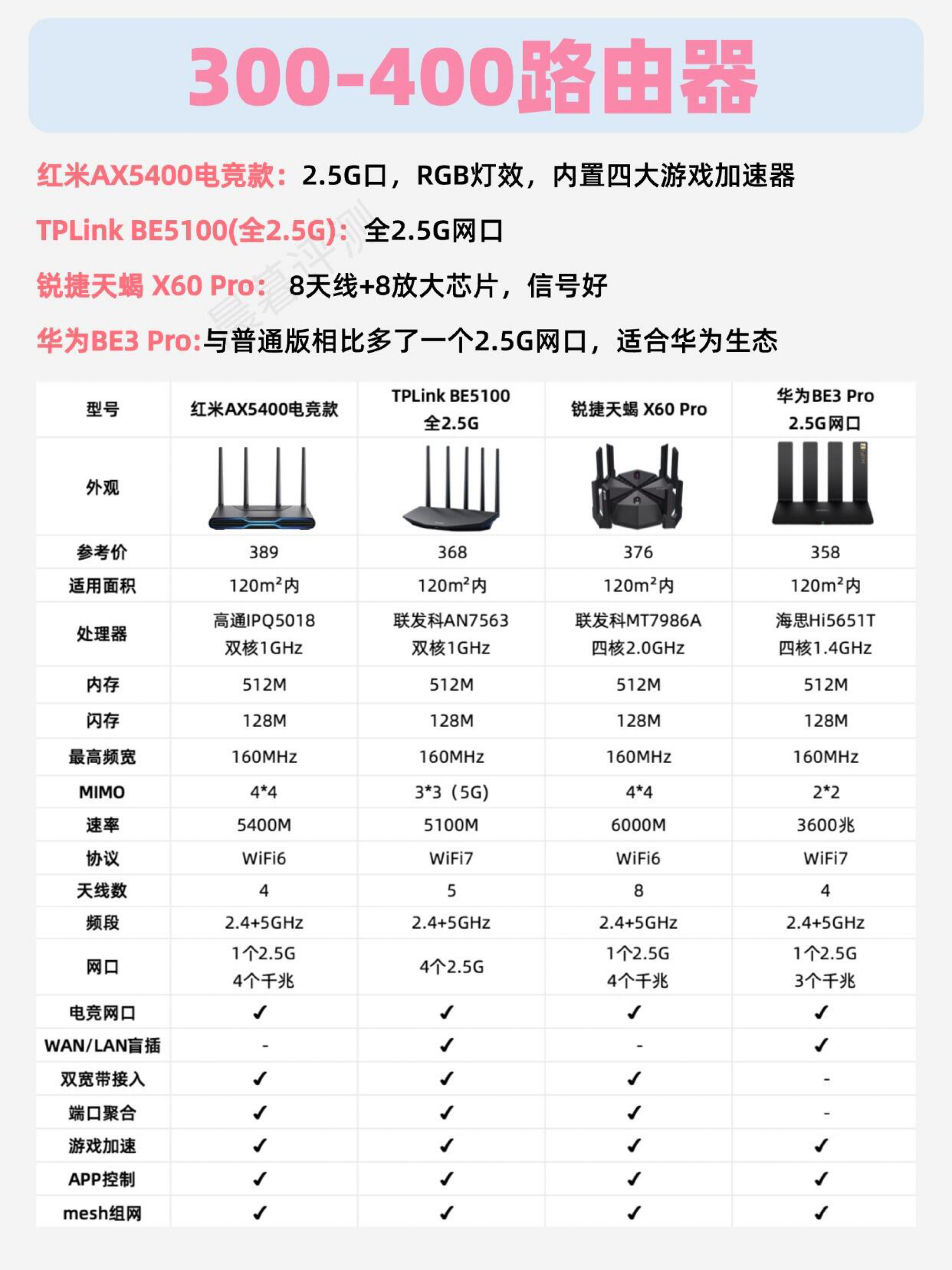 大家过年回家,如果发现网速不太好,不一定是网络问题,很可能是路由器太老了,今天给大家整理一期各价位高性价比路由器推荐!非常详细! 一、选购参数 1.WiFi7目前提升有限,低预算选择WiFi6协议,性价比更高。但战未来还是选WIFI7 - 2.频段 主要有2.4GHz和5GHz两个选择,最好是关闭双频合一的功能,让智能家居设备连接2.4Ghz。 - 3.处理器、内存、闪存 处理器性能强,内存容量大...