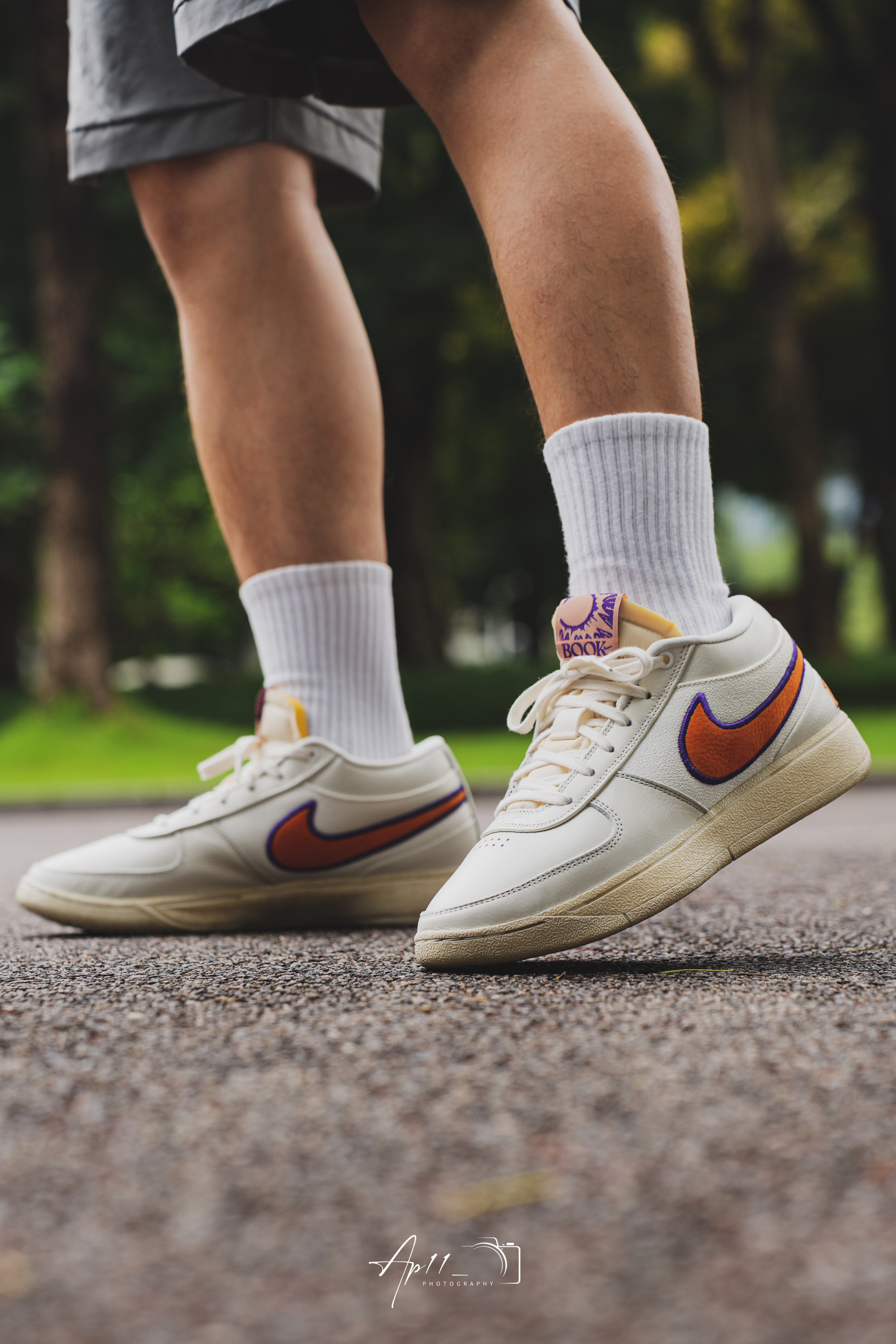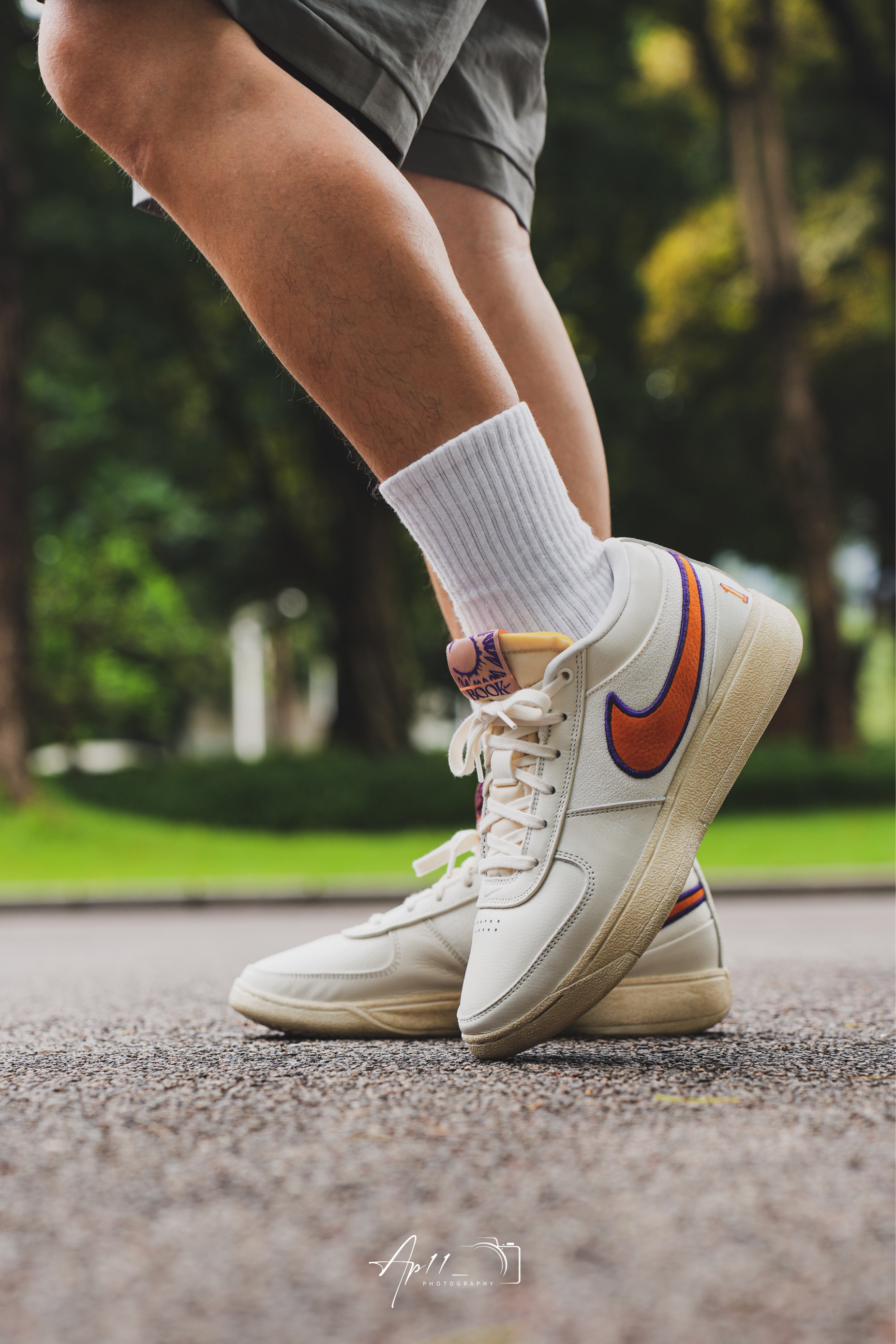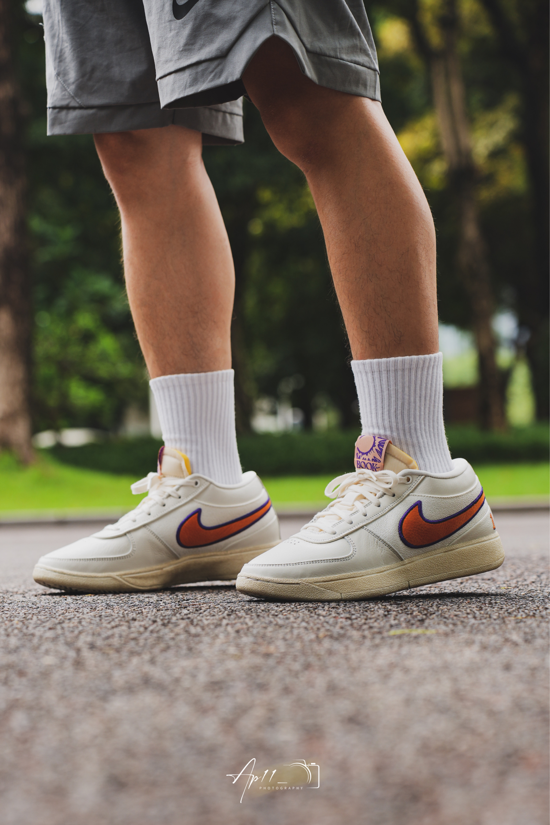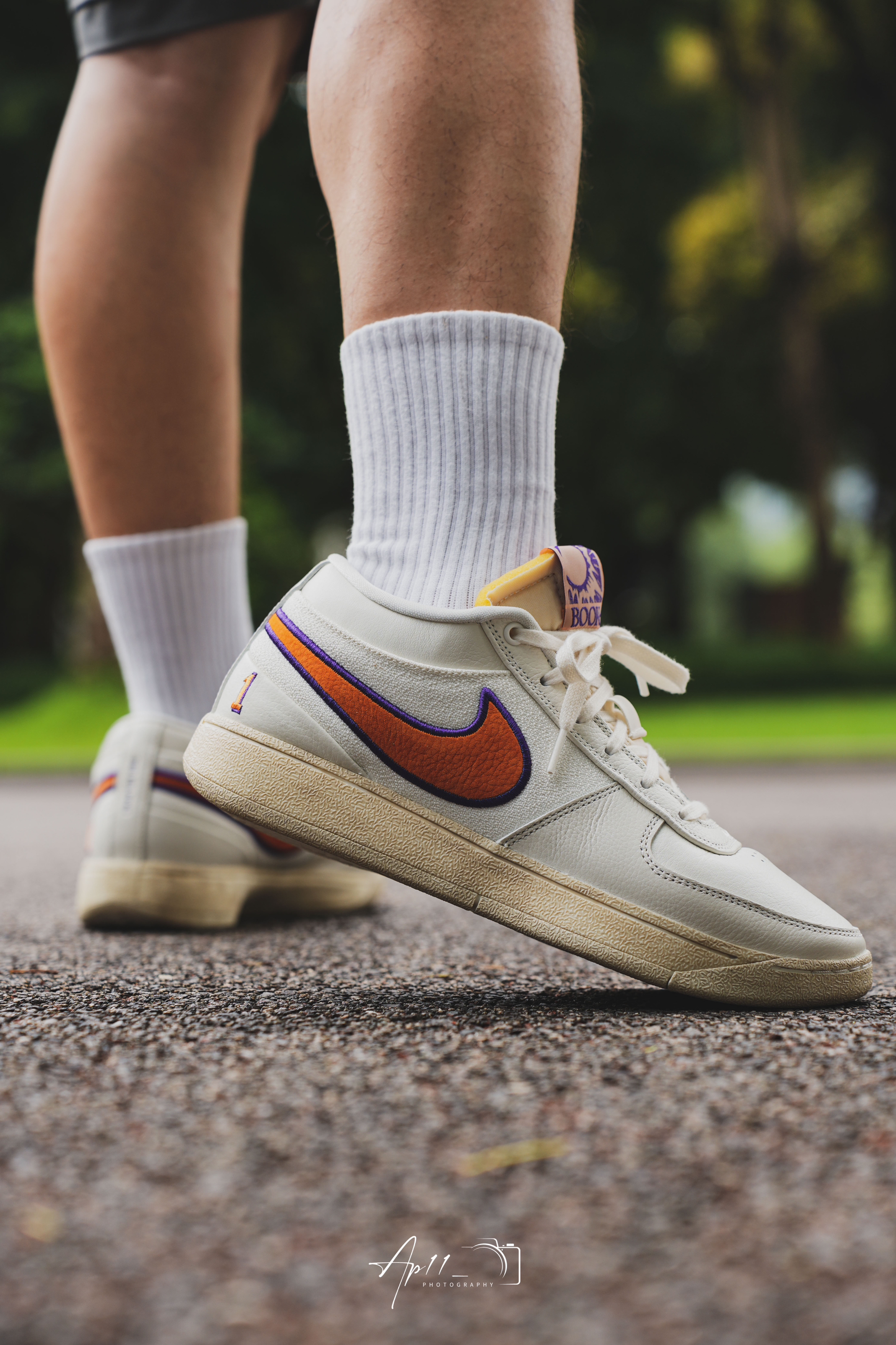 今天给大家带来的这款布克一代的上脚分享,配色其实是向 PHX 地区致敬,以帆白为主色调,同时注入凤凰城太阳队紫色和橙色色调,做旧外底的外底设计我觉得还是蛮特别的,彰显 Nike 的复古美学。