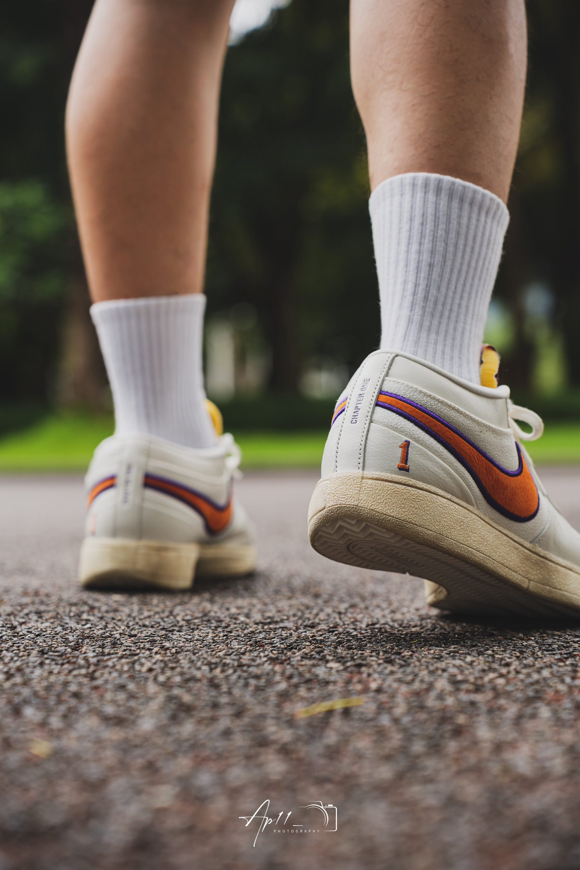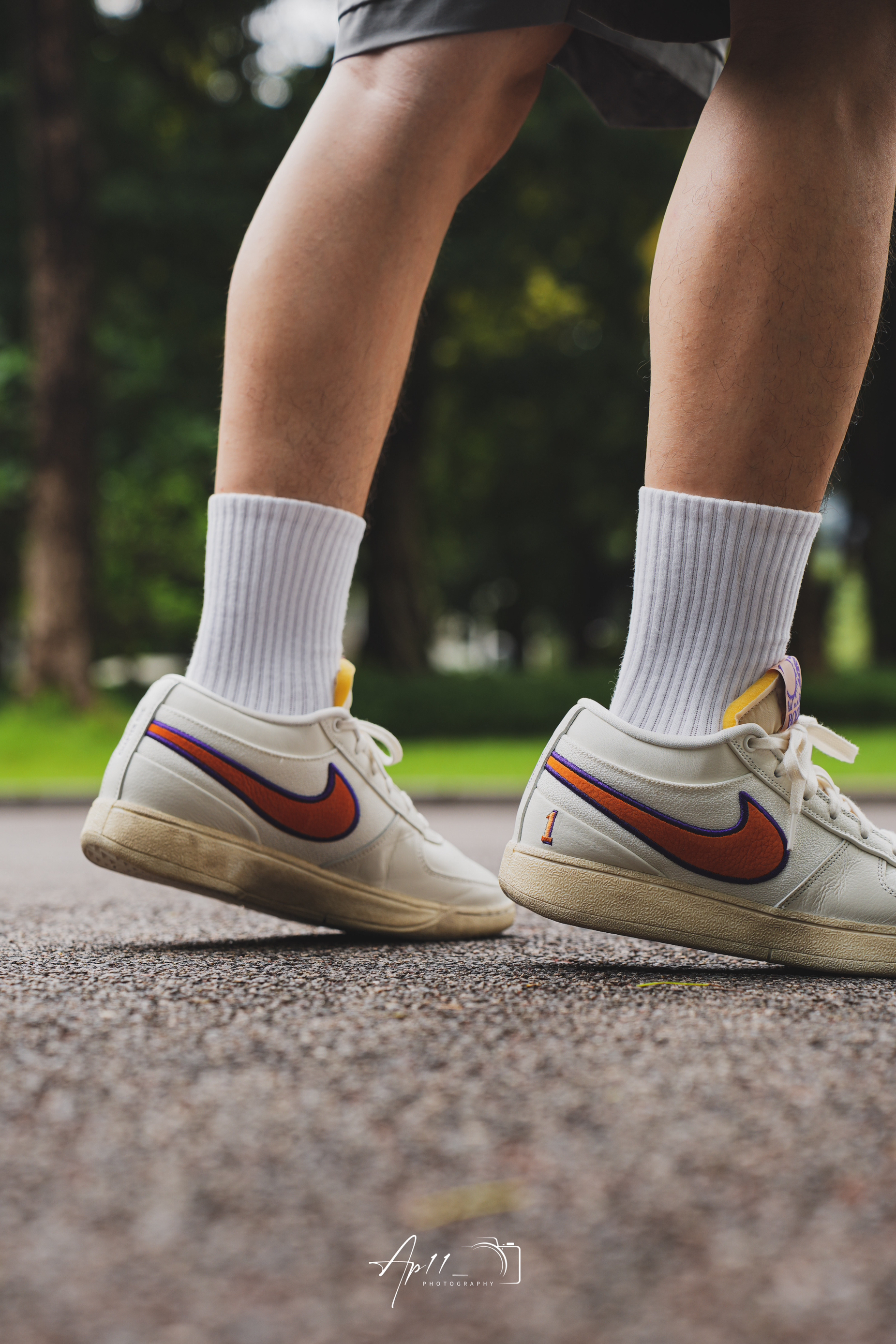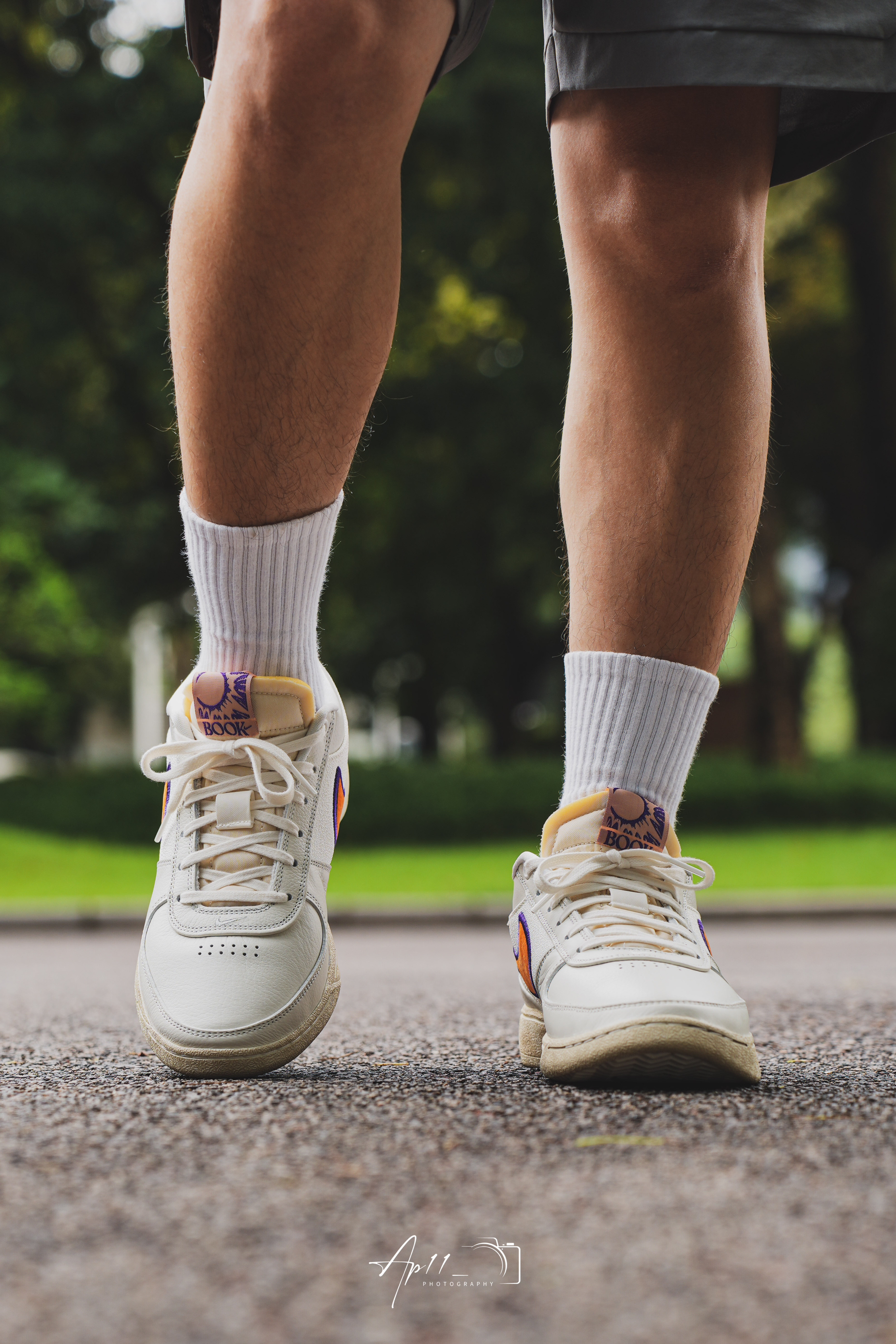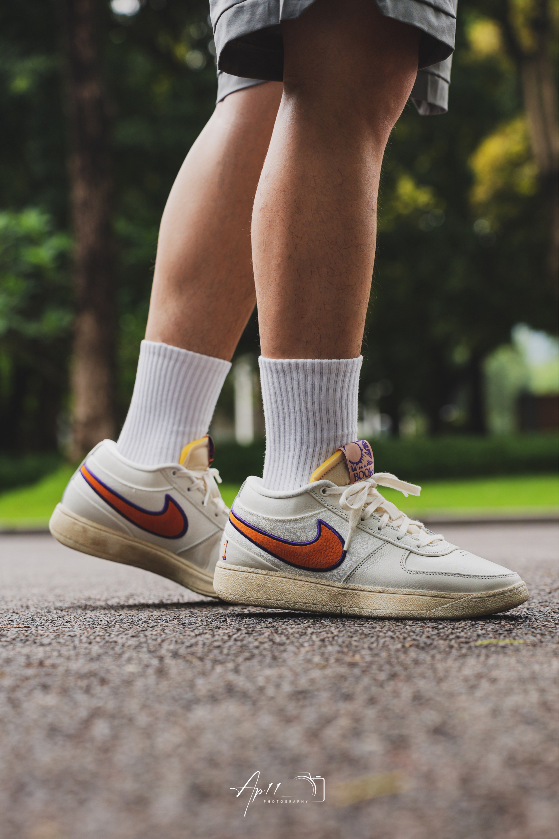 今天给大家带来的这款布克一代的上脚分享,配色其实是向 PHX 地区致敬,以帆白为主色调,同时注入凤凰城太阳队紫色和橙色色调,做旧外底的外底设计我觉得还是蛮特别的,彰显 Nike 的复古美学。