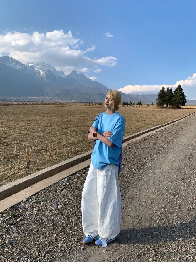 被问爆的旅行穿搭来啦💙 蓝天白云下,一件清透感天蓝短袖,配上阔到能兜住风的白裤子,慵懒又随性~ 背上格纹布袋,连阳光都变得温柔,和远处的山川田野适配度100%🌄 这套主打一个“人在画中游”,走在路上像把自由和惬意穿在了身上,随手一拍都是电影感大片🎬 #旅行穿搭 #松弛感穿搭 #治愈系穿搭 #日常出片