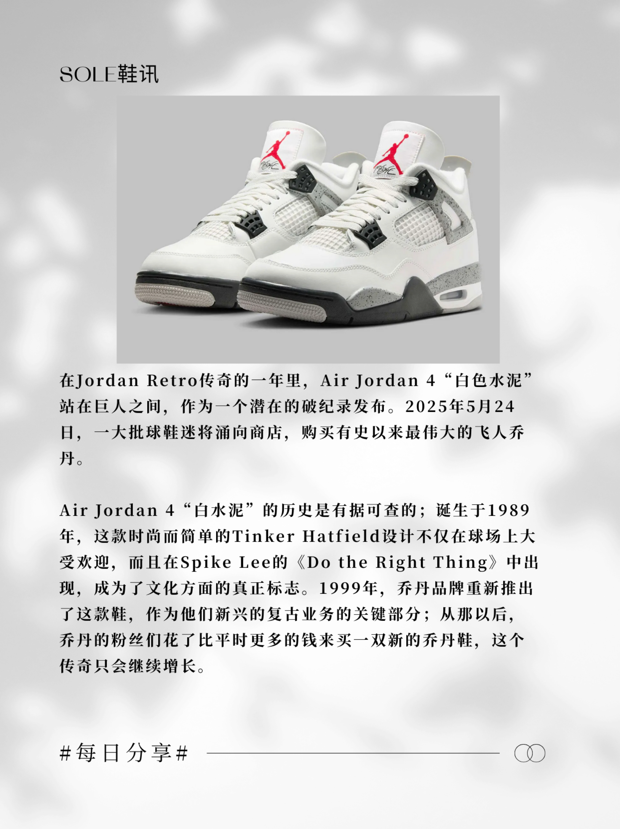 #AJ4天花板 #白水泥复刻 #球鞋理财必入 全体鞋头注意!史上最传奇AJ4要杀回来了! Air Jordan 4 "White Cement"2025终极复刻版 5.24全球发售 但现在就要开始备战了!🔥 🏆 封神履历 ✅ 1989年元祖设计:Tinker Hatfield封神之作 ✅ Spike Lee电影同款:《Do the Right Thing》文化符号 ✅ 16年溢价神话:2...