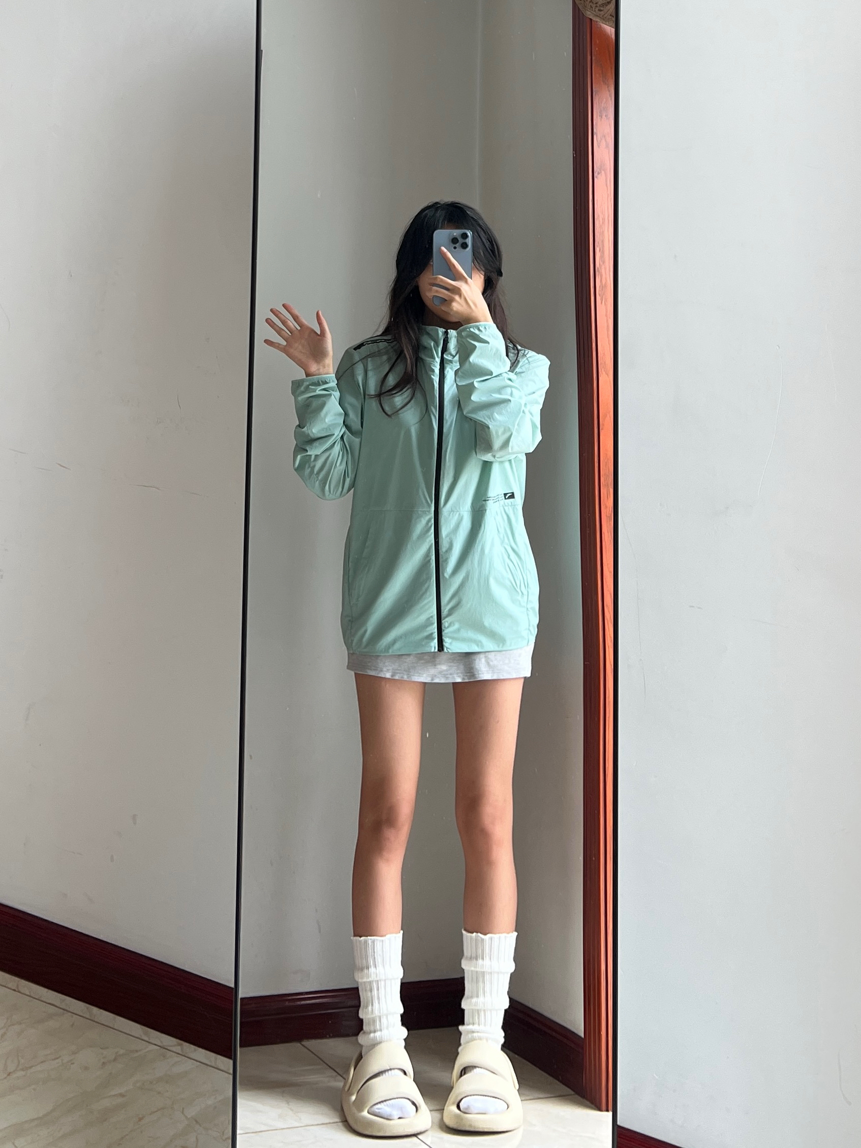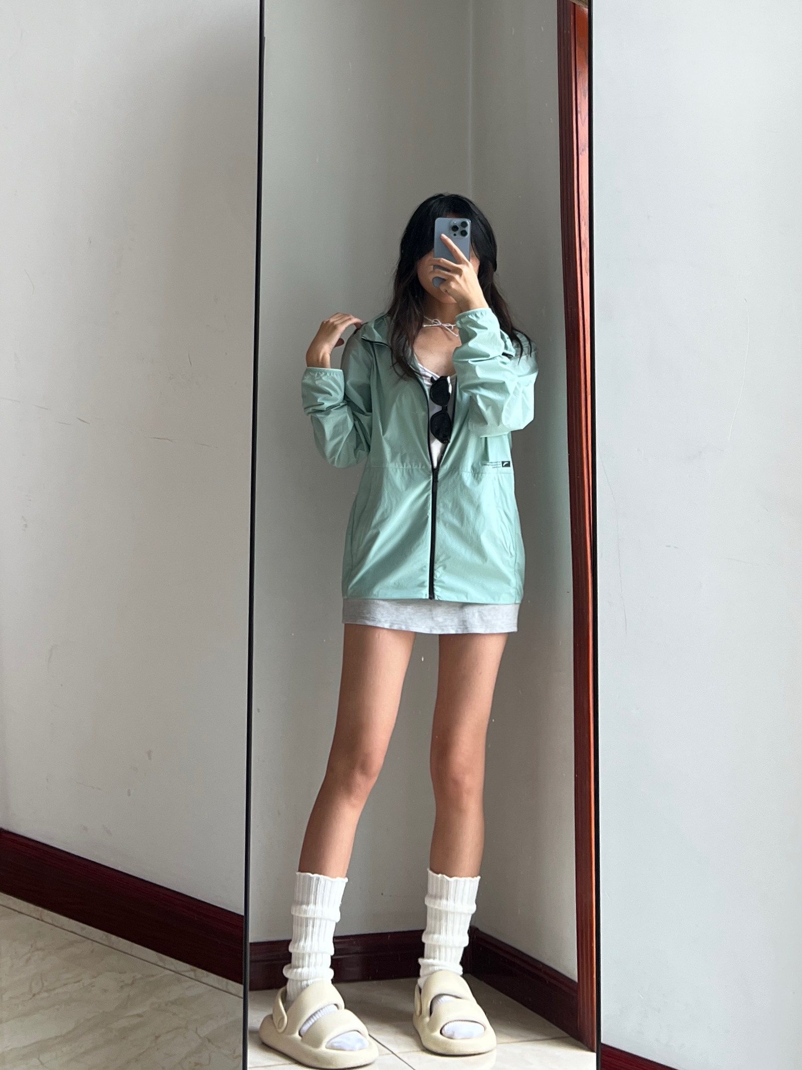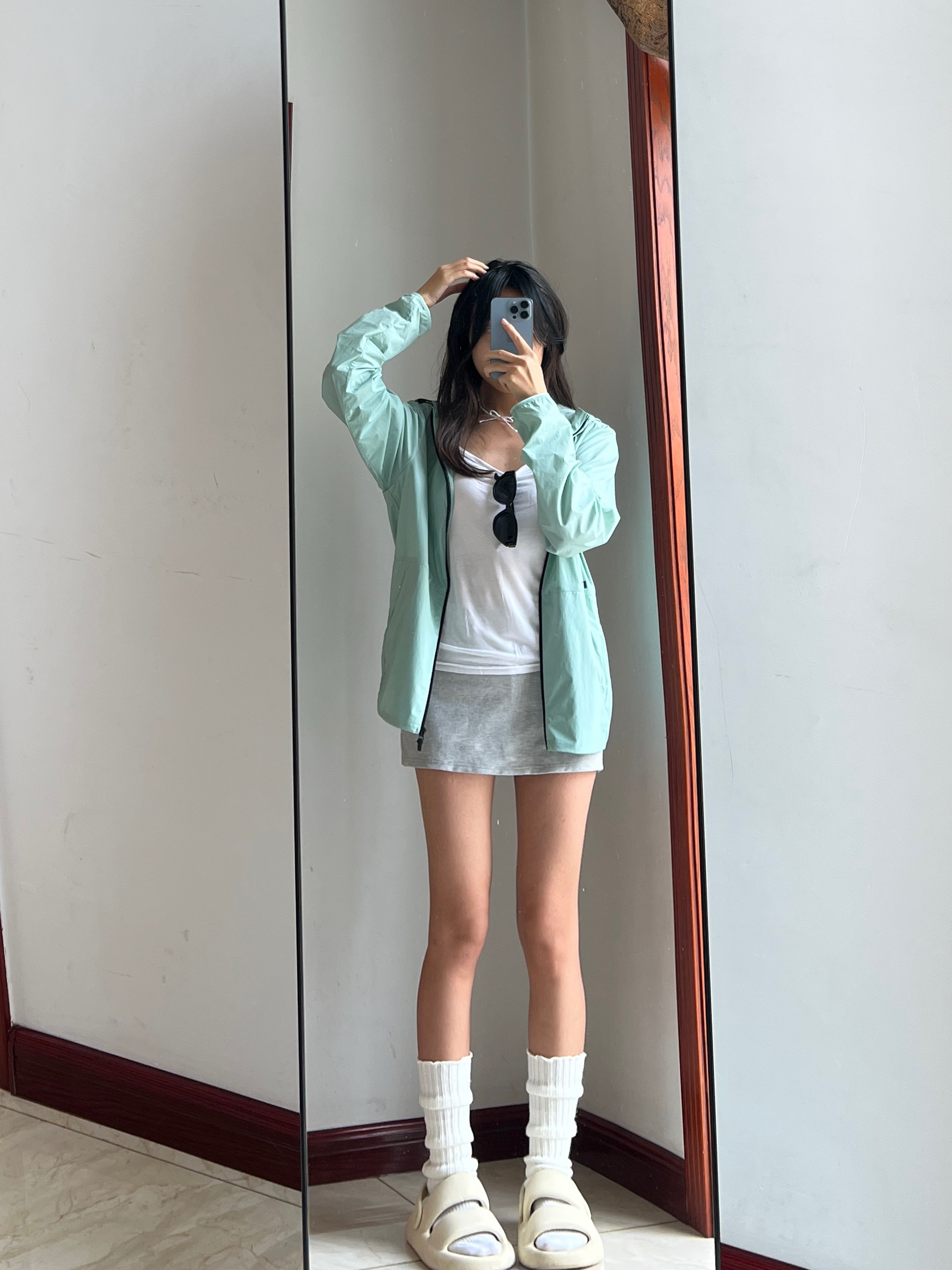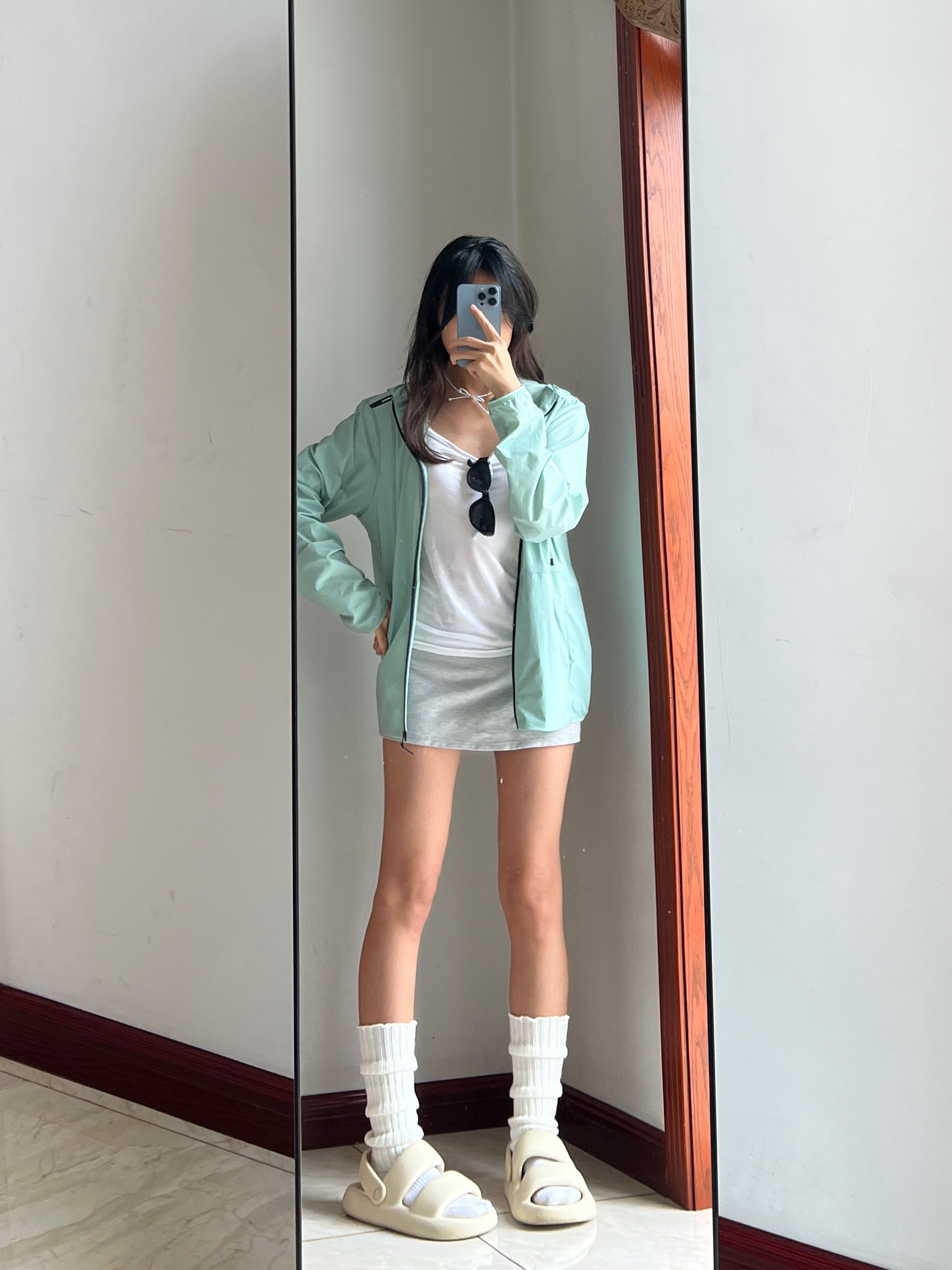 背心搭配绿色防晒外套好韩~ 下面搭了一个灰色的运动短裙 百搭不出错
