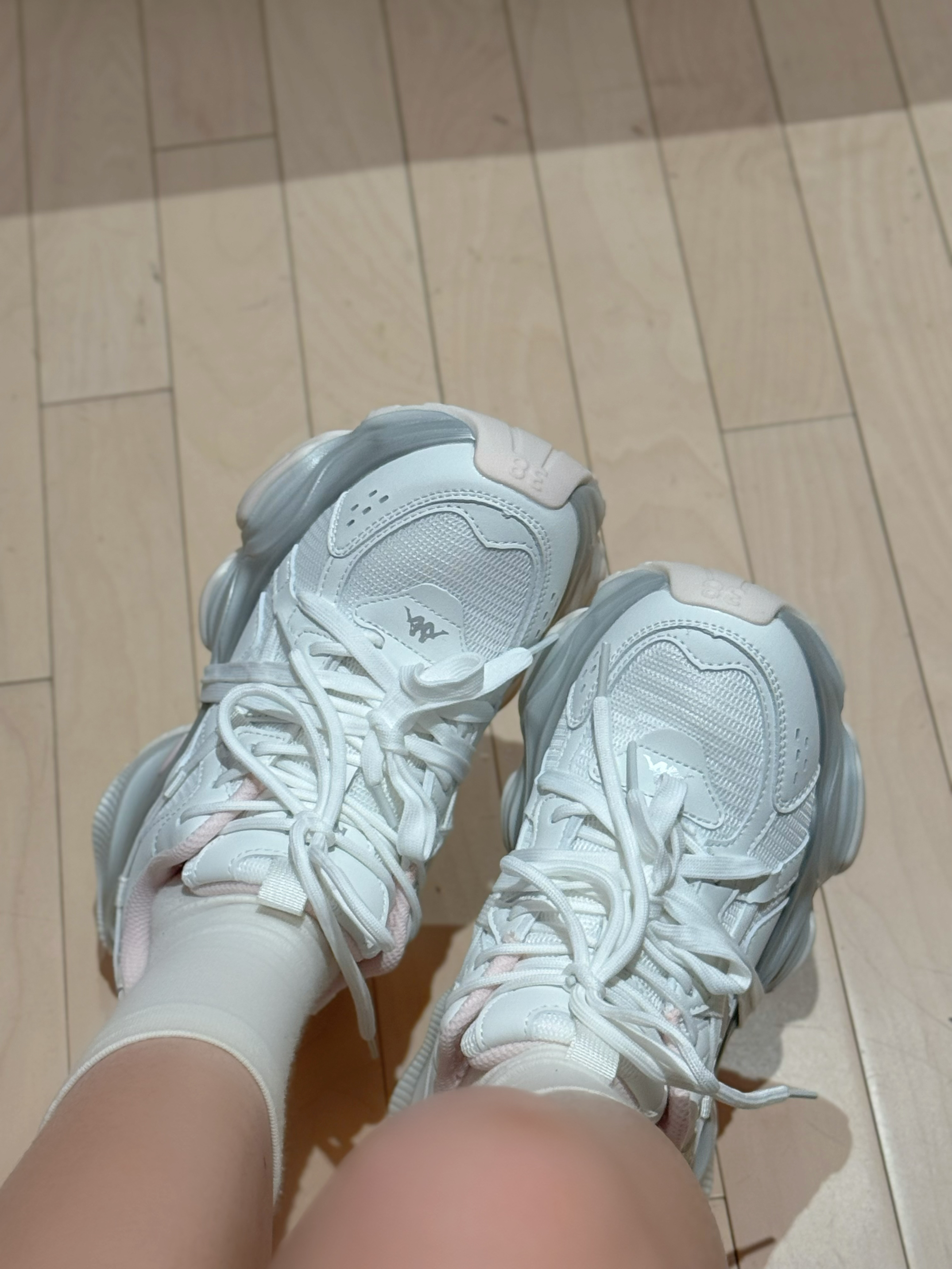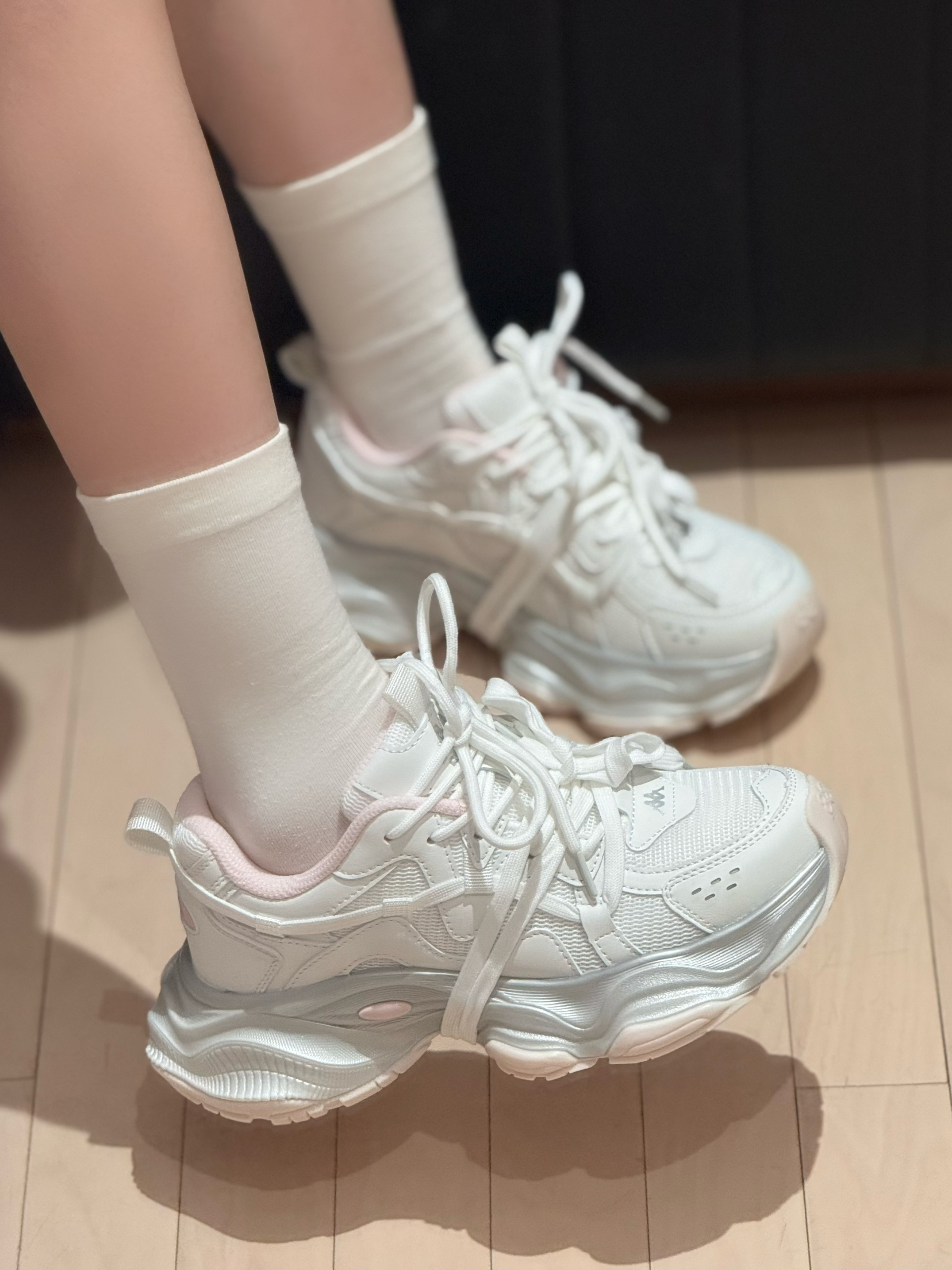 今日穿搭浅粉套装➕老爹鞋 👟是Kappa🏠的 上脚脚感太舒服啦~ 鞋身没感觉多重 走路又快又稳 薄网透气😌夏天穿也不怕闷脚 日常搭配裙子或者休闲裤都很好搭配呢 还有厚底6cm↔️的增高效果哦 码数正码!