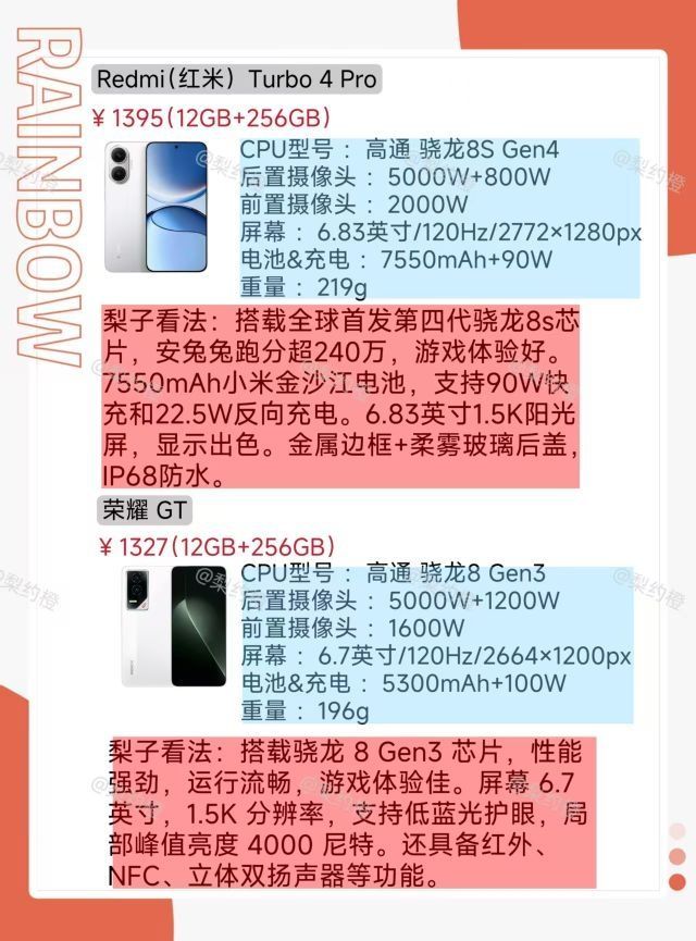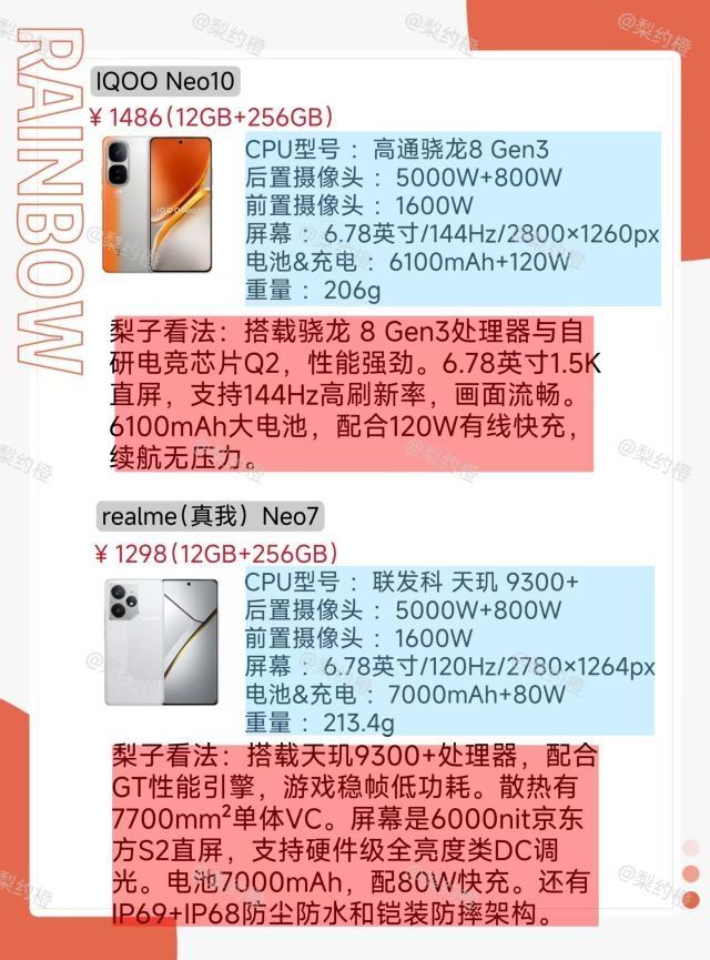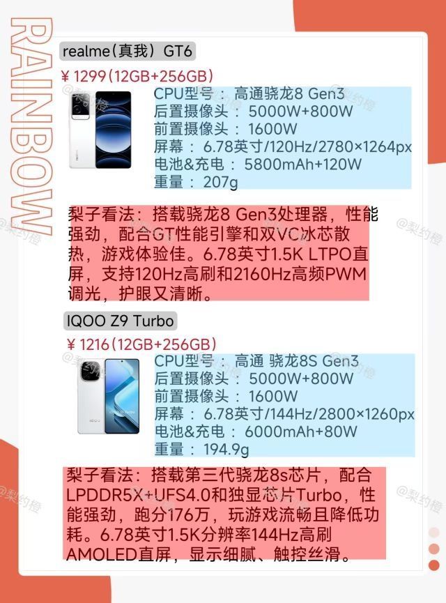 想花1500以内挑手机,骁龙8Gen3和天玑9300+芯片机型闭眼入!骁龙8Gen3就像经验丰富的赛道老手,日常使用和游戏场景平衡出色,GPU性能强,运行《王者荣耀》帧率稳定。中低负载功耗低,续航不错,AI调度和网络技术也更胜一筹。 天玑9300+如同超强动力车,多核性能优,多任务处理游刃有余,本地AI处理快,还支持高刷新率屏幕,视觉体验流畅,价格更亲民。现在部分机型补贴后能控制在预算内,别错过...