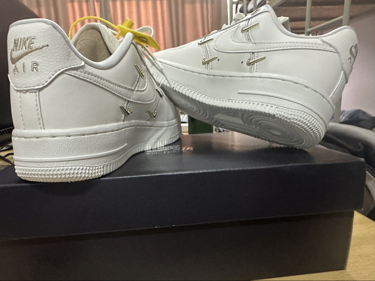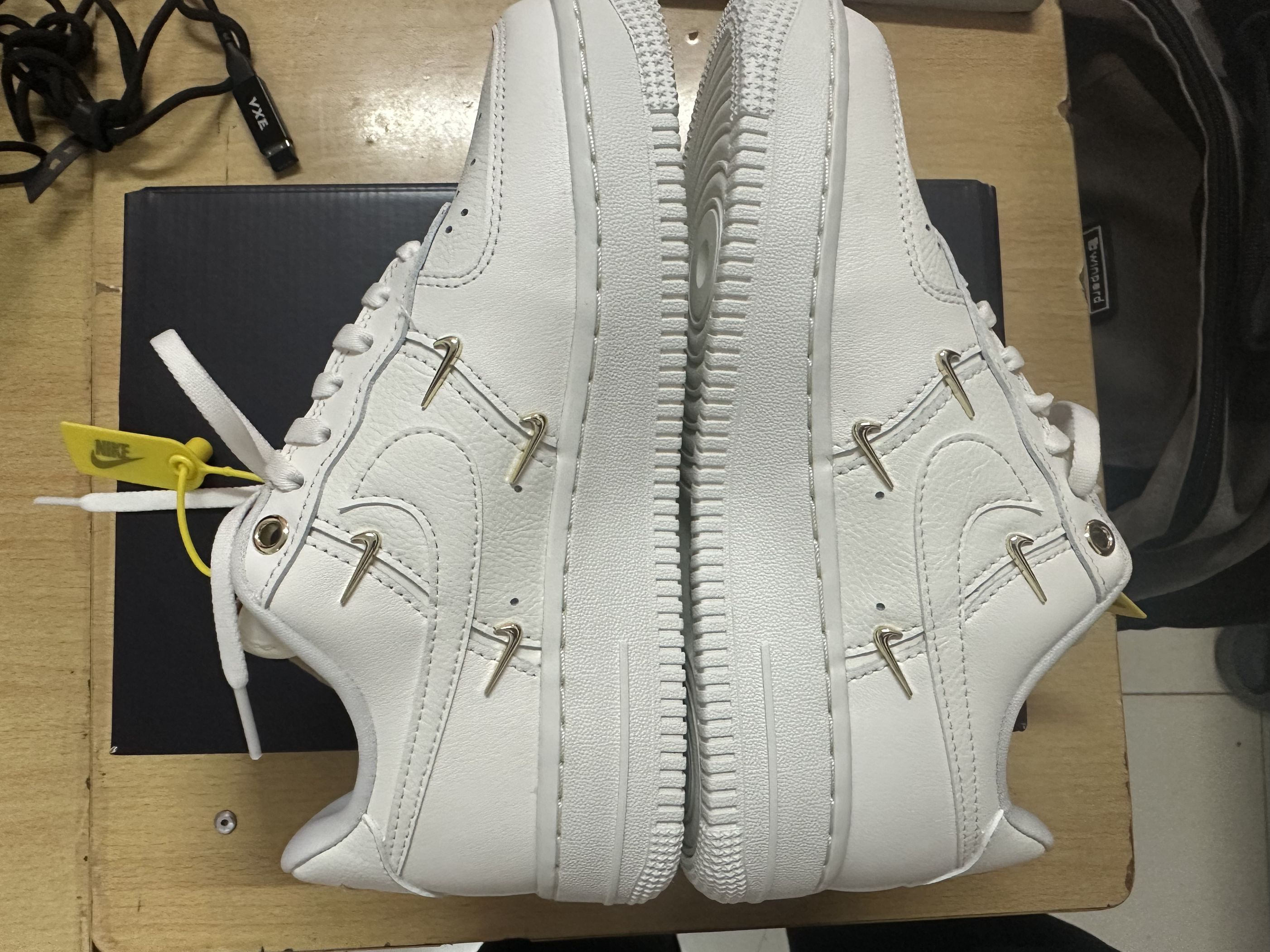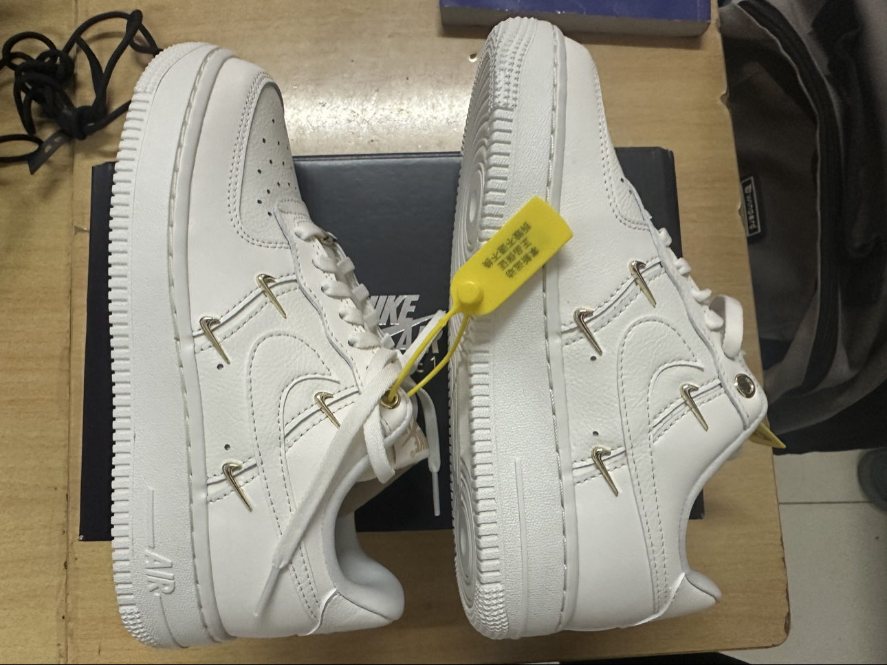 先来说说优点:1鞋面以米白色荔枝皮为主,搭配金色金属钩形饰件、鞋带扣及后跟点缀,打破极简风格,营造出复古与潮奢结合的视觉层次感。金色元素在光线下更显精致,适合追求个性的穿搭场景。2采用荔枝皮与人造皮革拼接,鞋面柔软且耐磨,日常穿着不易刮花。鞋底气垫设计提供约 3cm 的增高效果,同时缓震性能良好,适合长时间行走或轻度运动。3延续 AF1 低帮板鞋的标志性轮廓,可轻松搭配牛仔裤、短裤或裙装,适配甜酷...