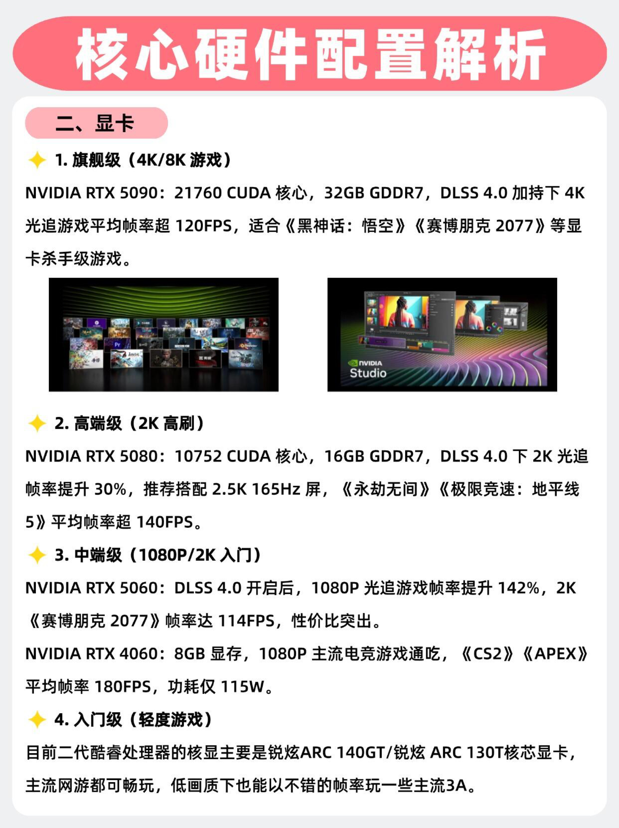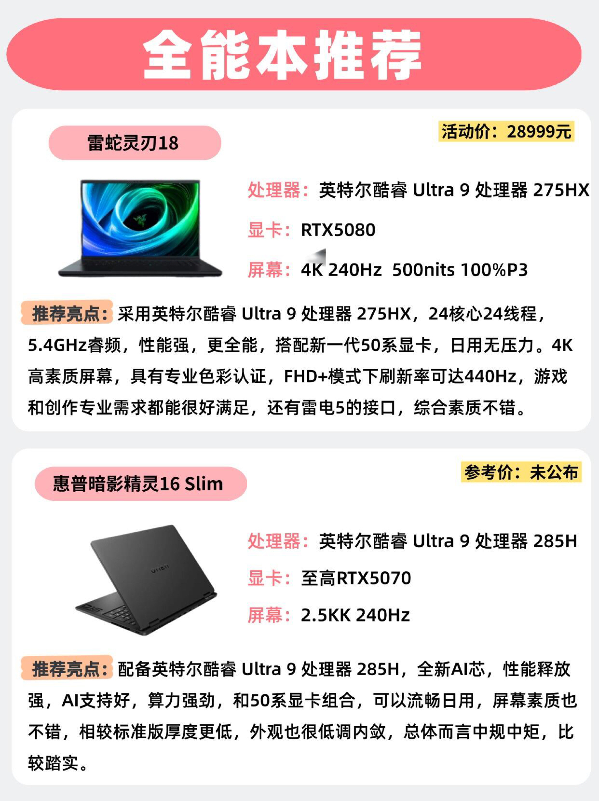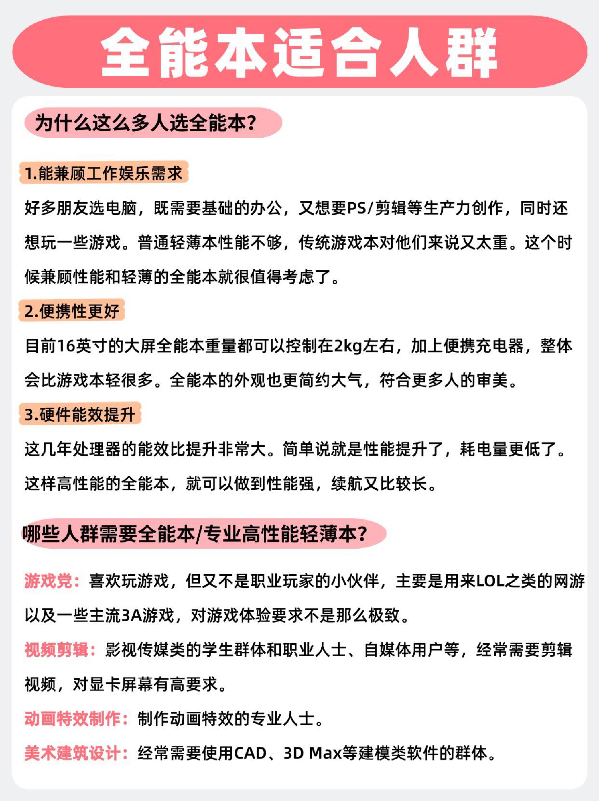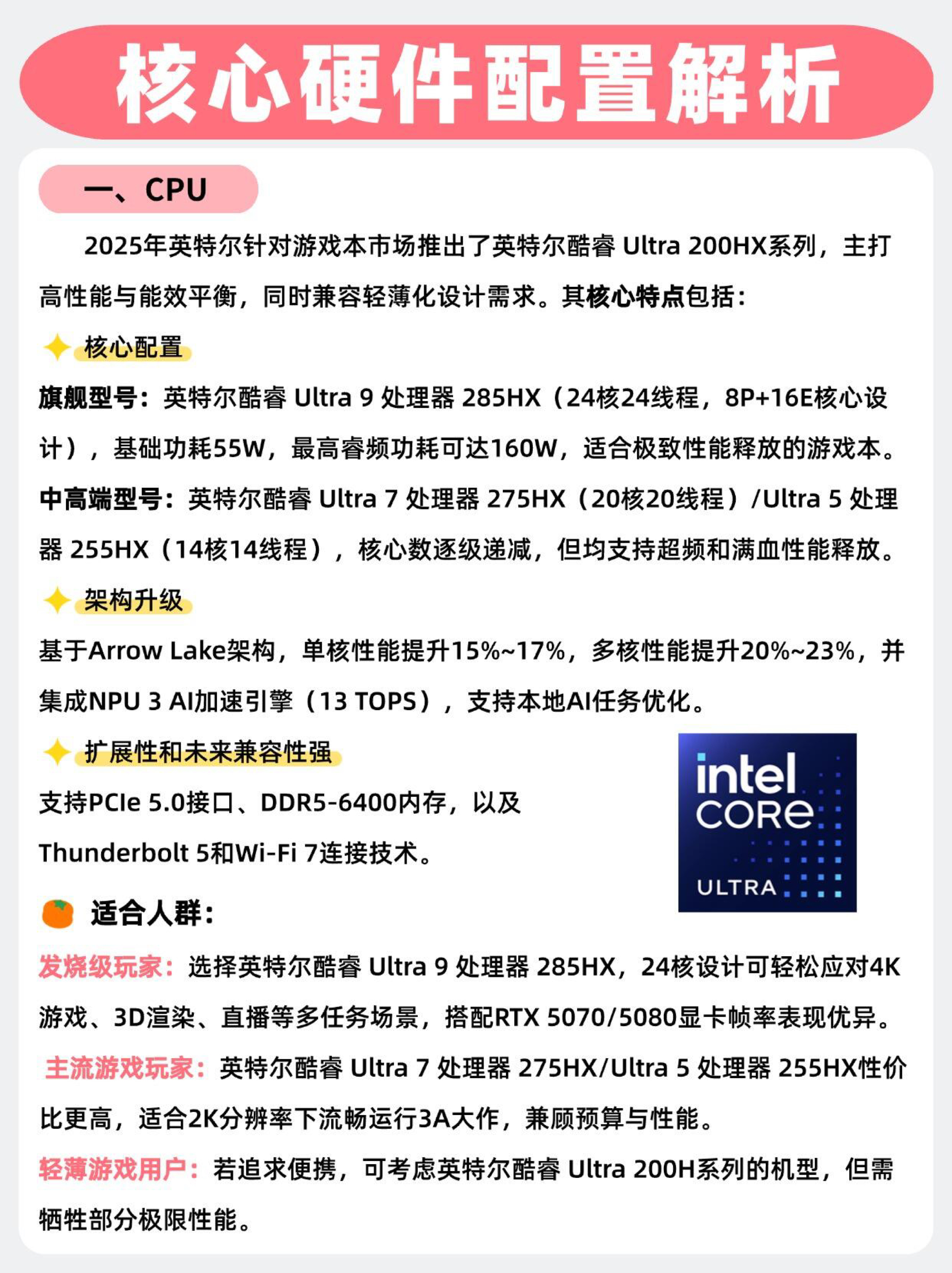 一、为什么这么多人选全能本? 能兼顾工作娱乐需求 与游戏本相比便携性更好 新硬件能效提升 ~ 二、哪些人群需要全能本/专业高性能轻薄本? 游戏党+视频剪辑+动画特效制作+美术建筑设计 ~ 三、核心硬件配置解析 CPU 2025年英特尔针对游戏本市场推出了英特尔酷睿Ultra 200HX系列,主打高性能与能效平衡,同时兼容轻薄化设计需求,它采用了Arrow Lake架构,单核性能提升15%~17%,...