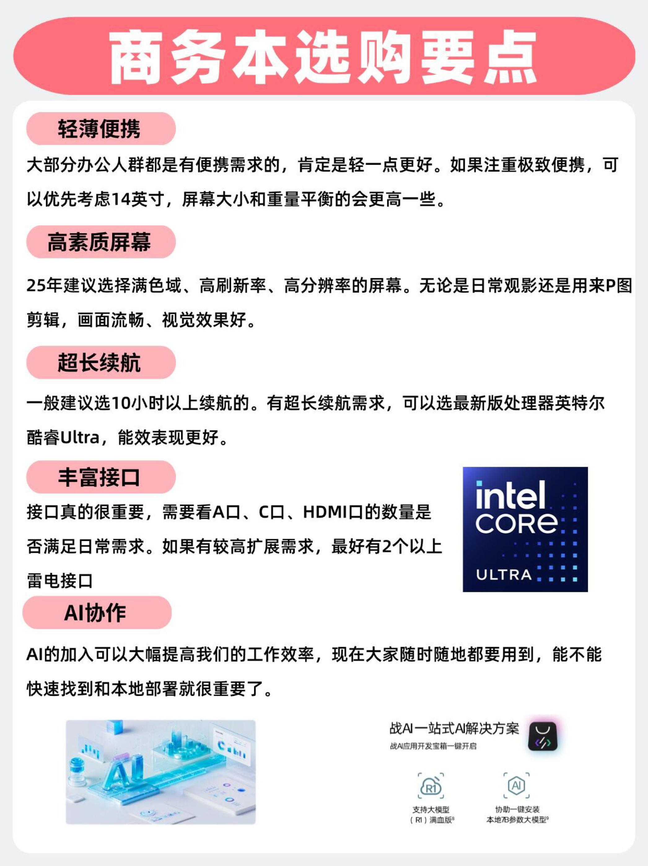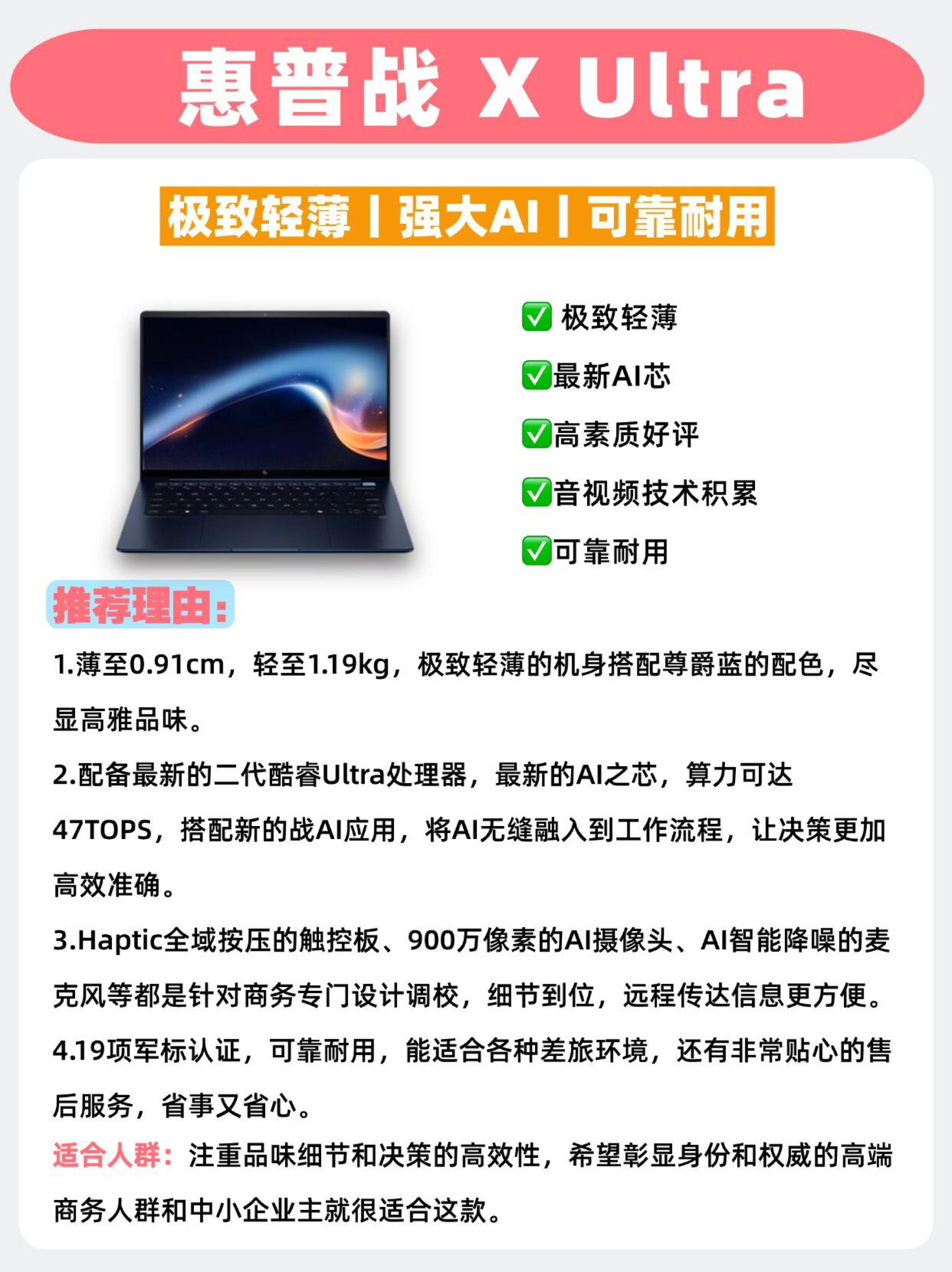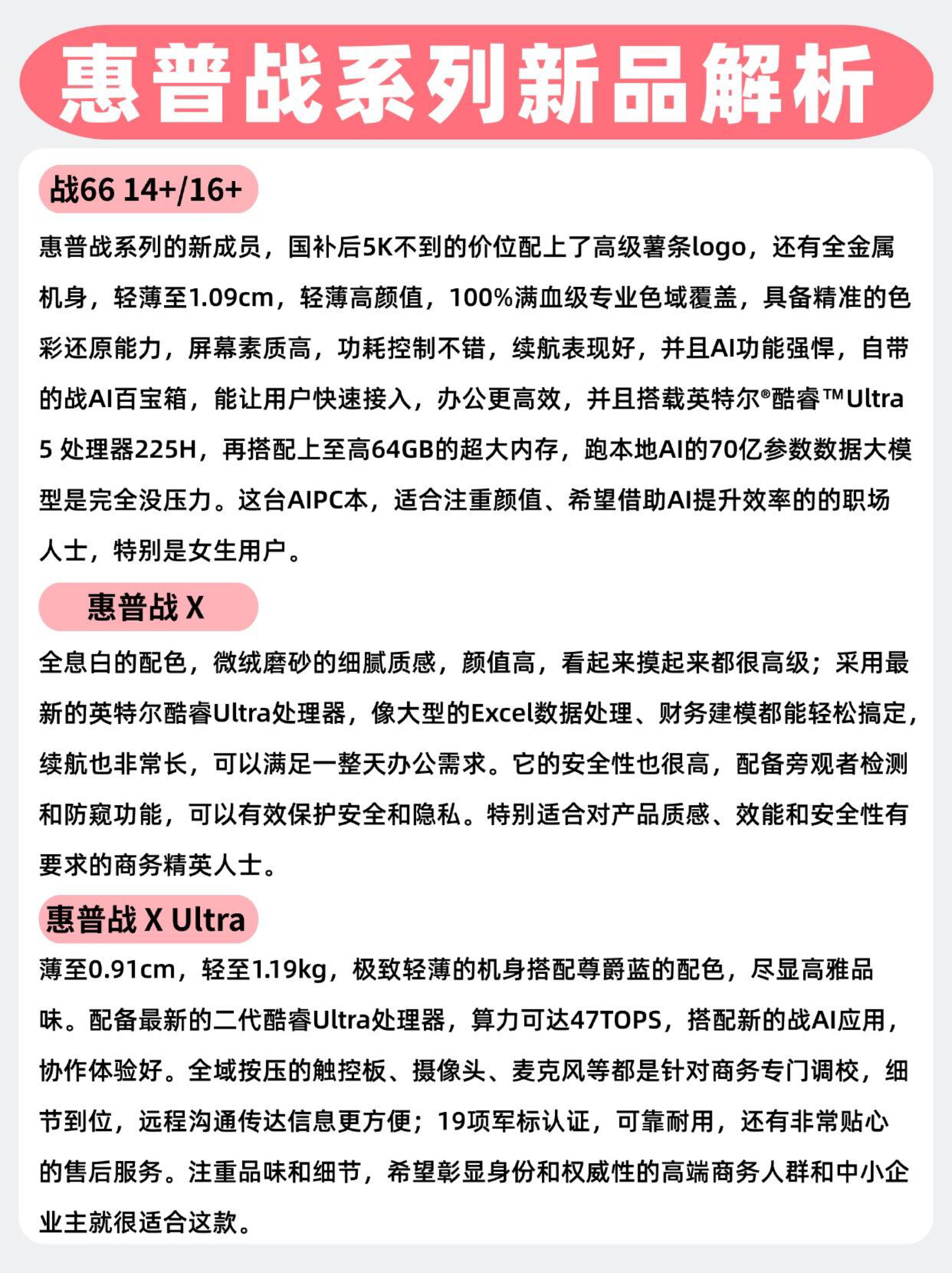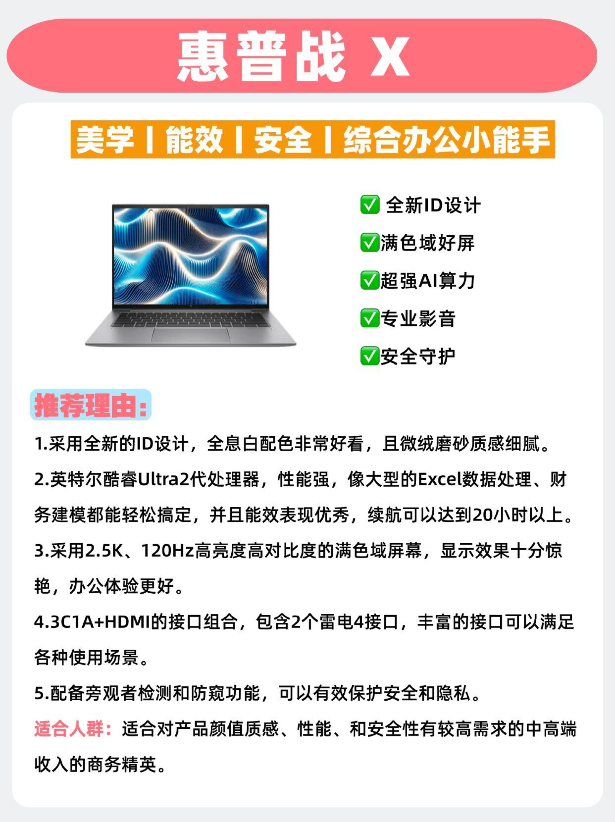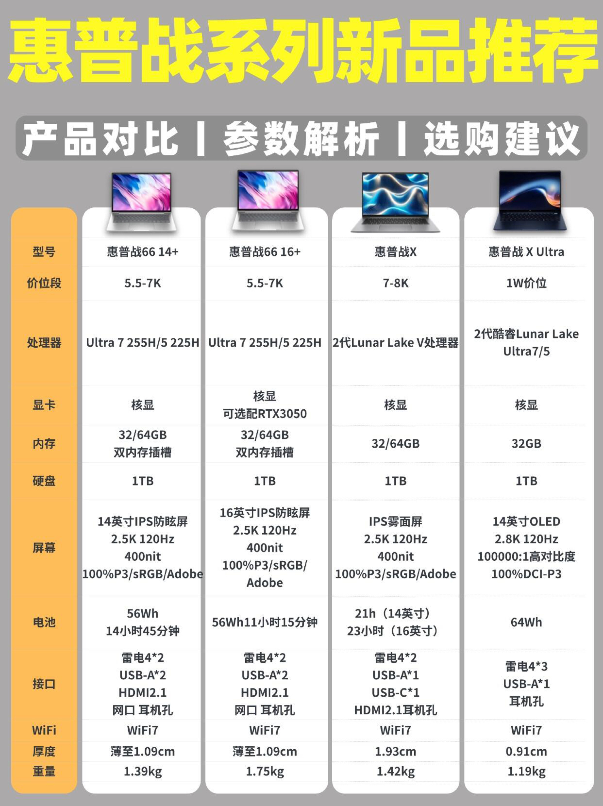 今年各家新品轻薄笔记本的更新挺大的,惠普的战系列也是带着全新AI buff全员上新,战系列因为品质比较好,销量一直不错。新产品覆盖5K-12K的价位,无论是管理层大佬,还是外出商务、办公需求的白领、或刚入职场且对品质要求高的毕业党,全面覆盖!下面就给大家详细解析怎么选? ~ 一、看哪些参数 轻薄便携:越轻越好,方便携带差旅。注重极致便携,可优先考虑14英寸,屏幕大小和重量平衡的会更高一些。 高素质...