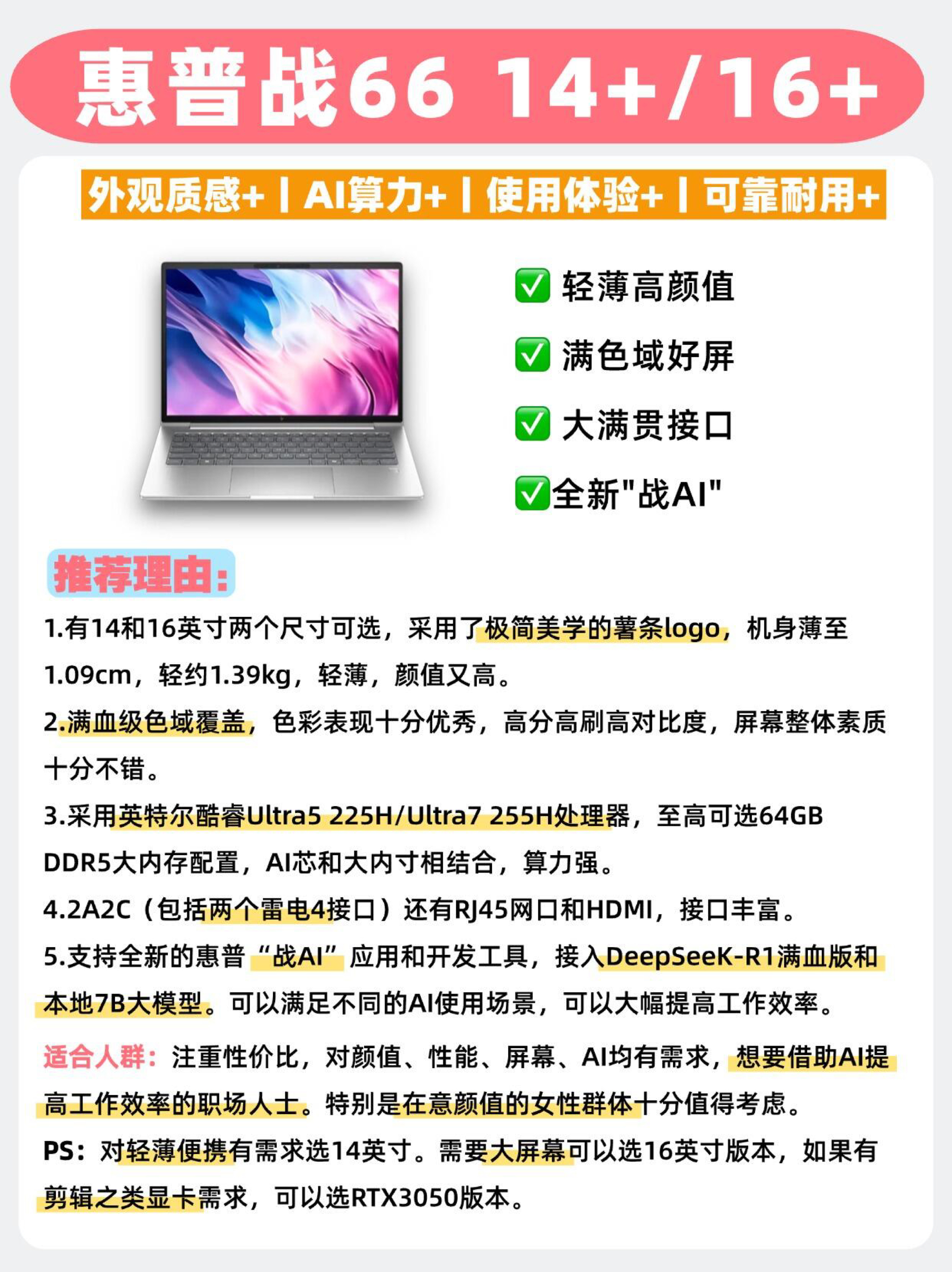 本篇笔记关联了HP/惠普 战66 14+ 酷睿版 2025款 14英寸 笔记本 高性能 高刷 银色、HP/惠普 战66八代 16+ 酷睿版 2025款 16英寸 笔记本 Ultra7 255H处理器 2.5K屏 银色、HP/惠普 战X 酷睿版 2024款 14英寸 笔记本 高端 轻薄 办公 高性能 高刷屏 深银灰等商品,为用户提供真实的使用体验和购买参考。