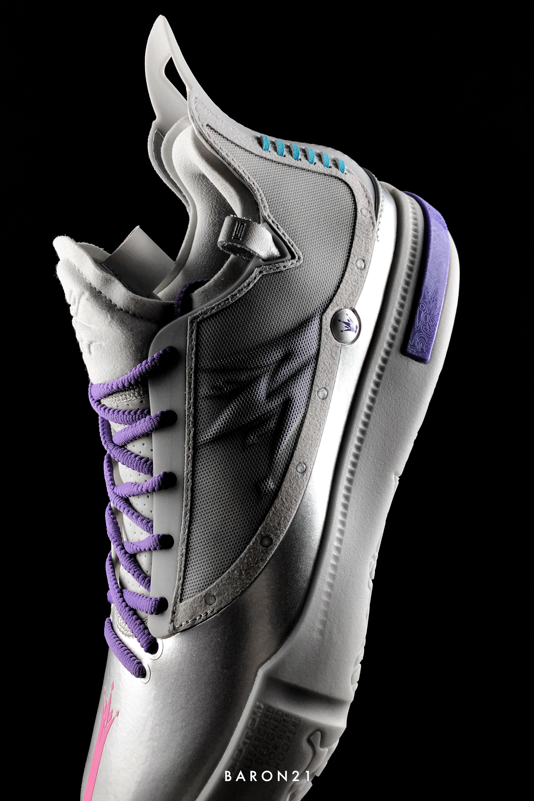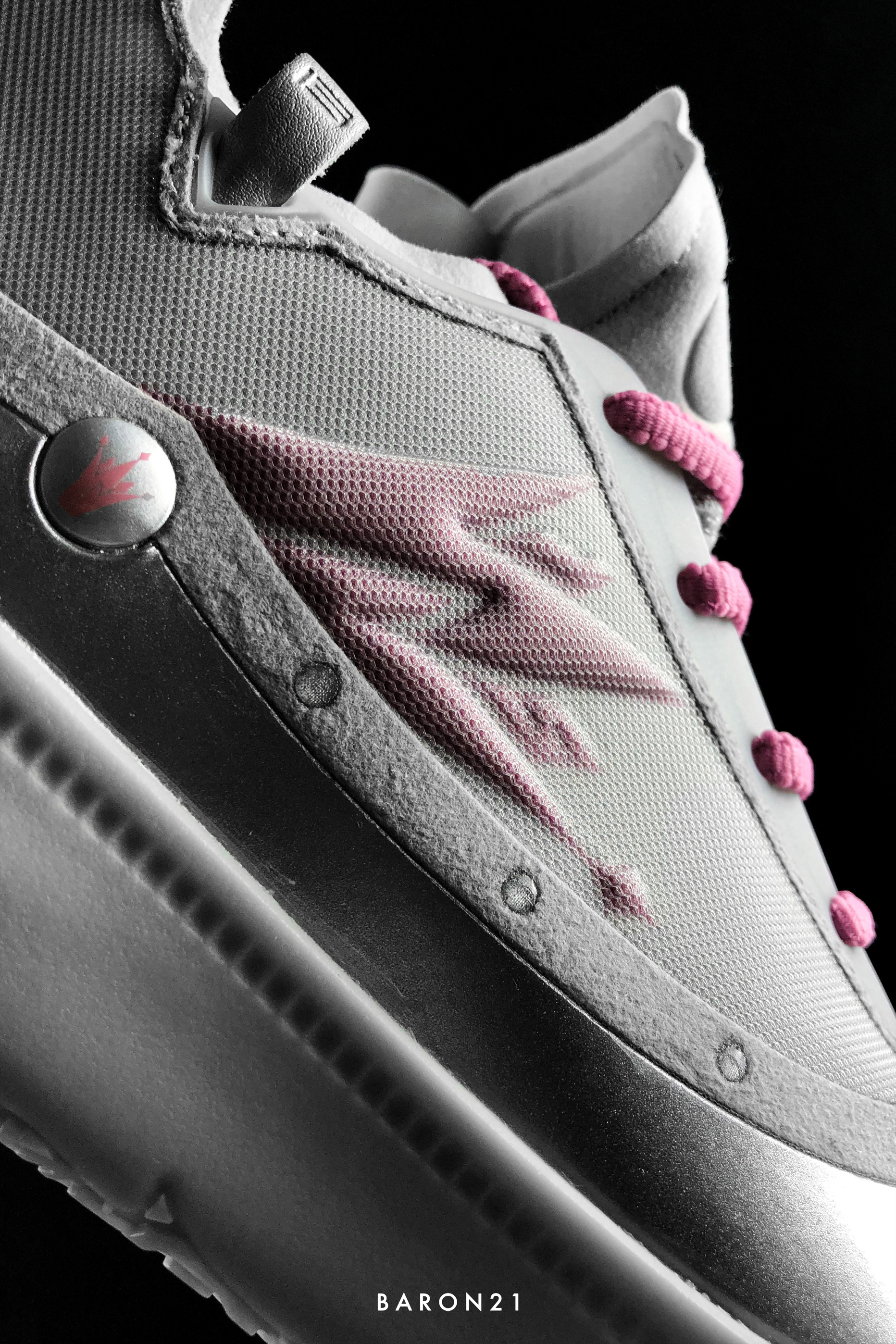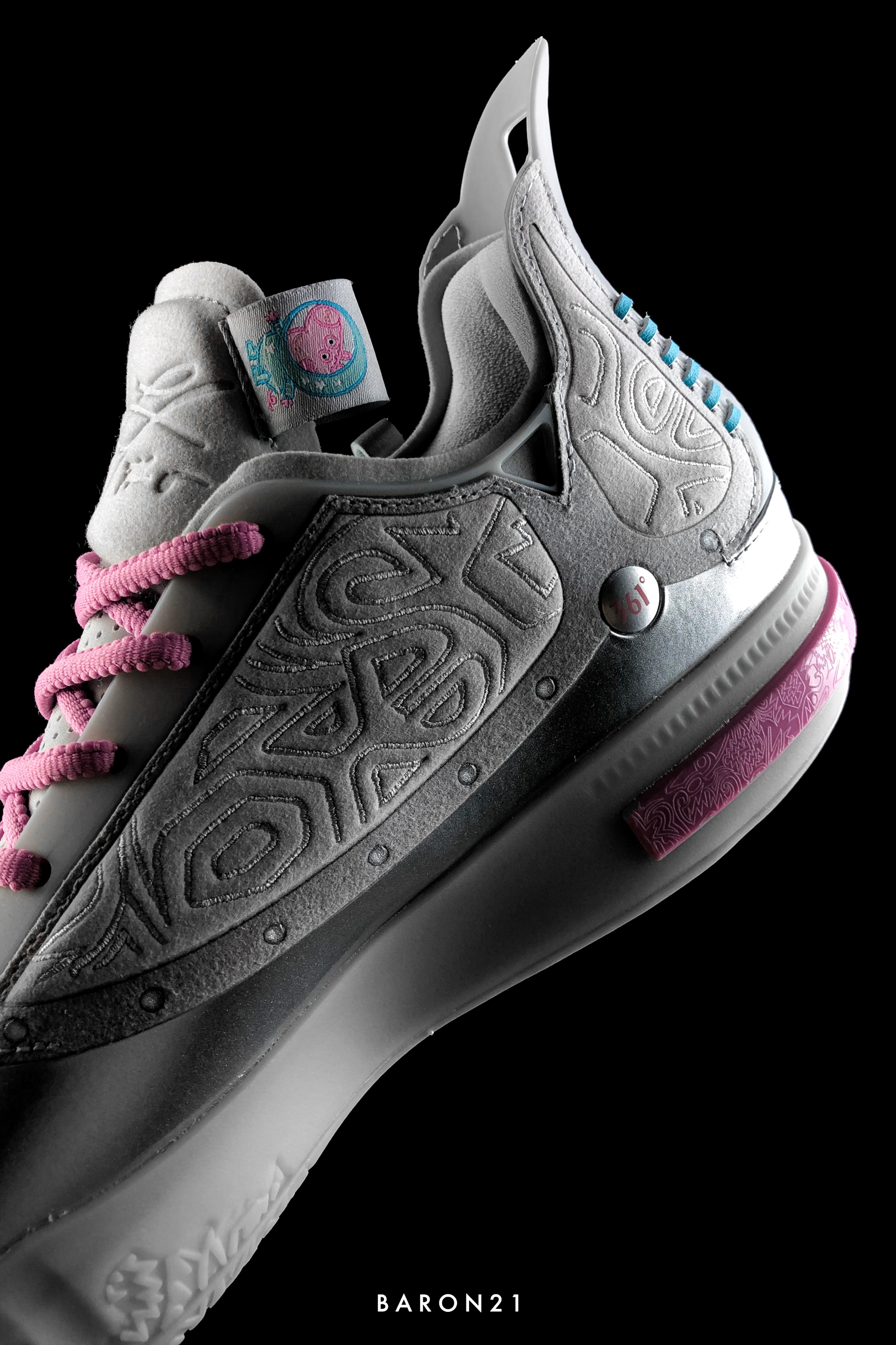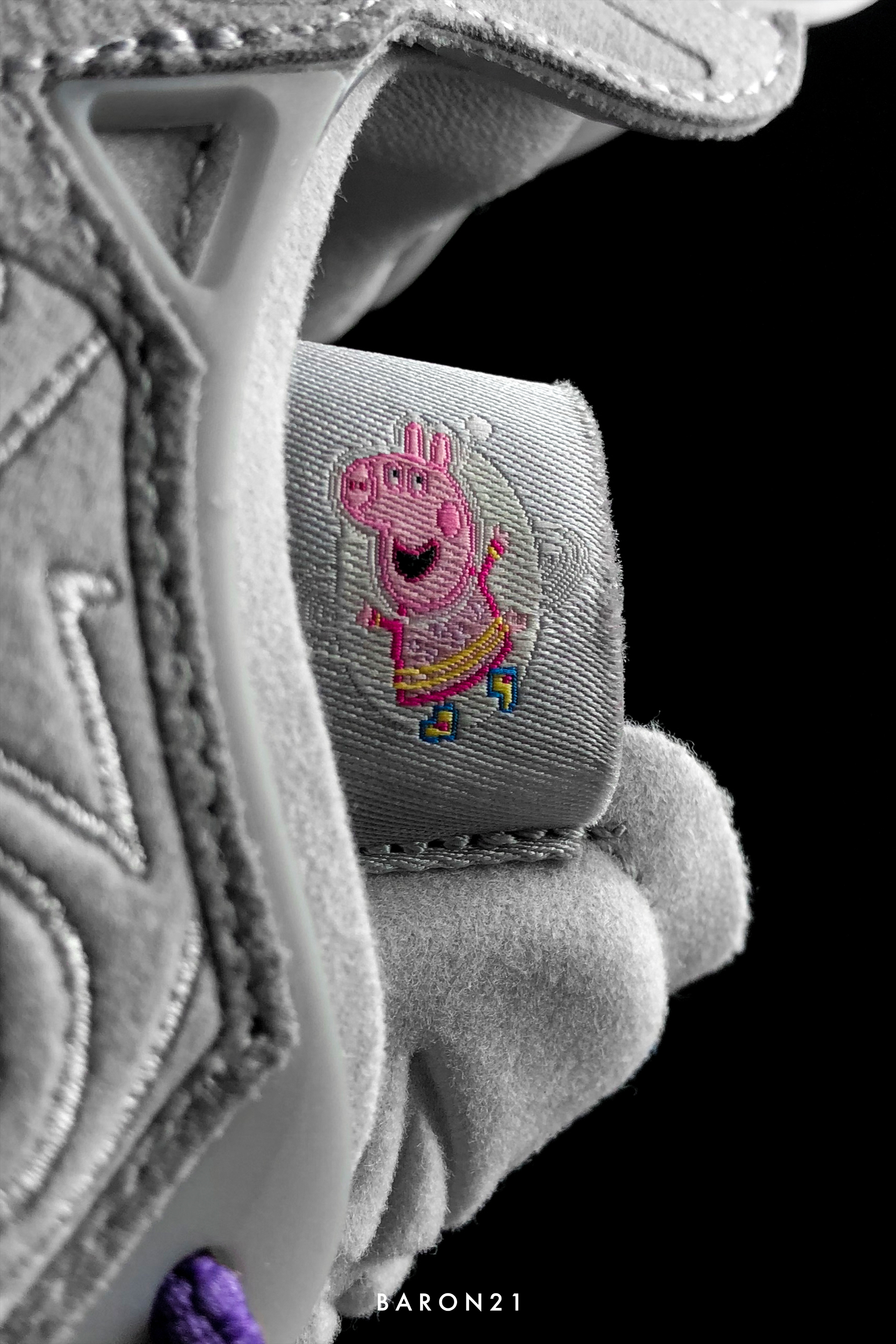 如果和小猪佩奇联名,多数人第一反应会想到的是粉色主题,很少人会知道还能做成银色。今天的主角就是和小猪佩奇联名的Joker1 GT太空佩奇。鞋身主体是太空银,左右两只还用了不同颜色的细节点缀,形成了别样的鸳鸯配色。挺小众的,但也足够让人眼前一亮!
