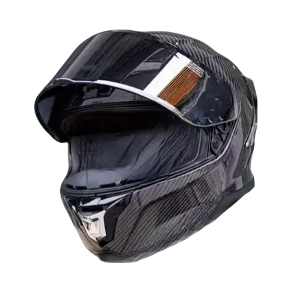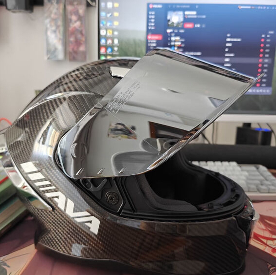 这头盔一戴上直接帅炸街! 碳纤维材质超轻,戴着骑车脖子不累。👍👍 ✅✅双镜片超实用,白天防强光晚上防远光,还送防雾贴!大尾翼造型拉风,亮光漆质感拉满。 关键是能拆洗内衬,脏了随时清洁,安全性也到位,骑车的兄弟闭眼冲就完事!👋👋