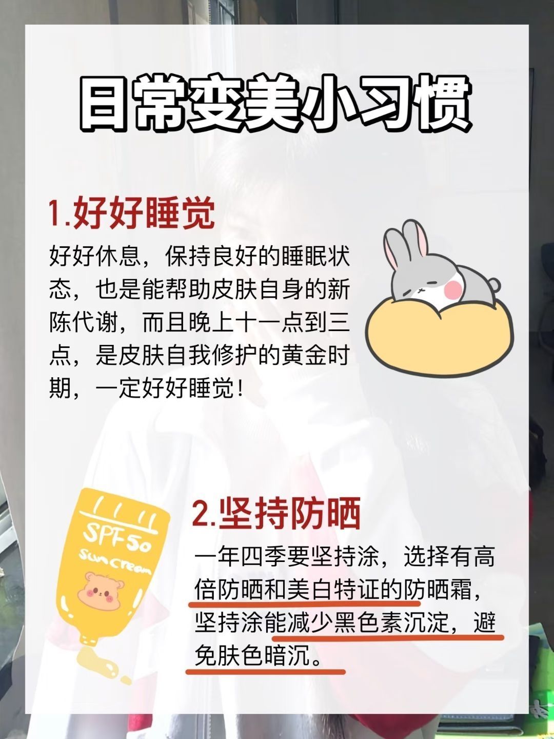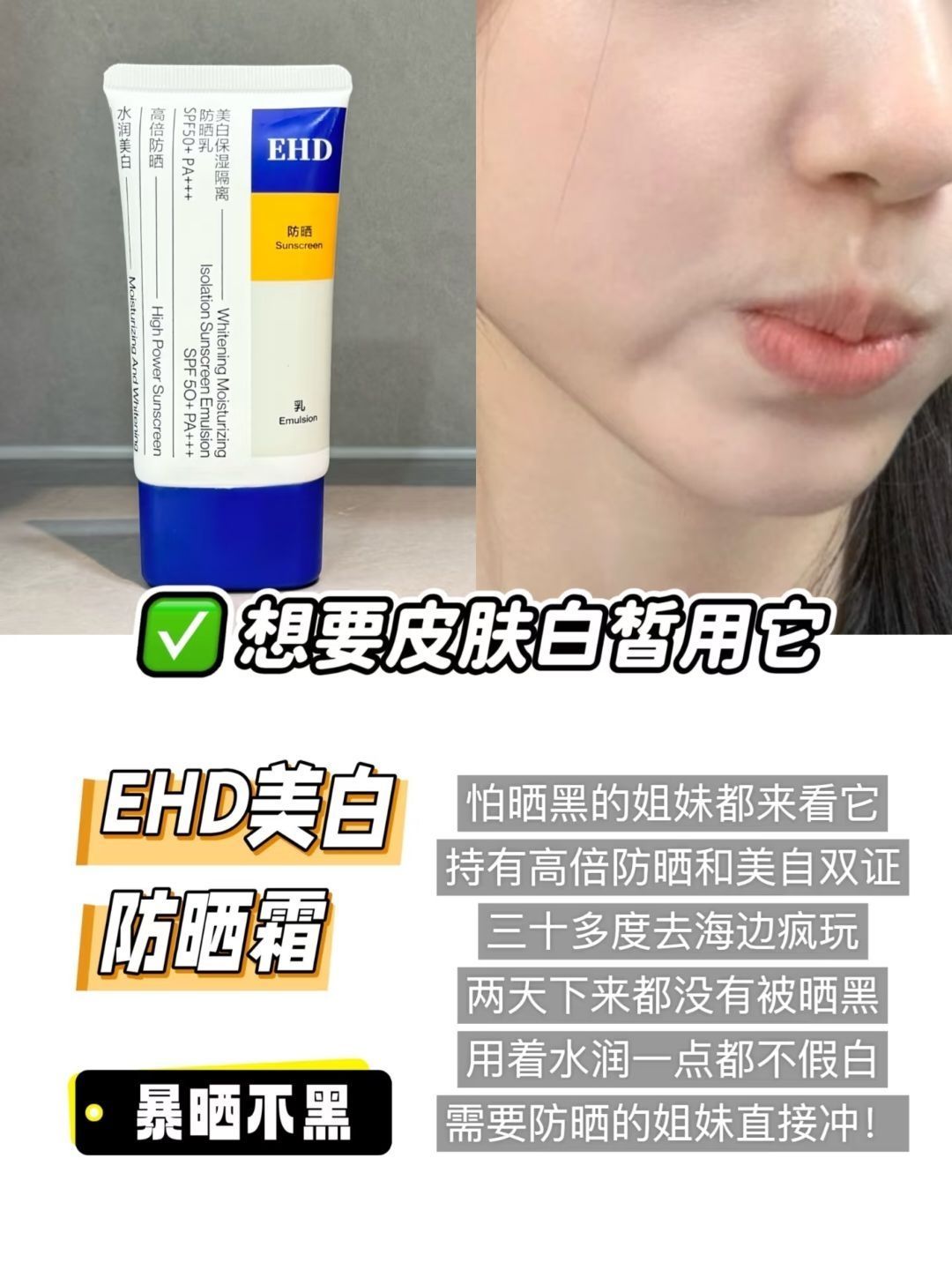 宝子们!变美真的不难!坚持上面这些,躺着也能悄悄变精致~👇🏻 ✅头发蓬松 ✅皮肤白皙 想要皮肤白皙一定要坚持防晒,可以试试EHD防晒霜我用了两瓶了怎么晒都不会黑!姐妹们可以试试 ✅关节白嫩 ✅鼻子干净 ✅皮肤干净
