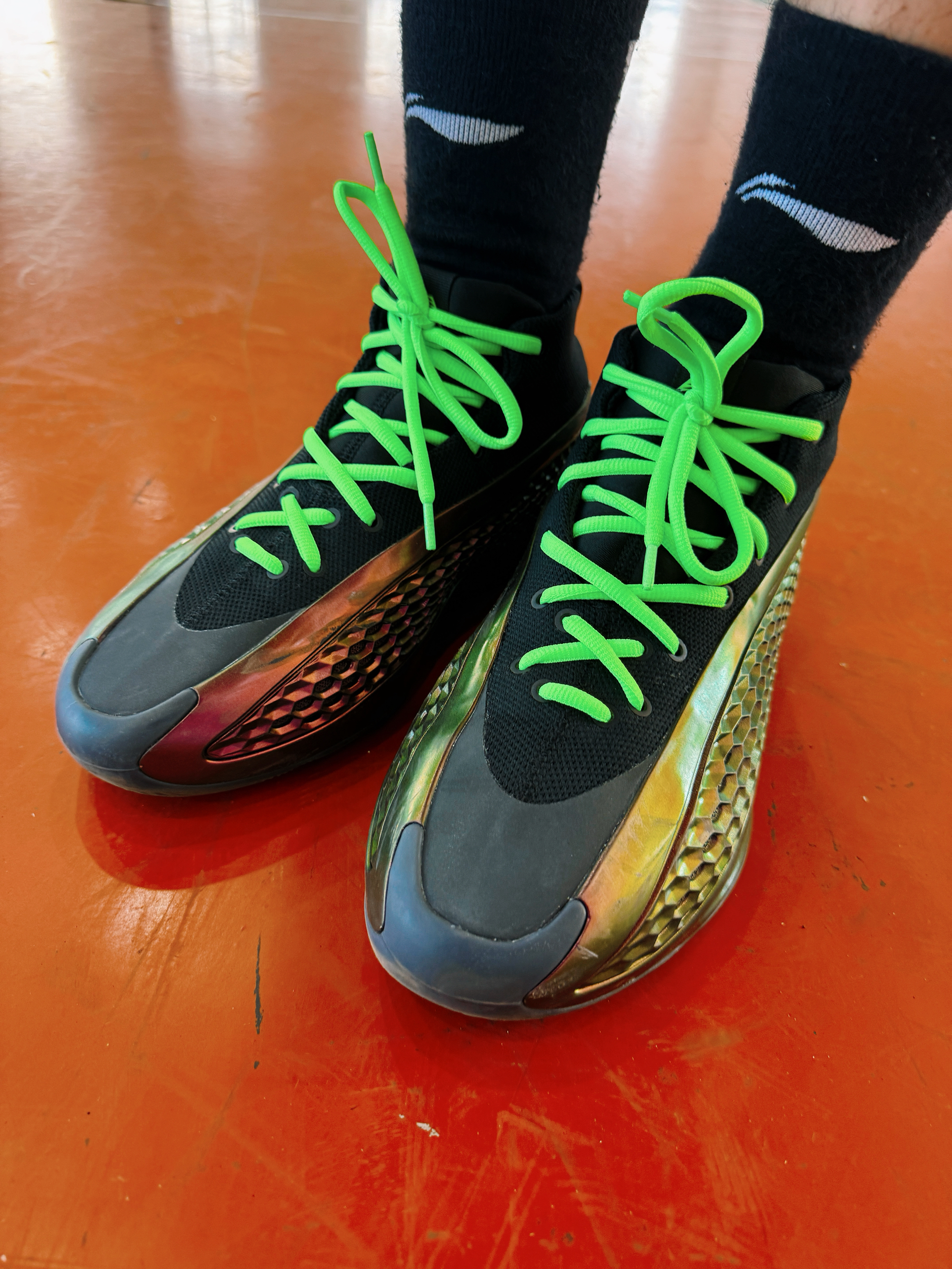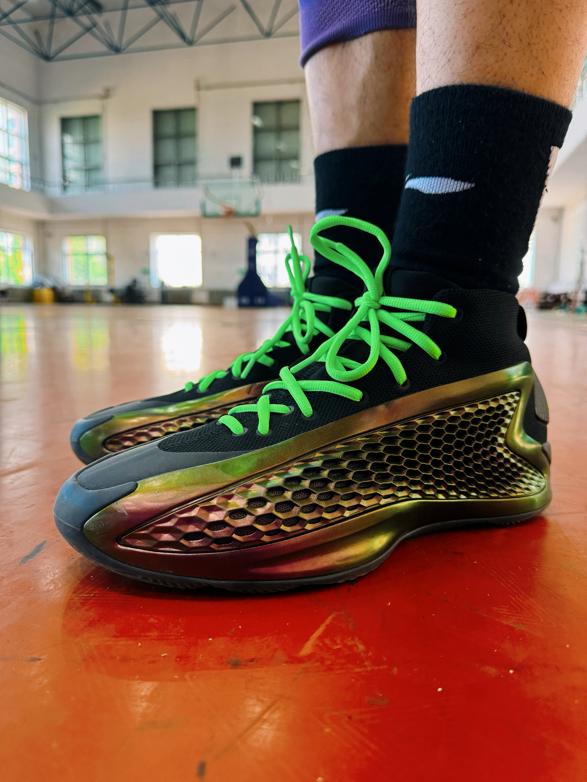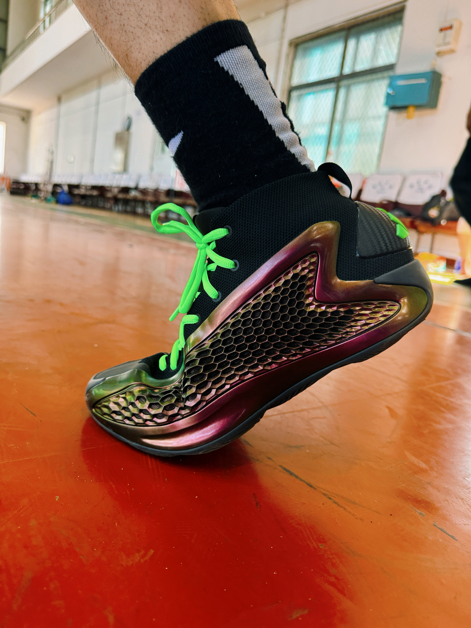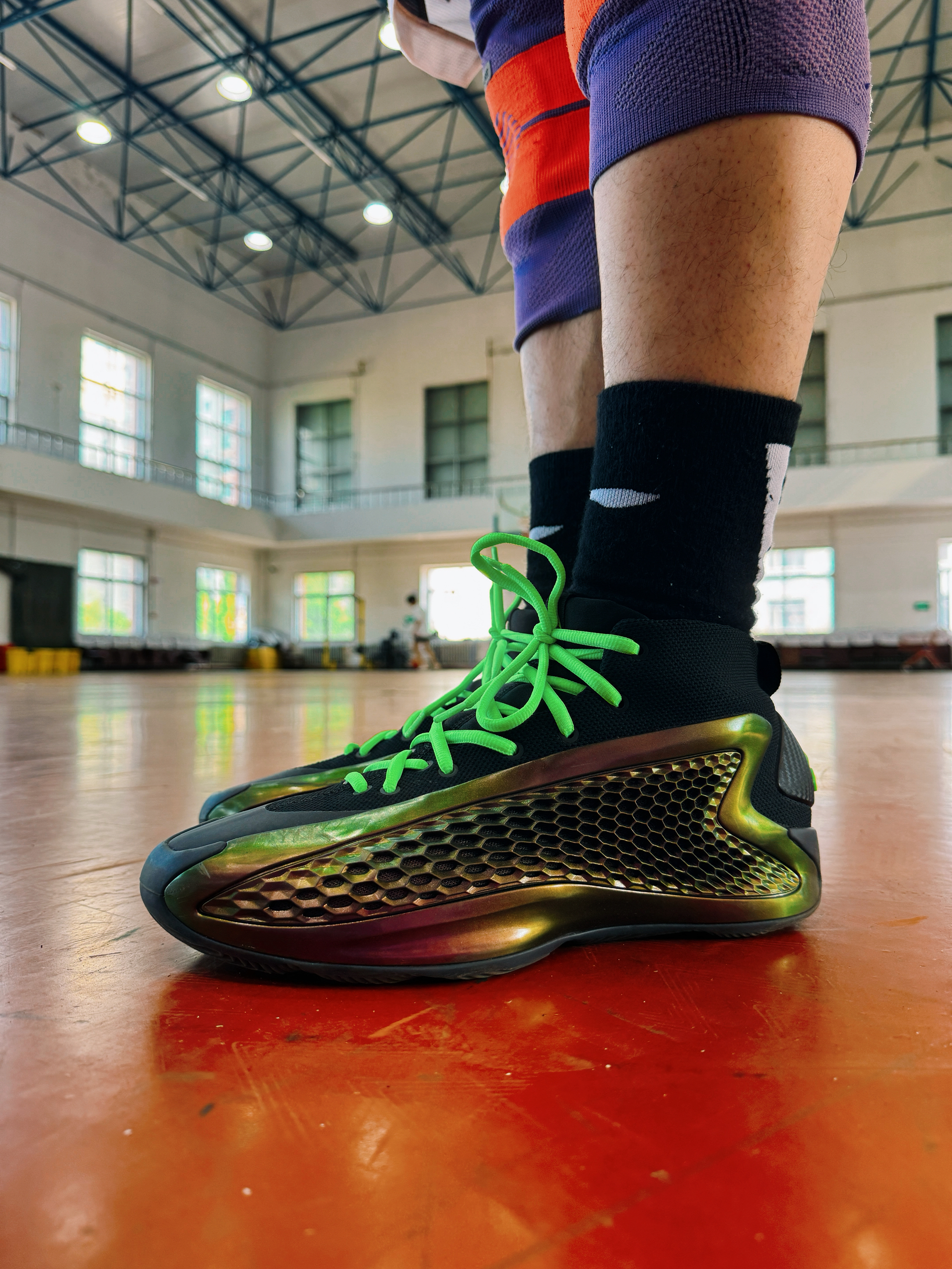 爱德华兹1代也穿了很多双了 这次的adidas 爱德华兹的1代配色很帅气 有一种低调中 又有很不错的金属光泽 颜值方面很特别 搭配这个绿色的鞋带 是很好的一种定制 实战方面依然就是因人而异了 有的适合类型的球员很喜欢 有的人不适合 就会觉得实战根本没法穿