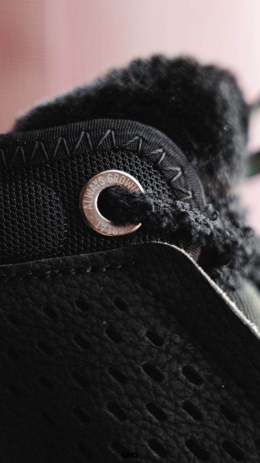 阿隆戈登的英文名Aaron Gordon, 首字母AG刚好对应了最后一个鞋带扣上的 Always Growing All Great 也可以理解为英文版的「改善」 可见戈登是真喜欢中国文化啊! 虽然禅7首发的几个配色都挺好看, 但谁让熊猫是戈登的绝杀配色呢, 这么有故事性的一双鞋还是值得好好欣赏一下。 后跟是最美的部分, 鞋带毛茸茸的, 跟其他几个配色的材质是不一样的。 鞋型上看感觉变化不大, 但...