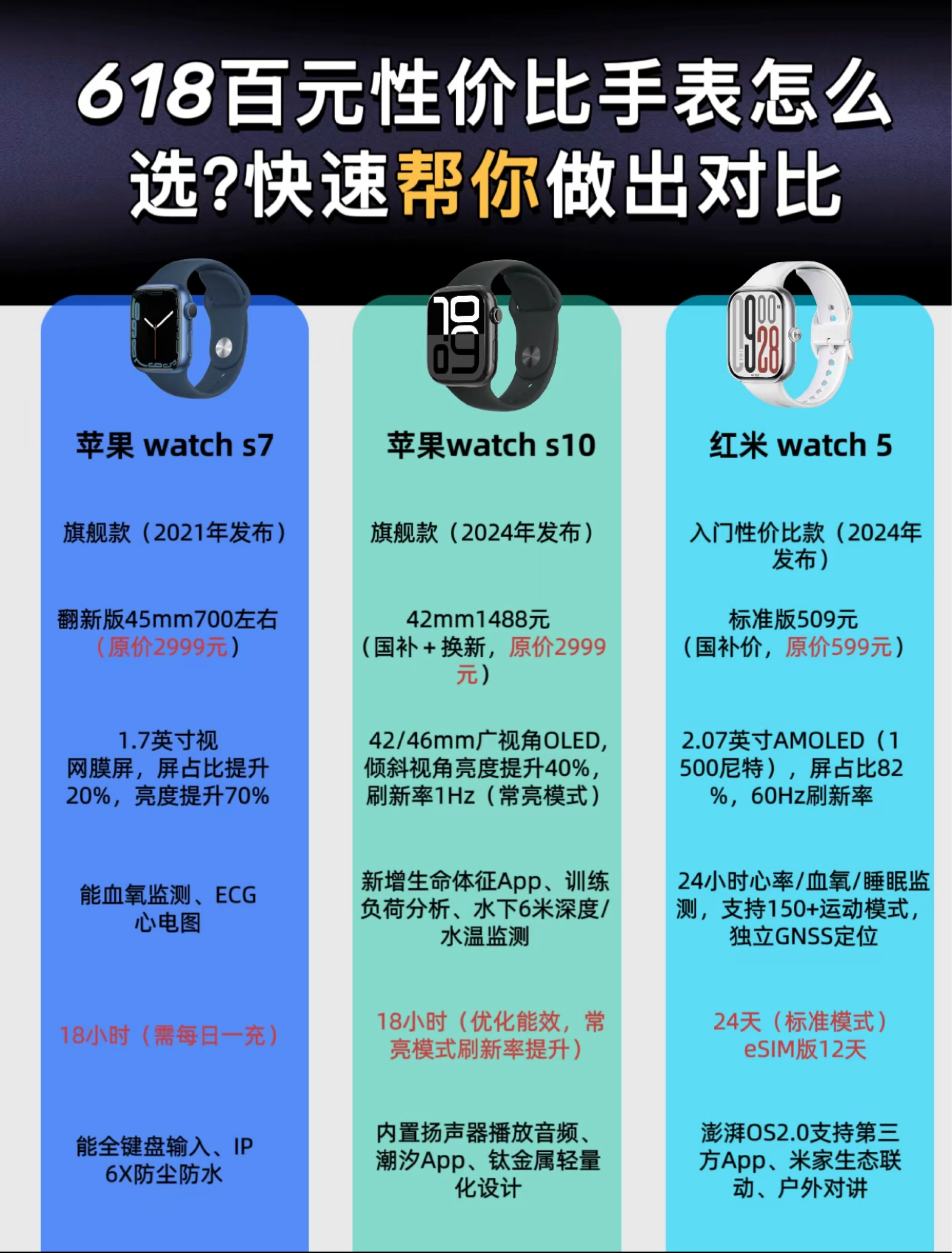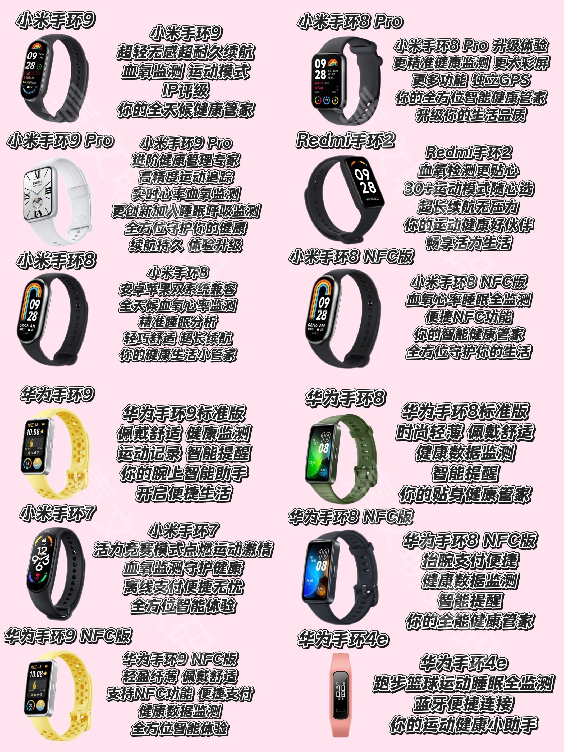 这就是500以内的智能手环手表分别是华为手环10,华为手环九,小米手环九,小米手环9Pro手表呢则是vivo手表,华为手表,红米手表这几个的话也是个优缺点,就比如说华为手表,它这个在功能方面比较全面的,但是黑边有点大红米,手表的话虽然黑边很窄,但是在功能方面的话没有微信有独立回复功能。
