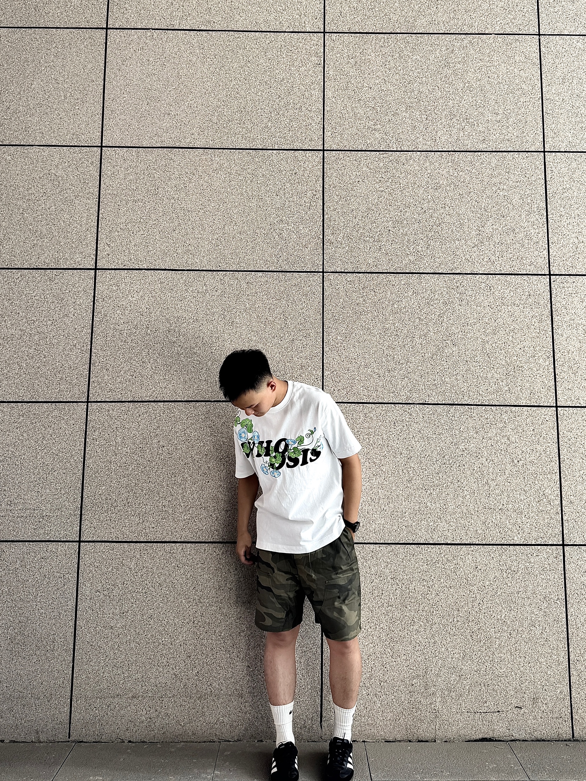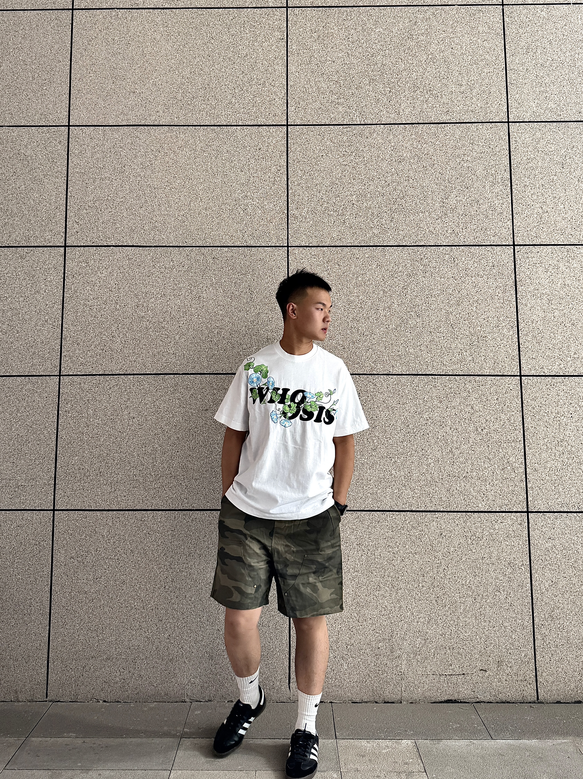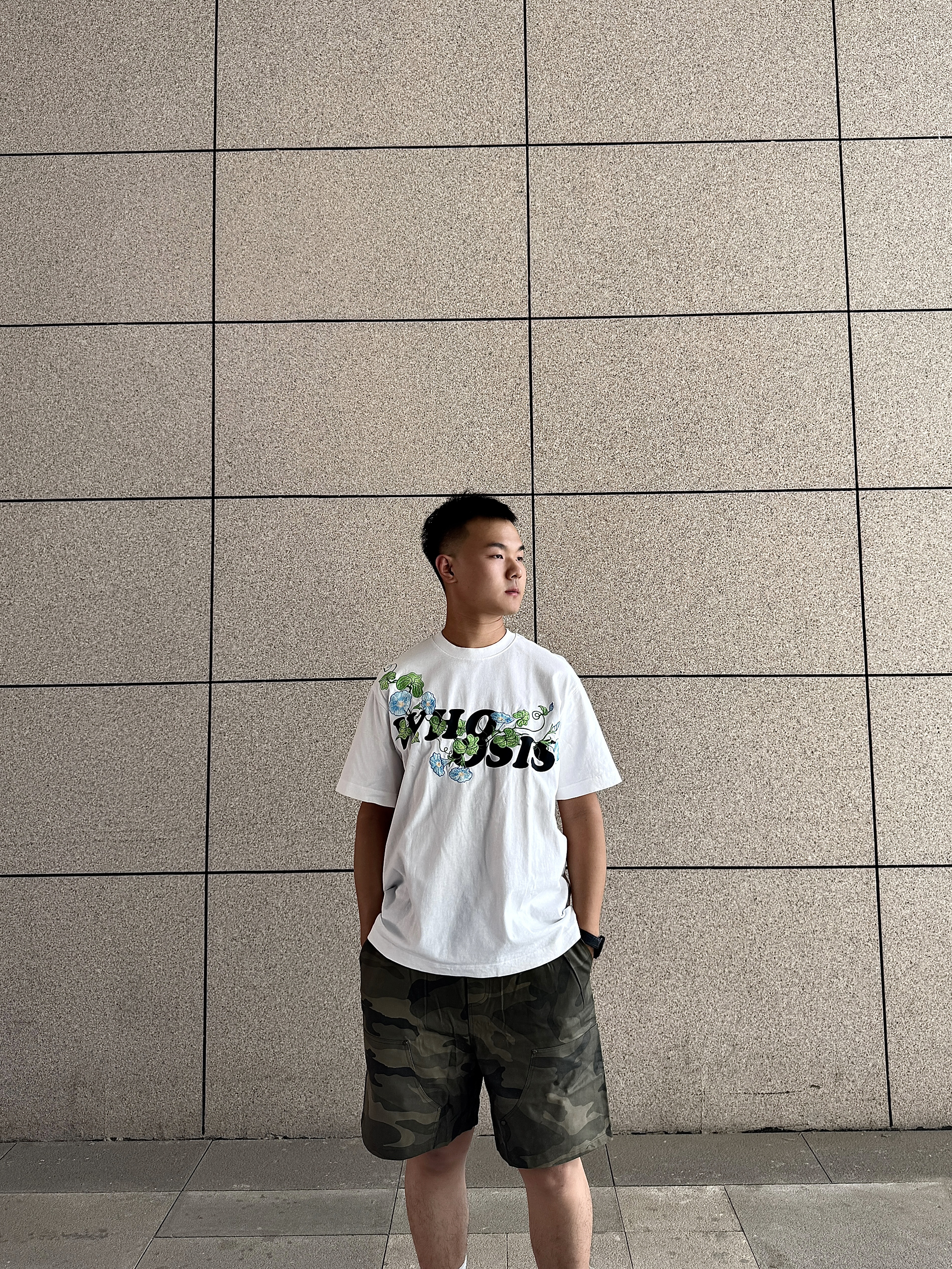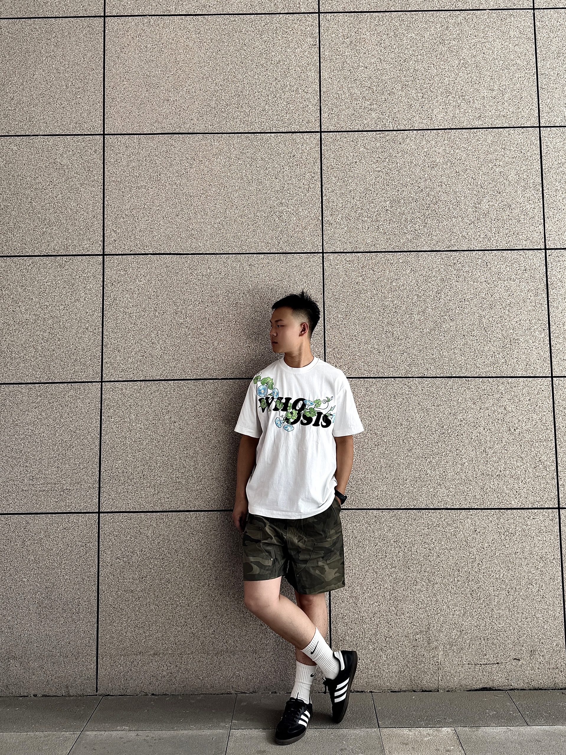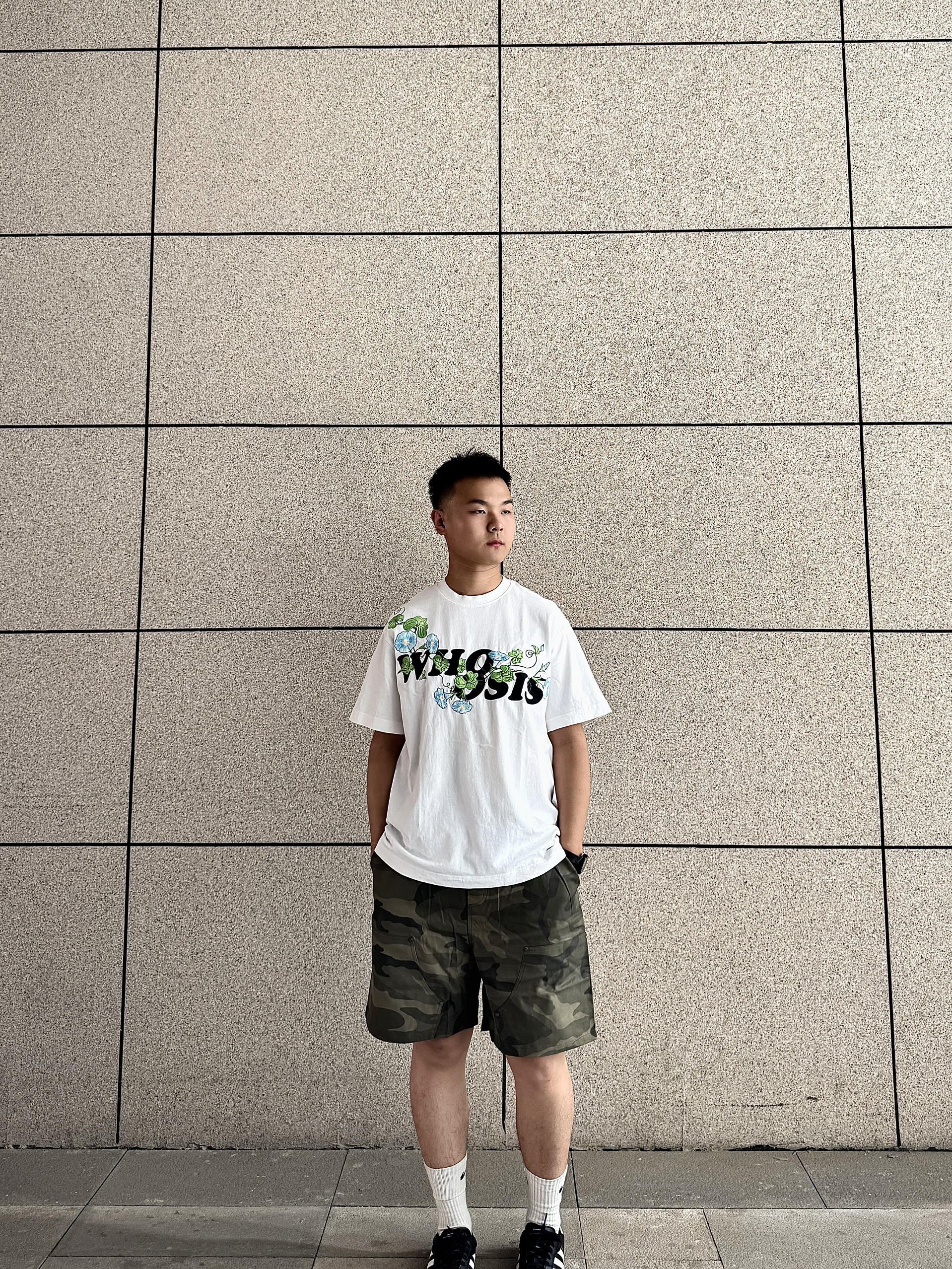 上身为whoosis的牵牛花系列短袖 在日常生活中通勤好穿 带点小设计也不单调,简约设计 下身为迷彩短裤 日常出guy舒适又好看 搭配阿迪达斯小德训鞋 轻松get了穿搭小技巧
