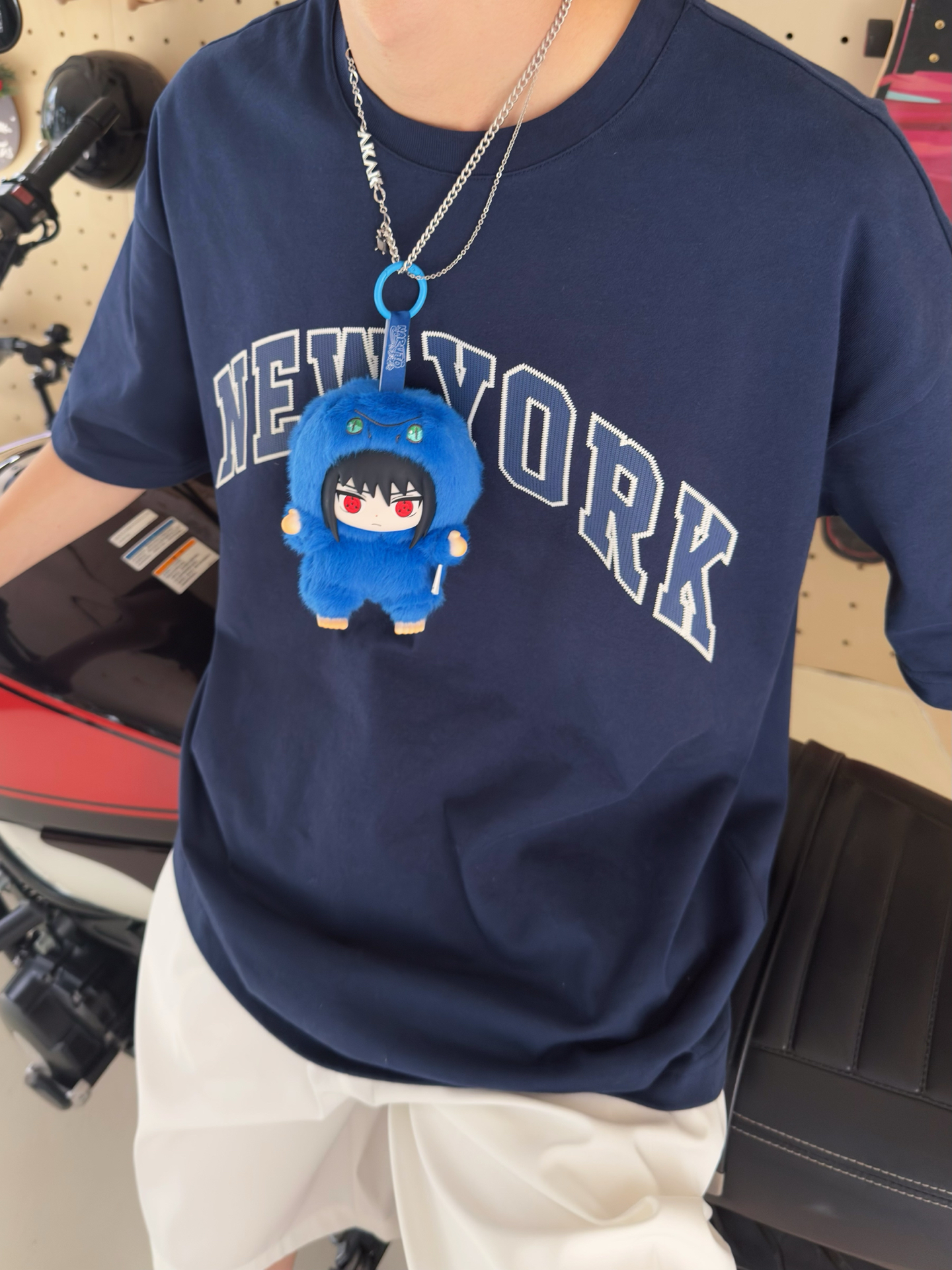 今天选了街头风穿搭进木叶了📢📢 🙌🙌🙌藏蓝色印花短袖搭配白色休闲短裤, 再穿双复古蓝色球鞋 14cm 的大小挂包上或者摆桌上都超合适👏👏👏 手臂还能小幅度摆动,趣味性拉满,火影迷闭眼冲! ✨✨和鸣人佐助一起出门咯。