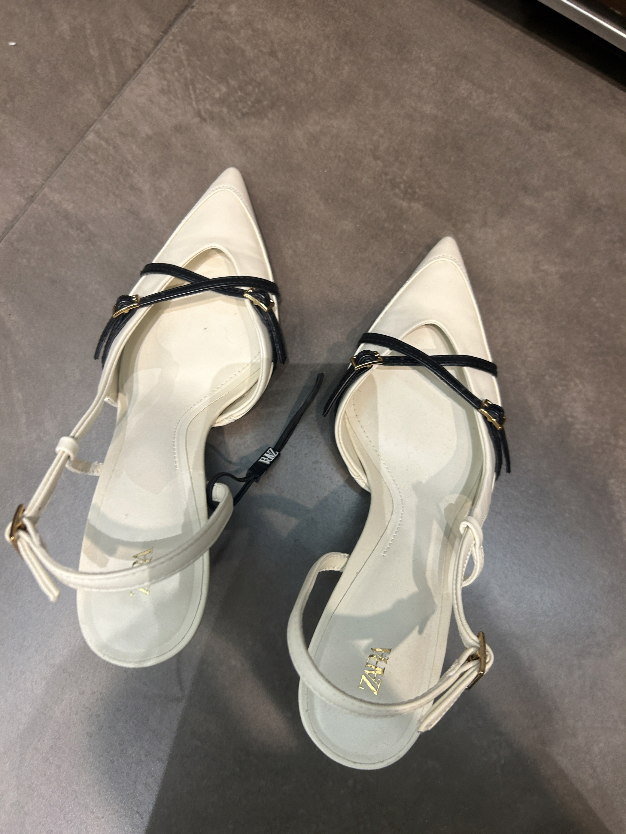 逛街看到 ZARA 这双凉鞋,瞬间被戳中审美! 米白底色干净温柔,交叉黑带+小金扣点缀,简约又精致,日常通勤配裙装、裤装都很绝,走路也稳当,舒服又好看,好想带回家呀,在这里分享给喜欢轻法式、极简风的姐妹~