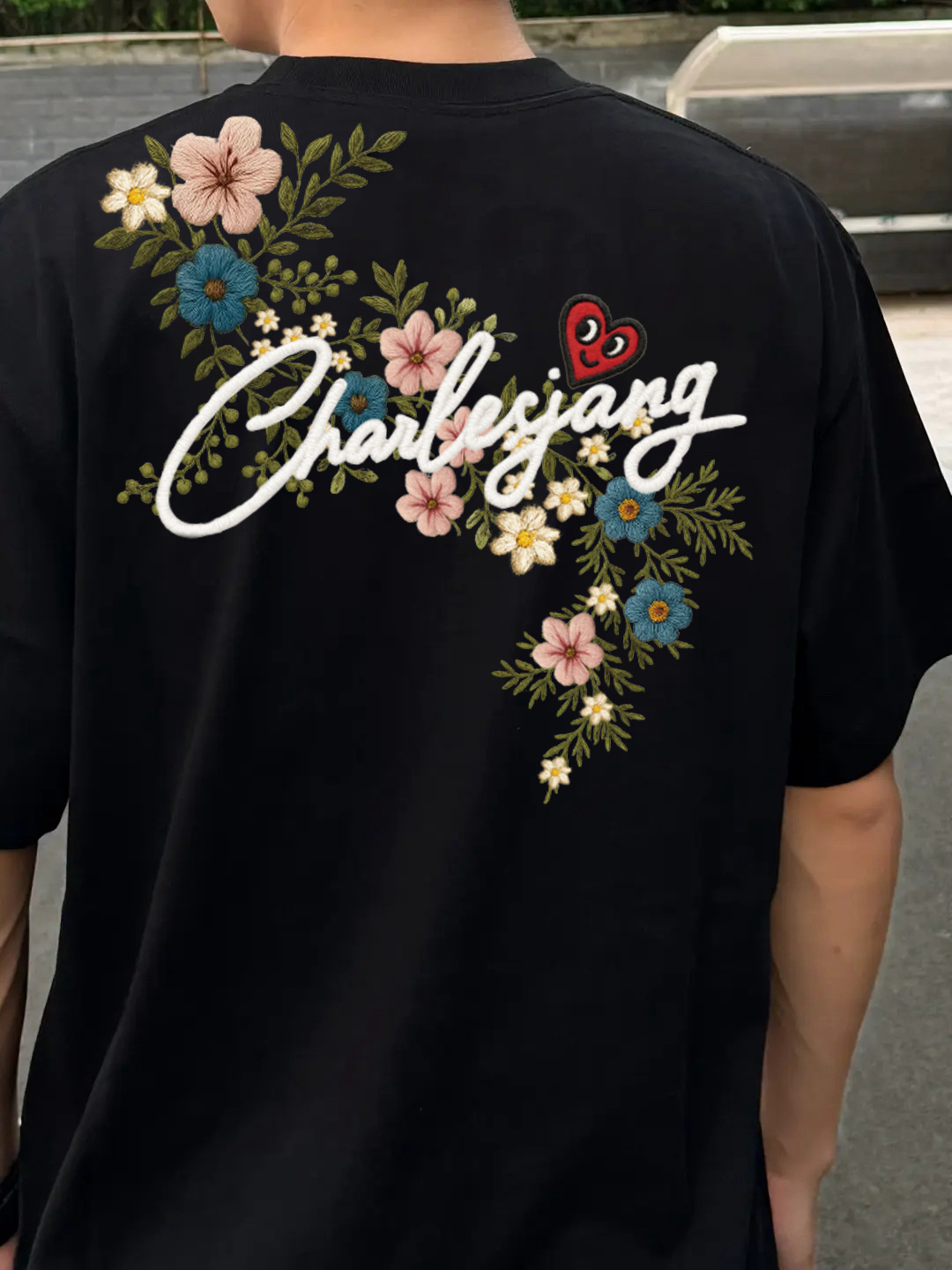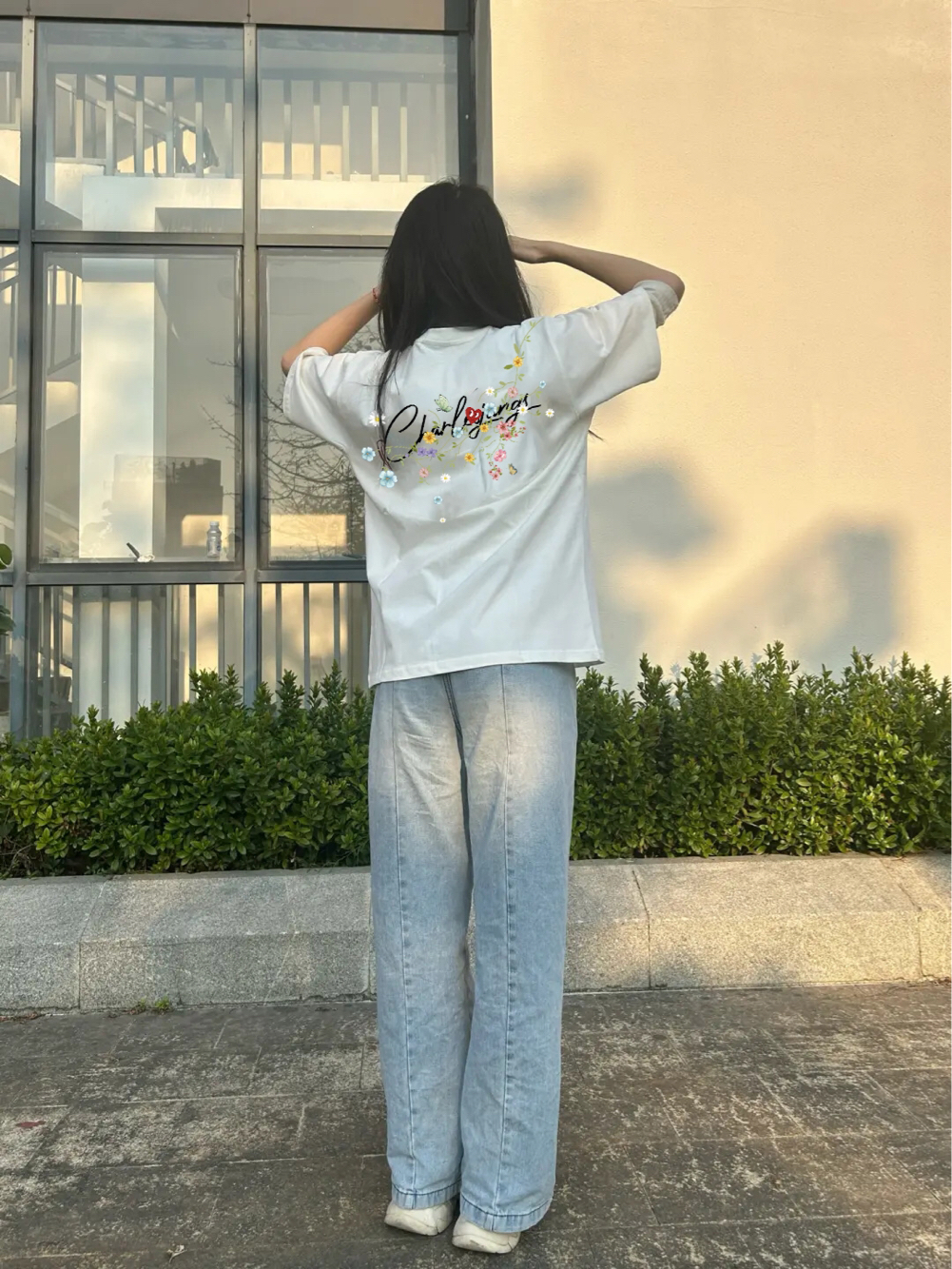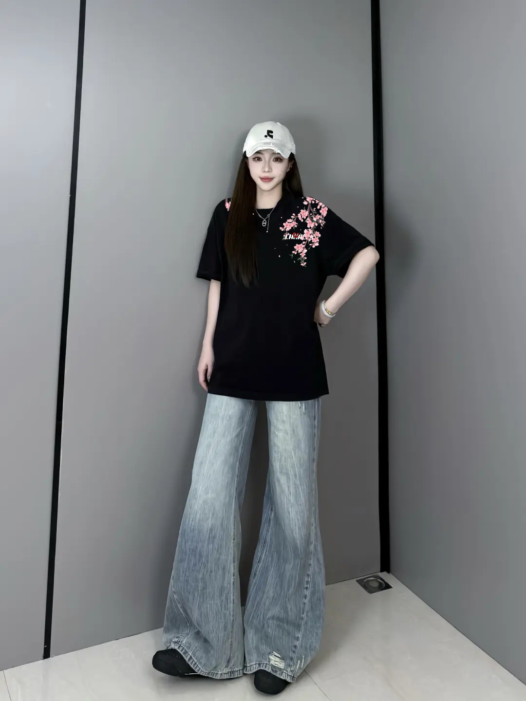 这件黑色短袖,经典的圆领基础款,搭配后背的刺绣花卉短袖,整体造型氛围感真的拿捏了