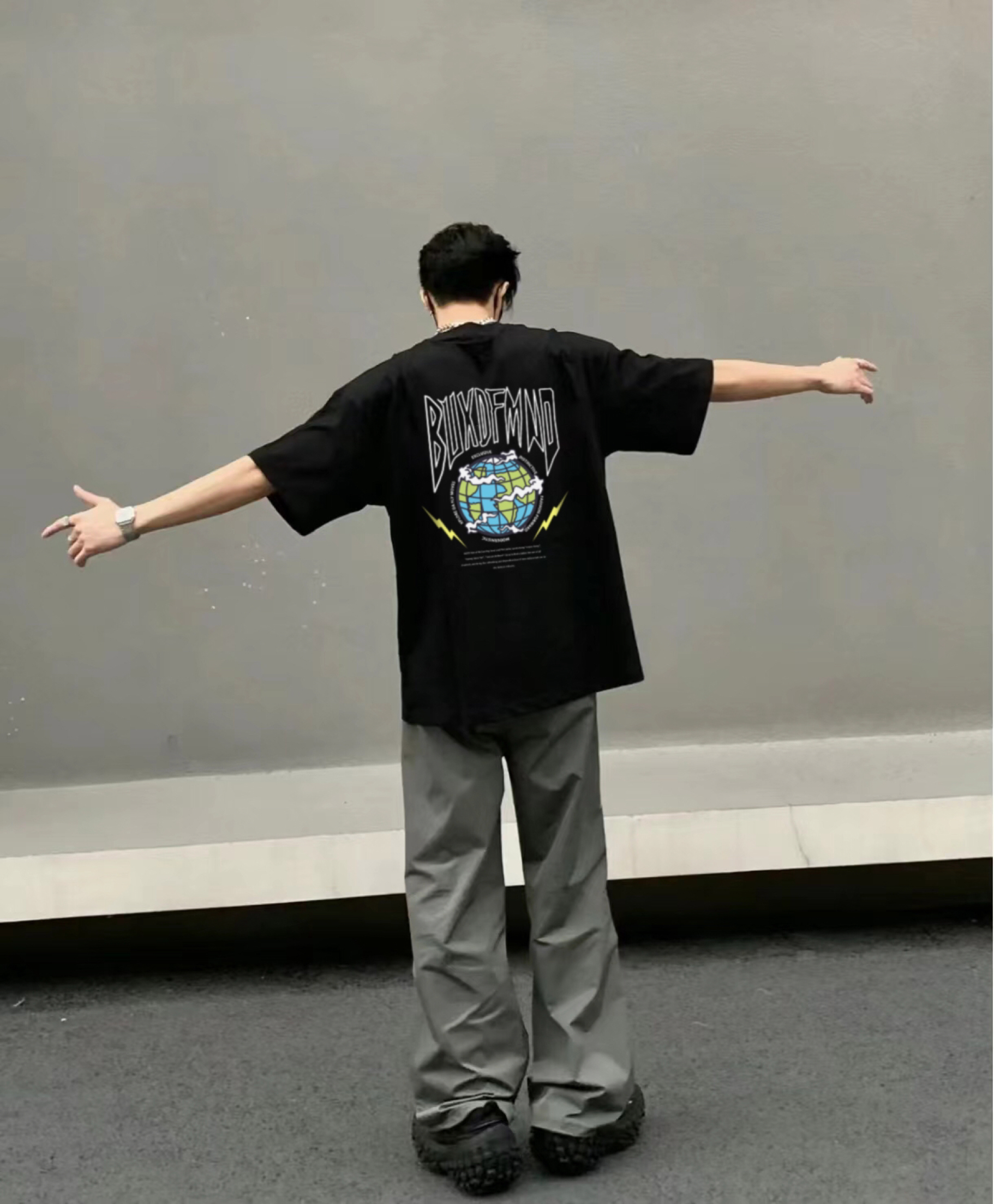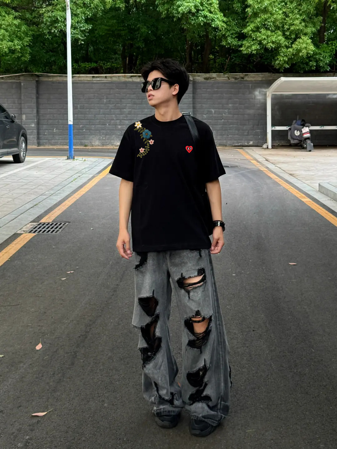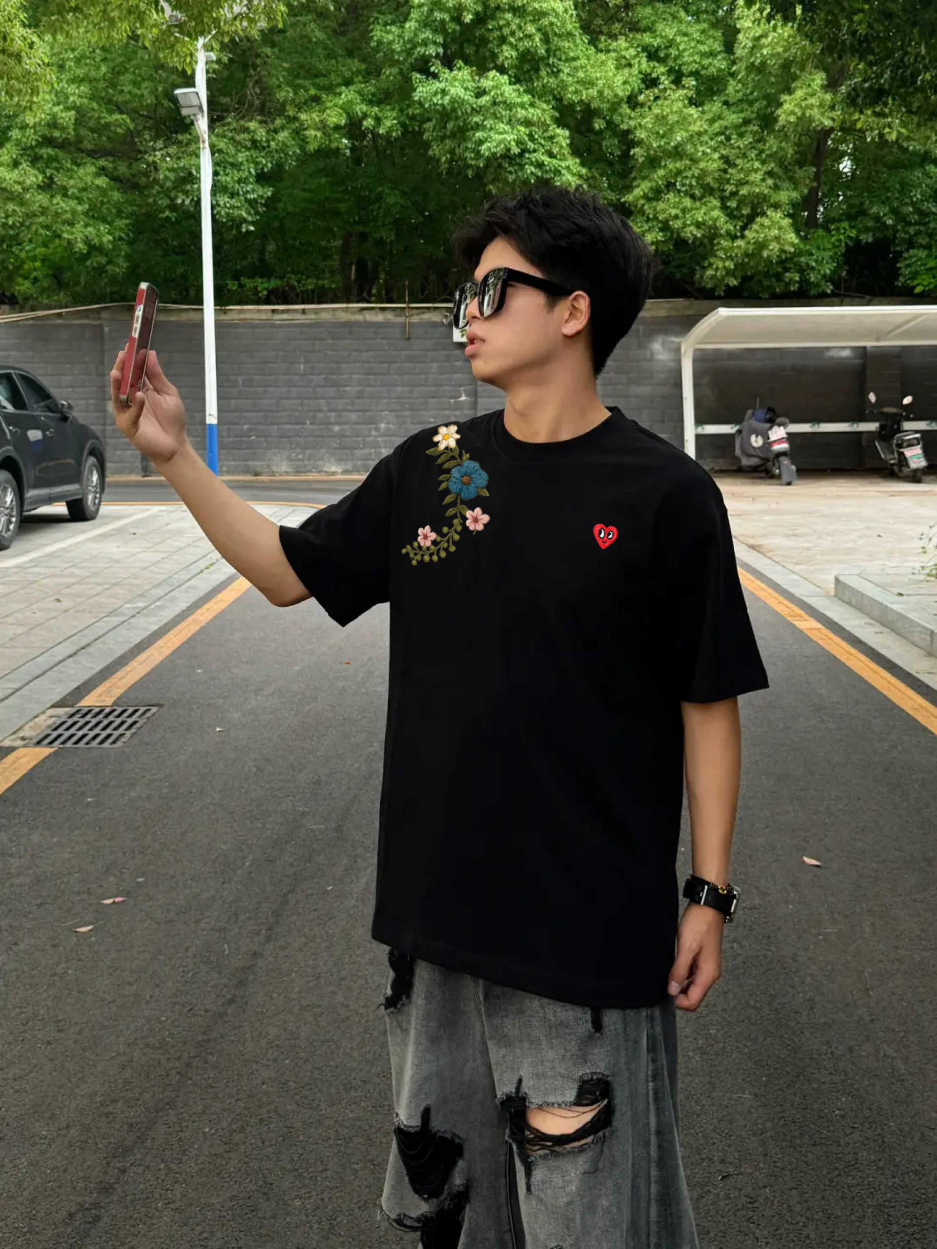 这件黑色短袖,经典的圆领基础款,搭配后背的刺绣花卉短袖,整体造型氛围感真的拿捏了
