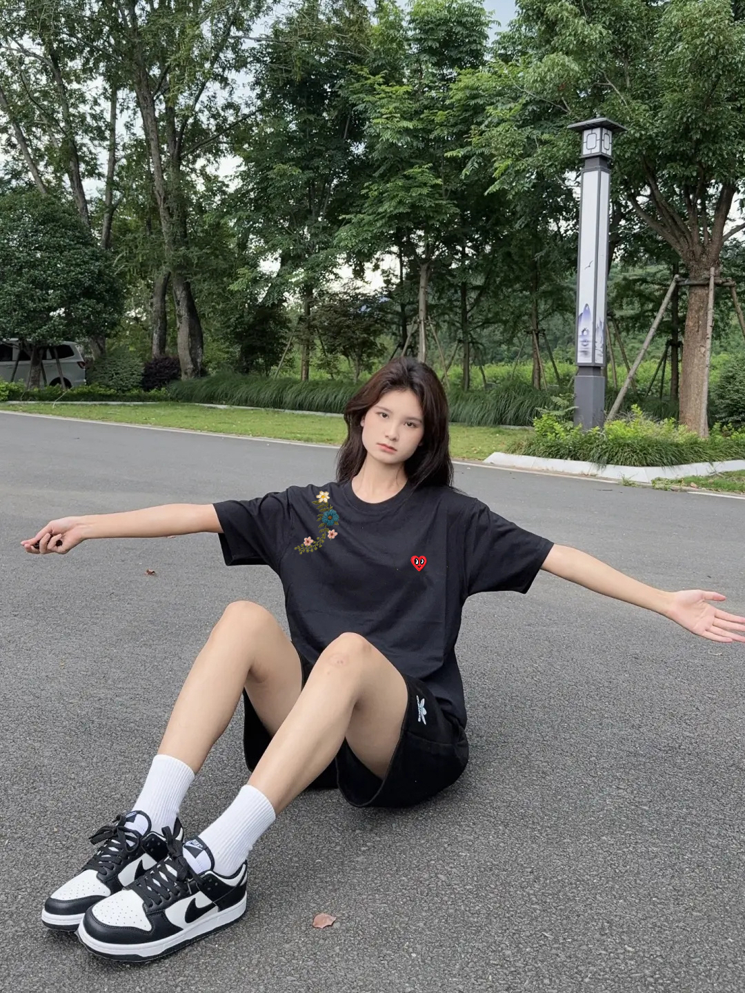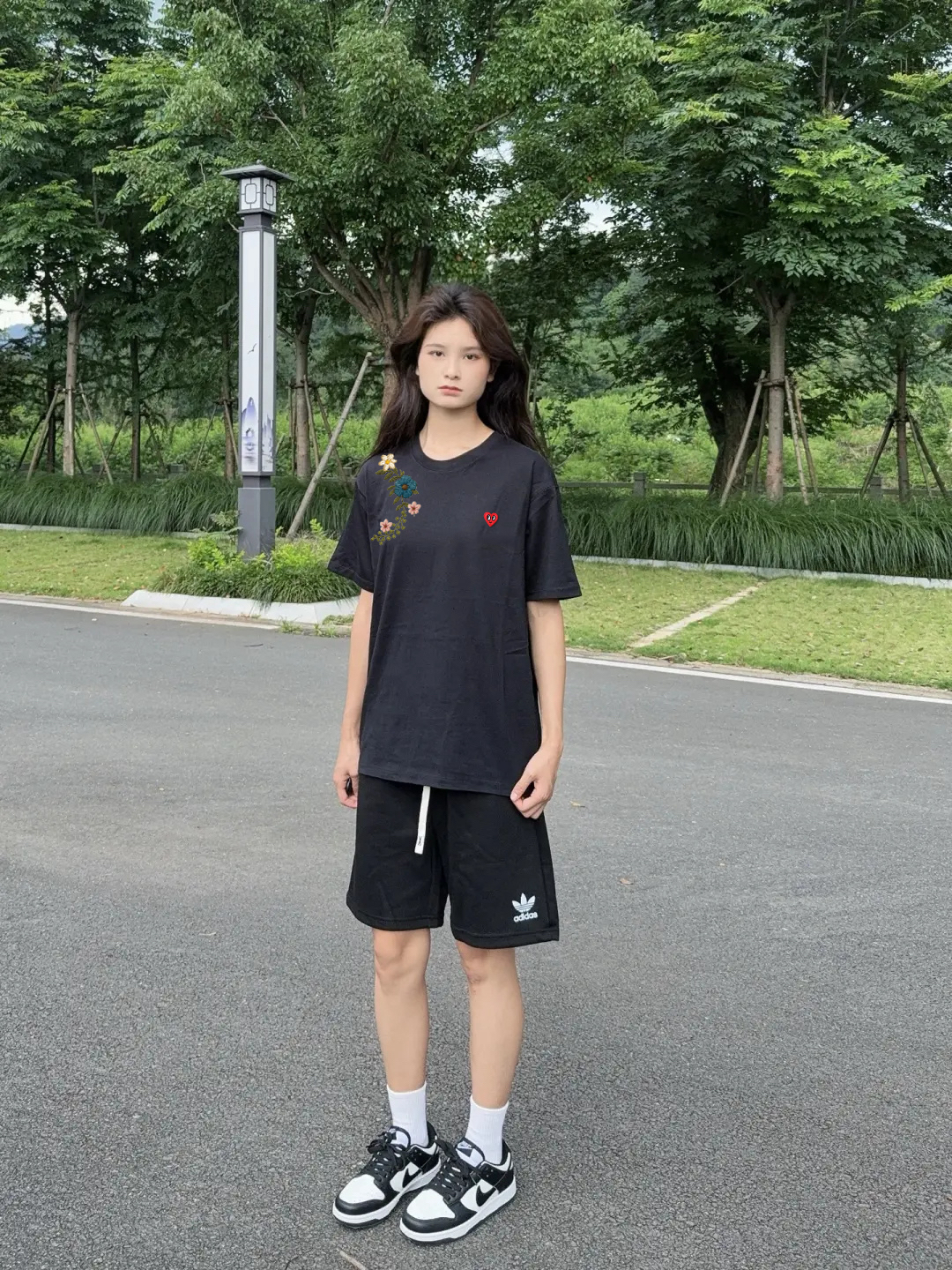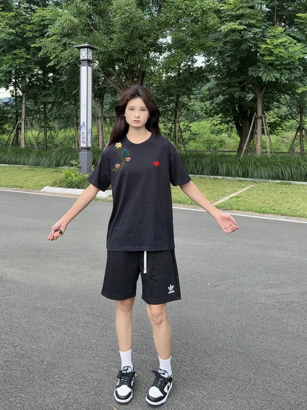 halo!!今天来试试这身又夏日又很有感觉还很街头的感觉,查尔斯桃心花卉刺绣短袖搭配短裤,简简单单就能拿捏的时髦