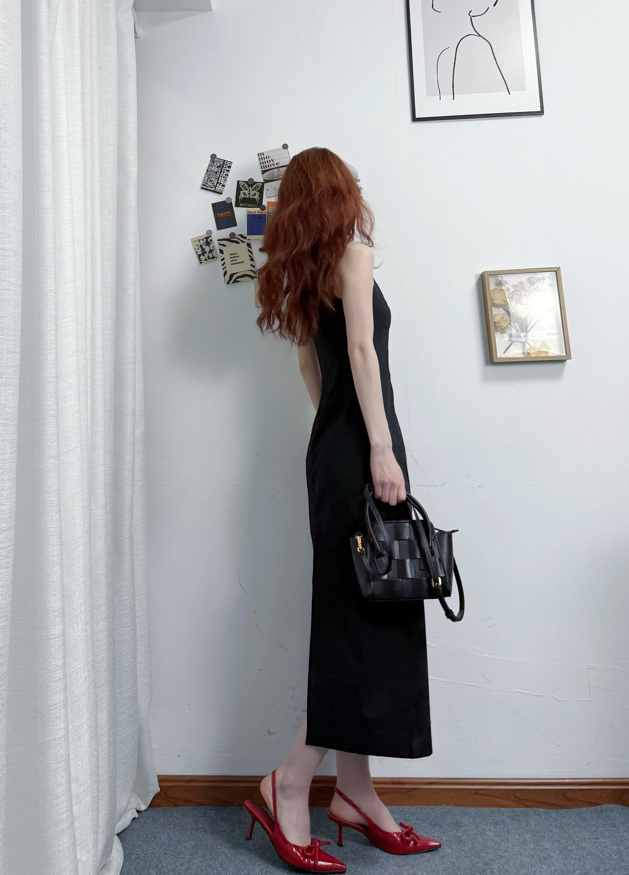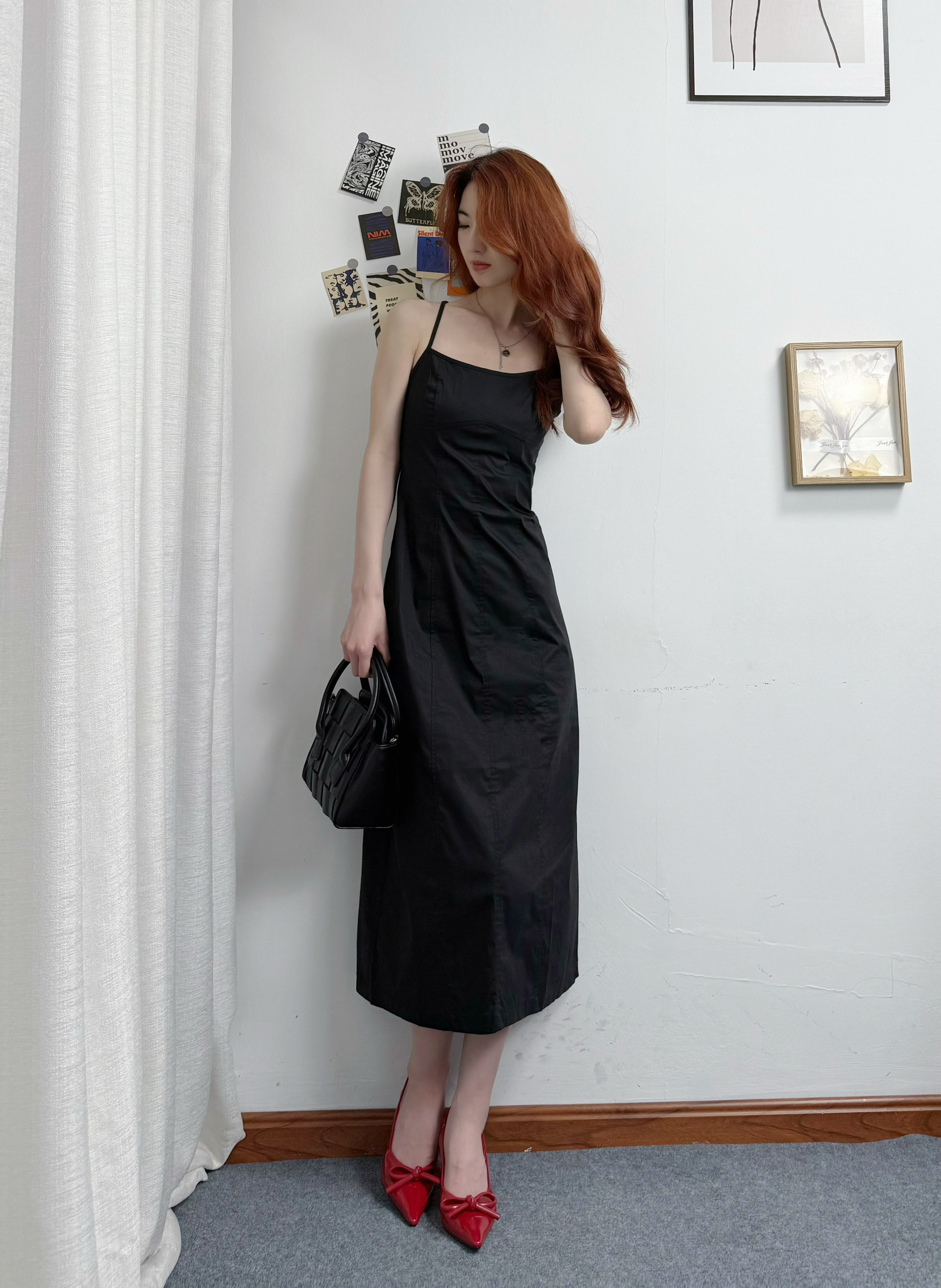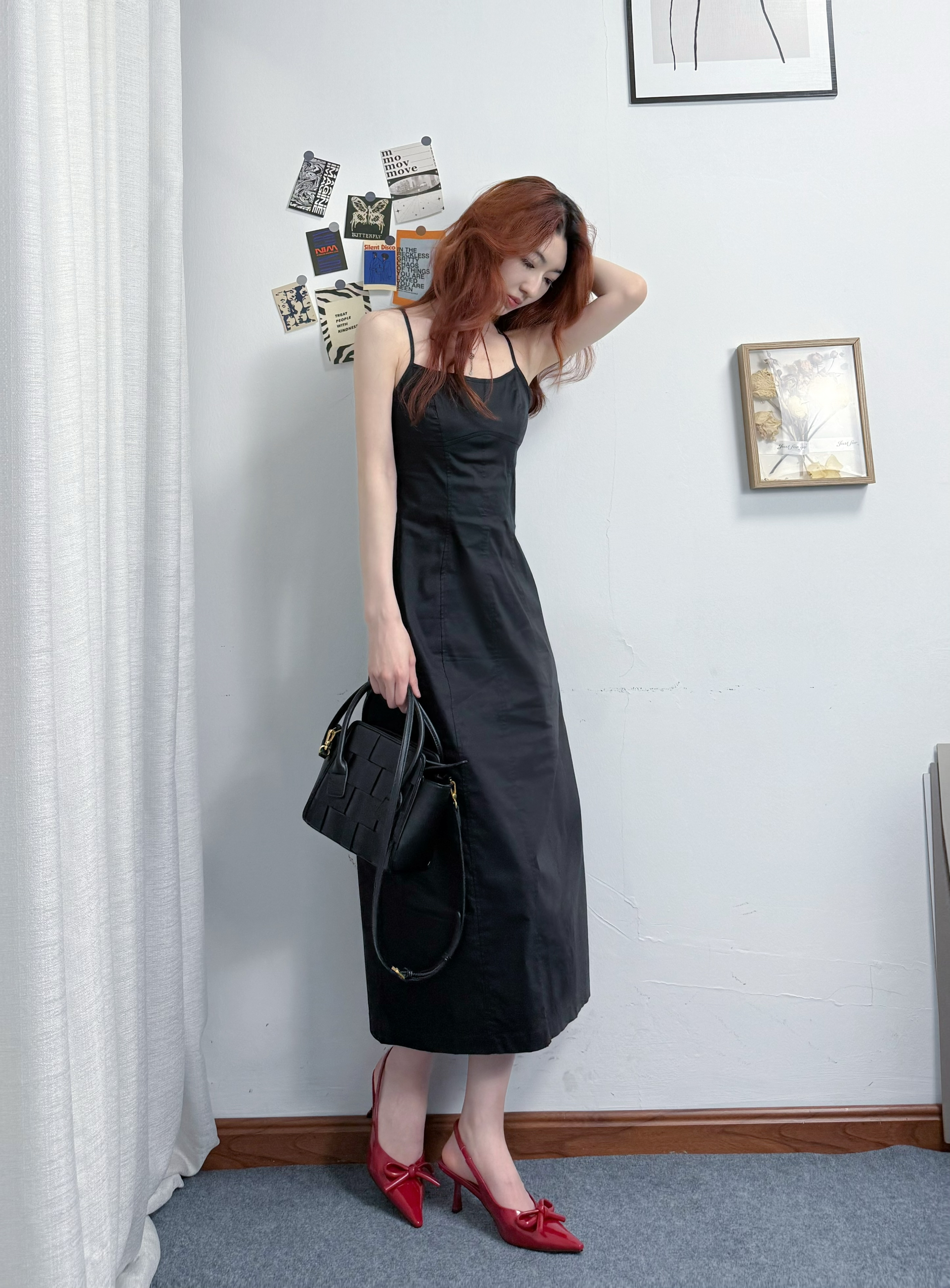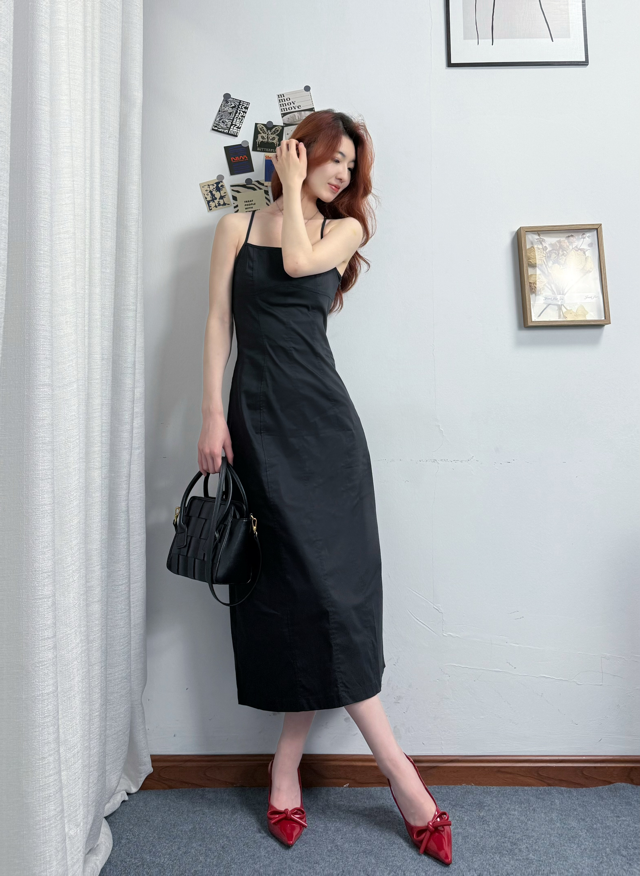 黑色吊带裙收腰做的好好呀!! 长裙我168穿差不多到脚踝👀 后开叉设计hin细节 又方便~ 好正的酒红色蝴蝶节🎀高跟鞋 小猫跟上脚hao舒服不累脚💫 平时搭配裙子裤子都很百搭~ 搭配黑色编织包包 简约休闲 小小一只 容量却hin够用 可拆卸的背带单肩斜挎都OK 一身休闲时尚又高级😍
