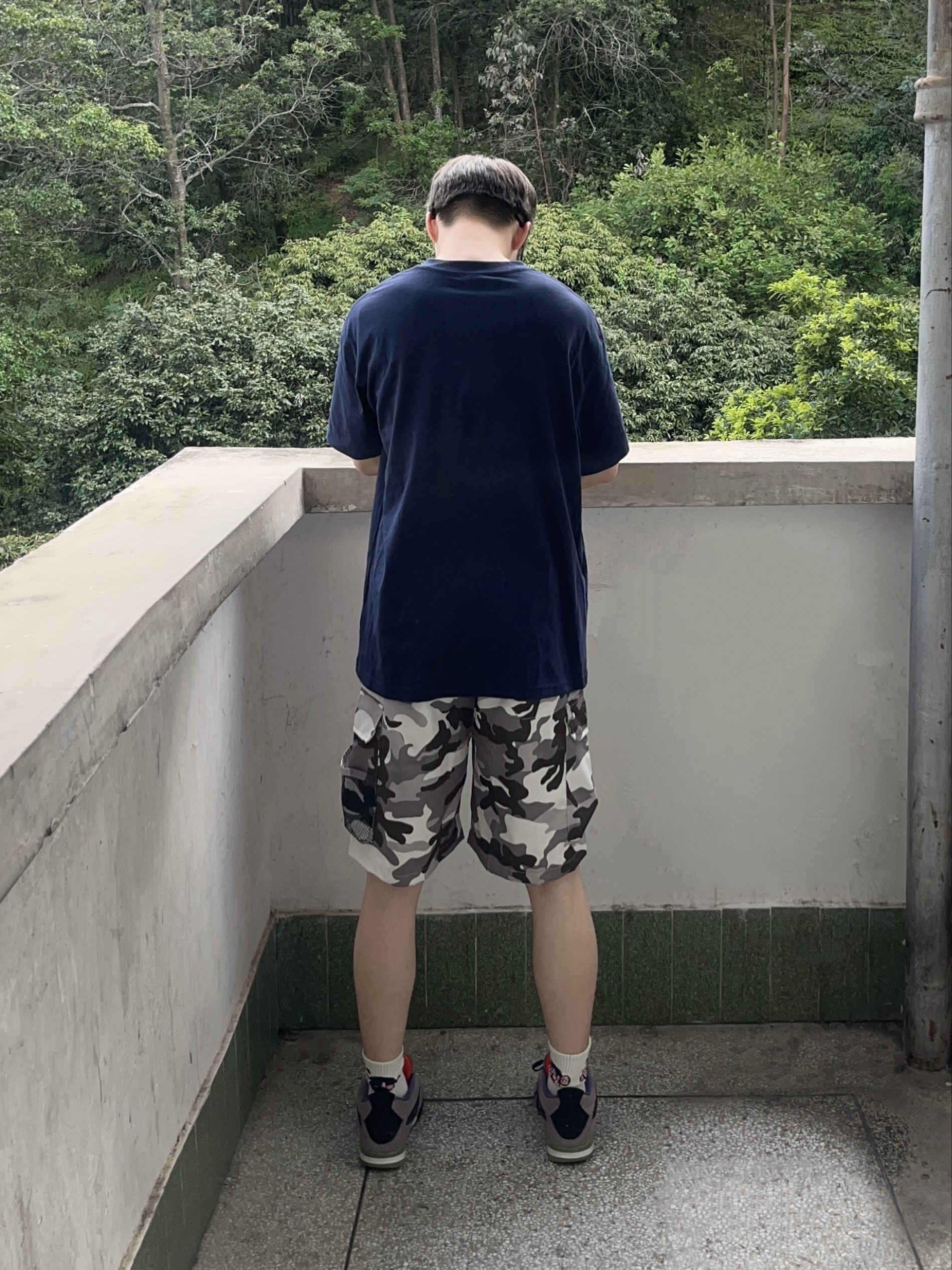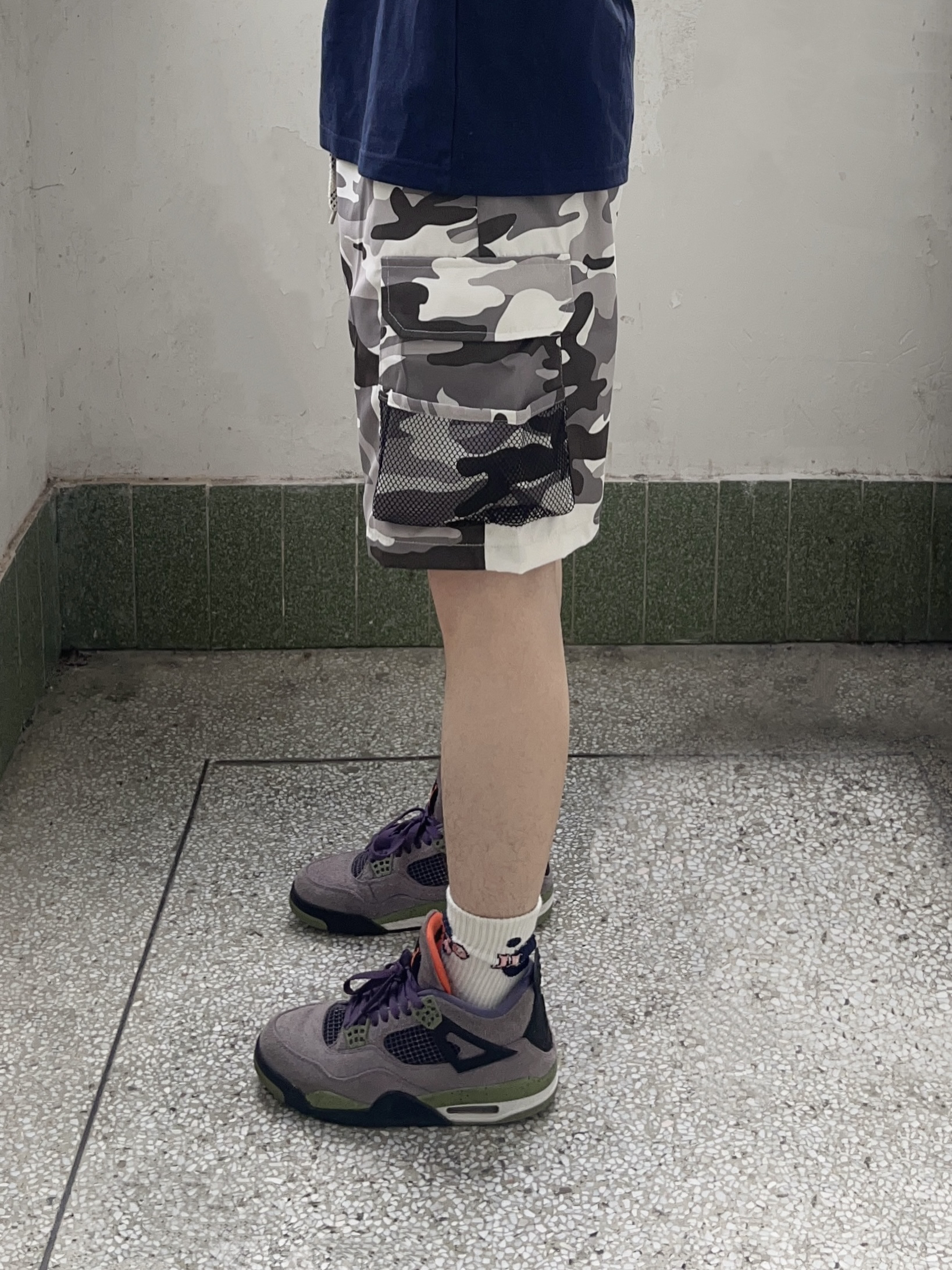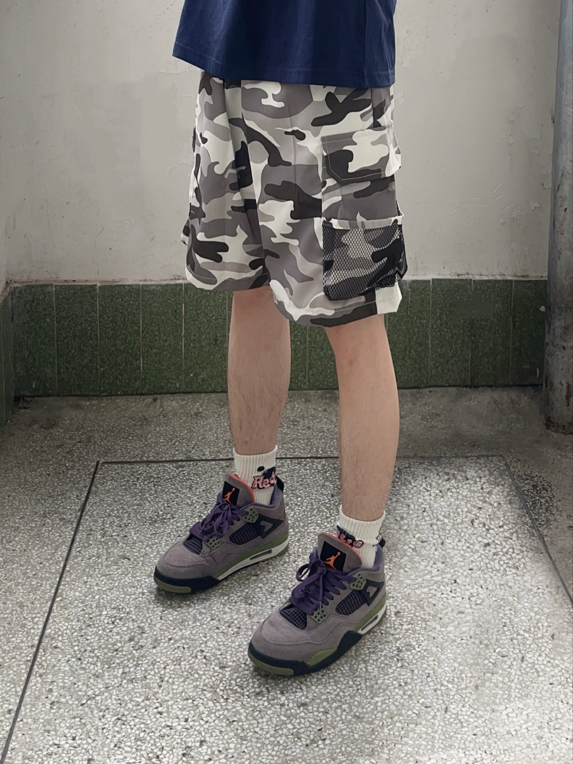 今日份穿搭分享look👀 藏青色字母印花短袖搭配上 罗萨门LuosaMen 家的灰绿拼接迷彩短裤🩳 颜值美式潮酷 网兜口袋设计实用百搭 中腰版型宽松显瘦 面料舒适透气🔥 一套搭配下来 夏日出街休闲又百搭