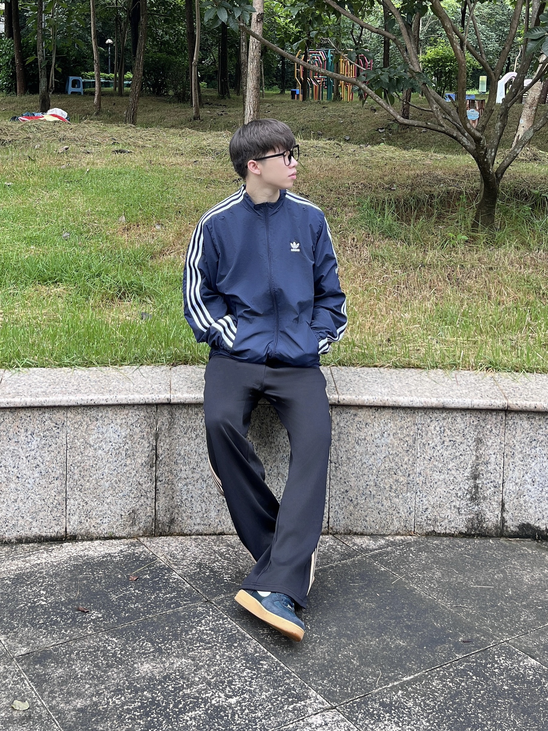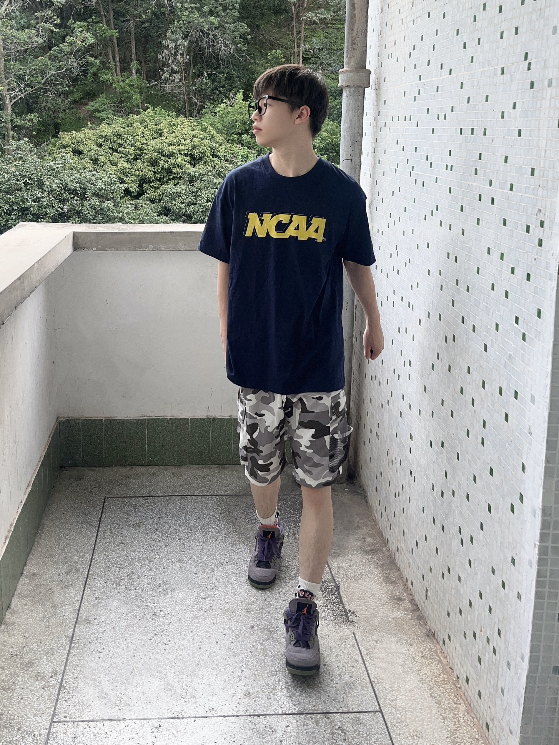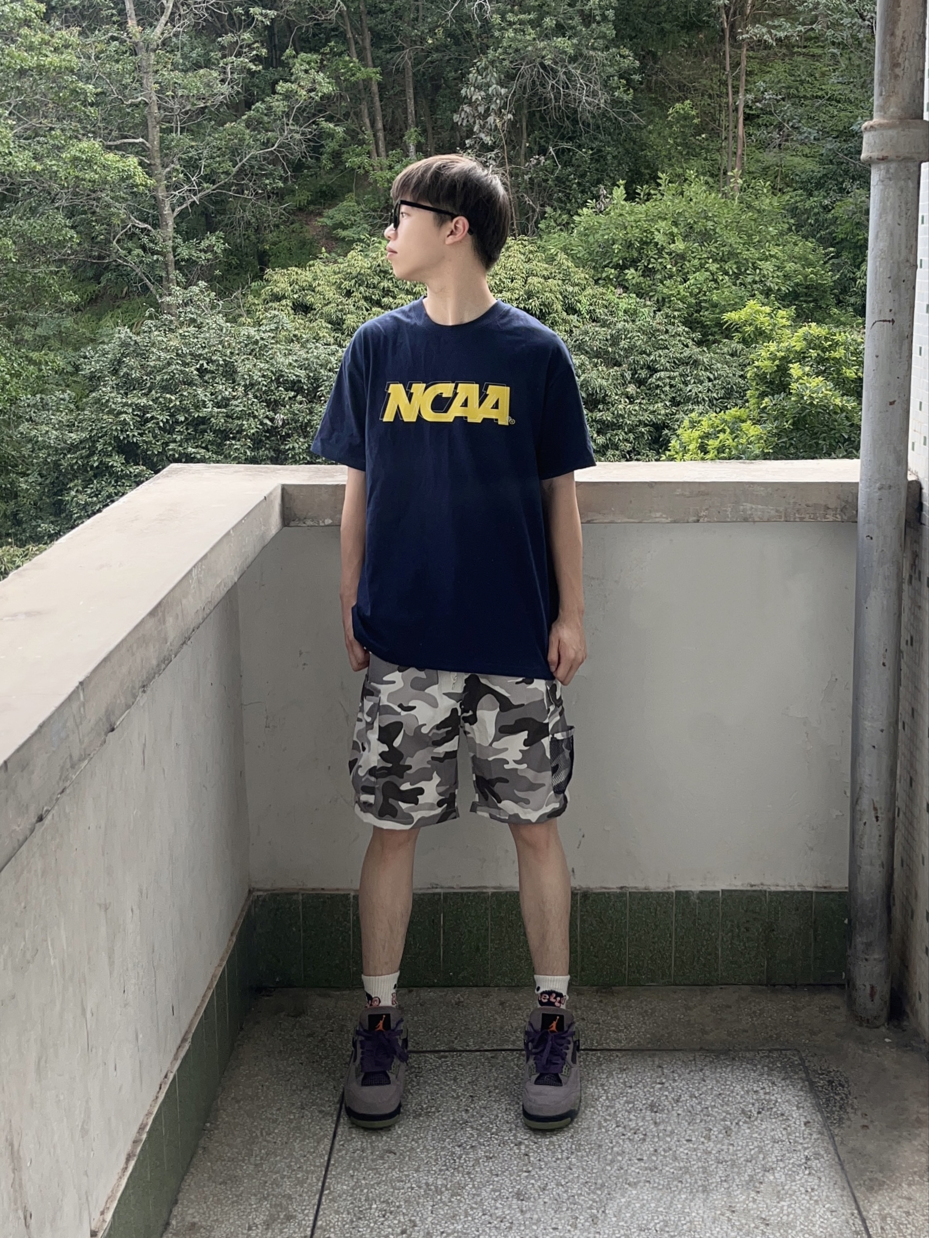 今日份穿搭分享look👀 藏青色字母印花短袖搭配上 罗萨门LuosaMen 家的灰绿拼接迷彩短裤🩳 颜值美式潮酷 网兜口袋设计实用百搭 中腰版型宽松显瘦 面料舒适透气🔥 一套搭配下来 夏日出街休闲又百搭