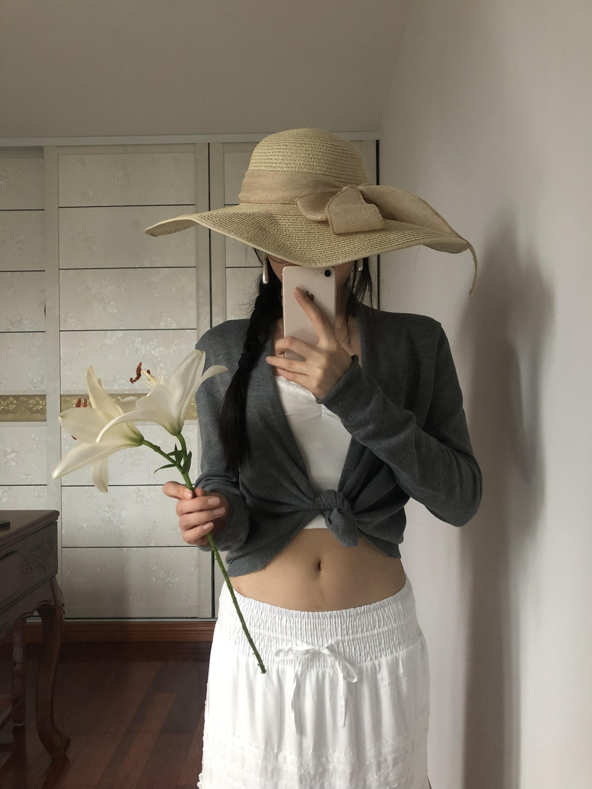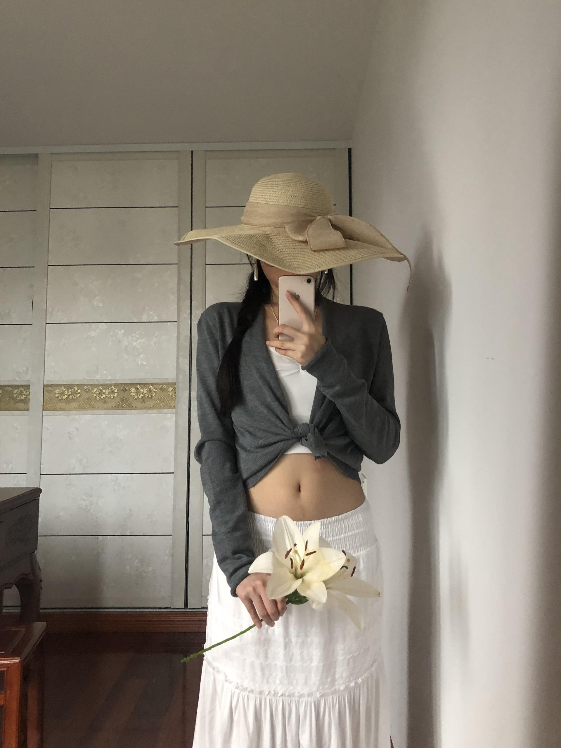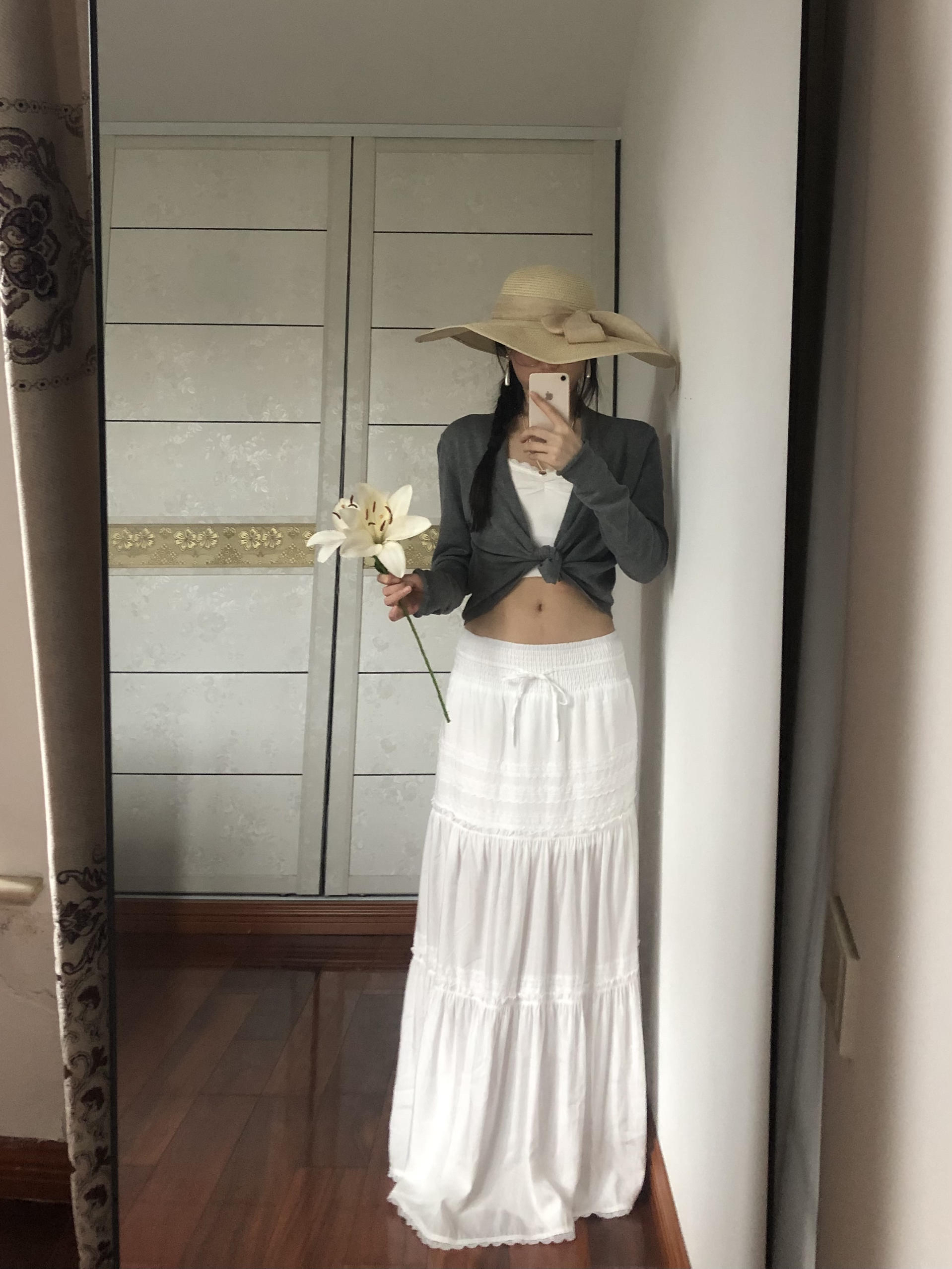 灰色短开衫+白色内搭+白色半身裙 简单三件套 随性又好看 大檐草帽一戴 慵懒氛围拉满 拿束百合拍照 清清爽爽的松弛感拿捏 主打一个毫不费力的美~