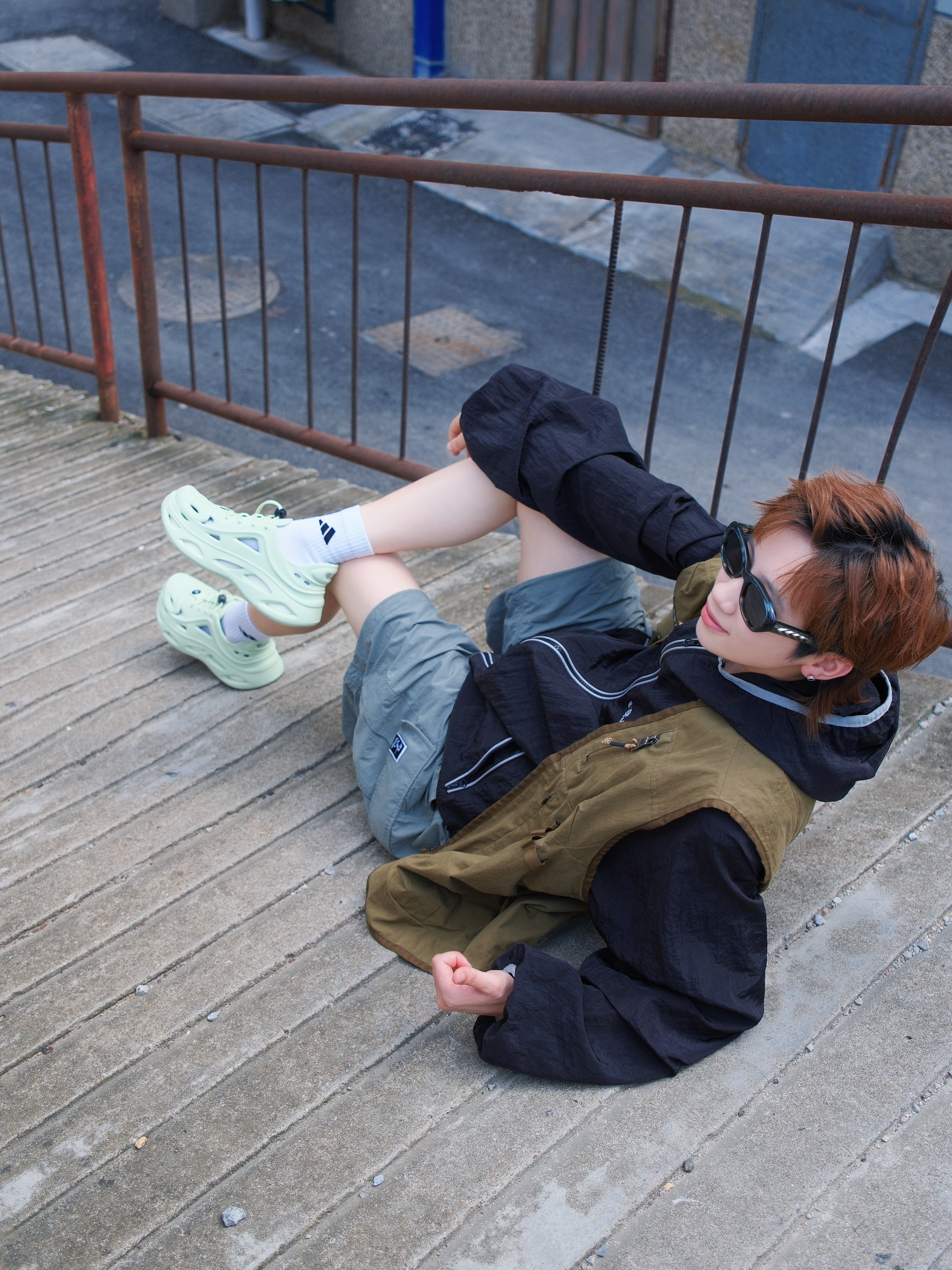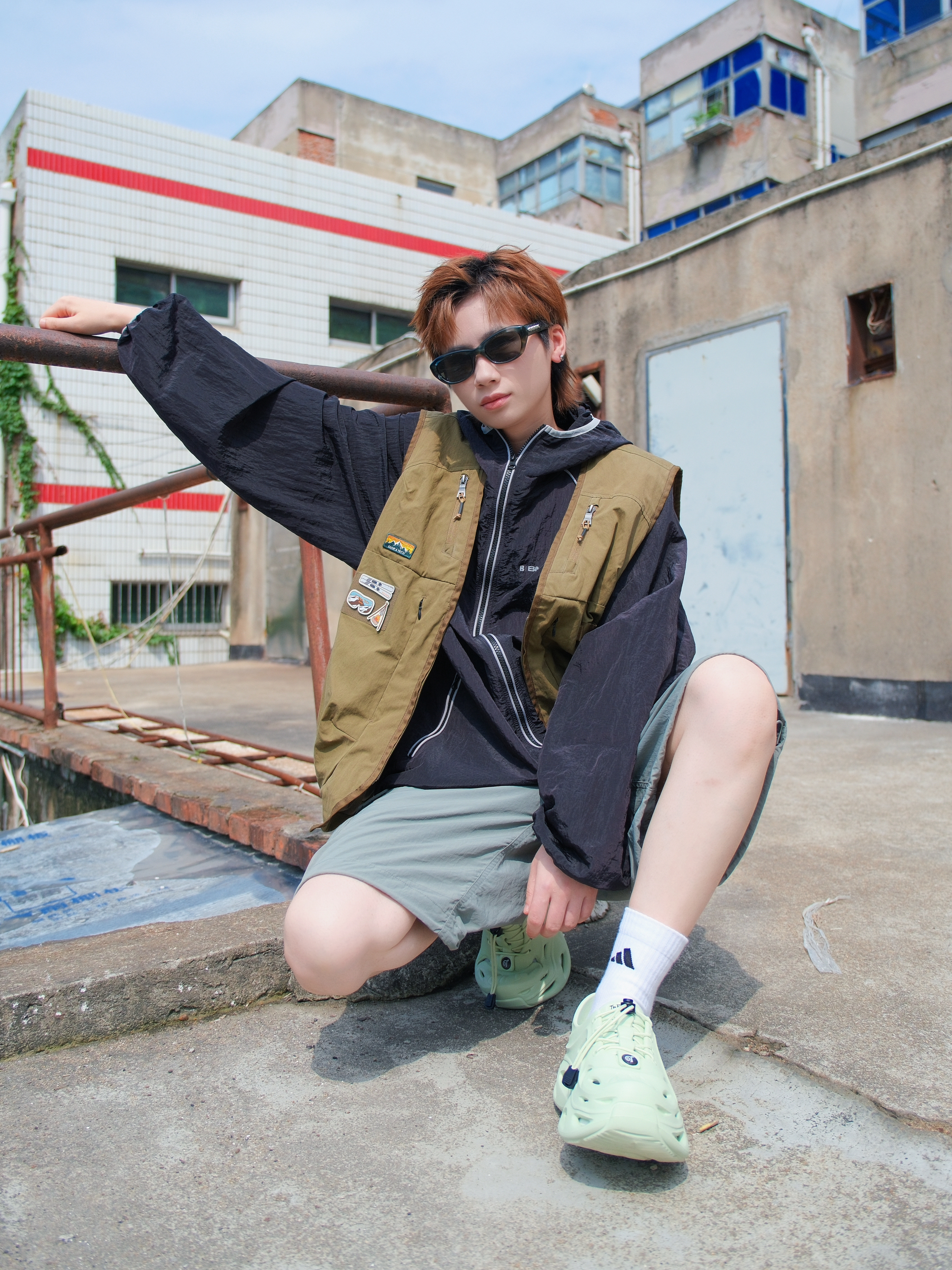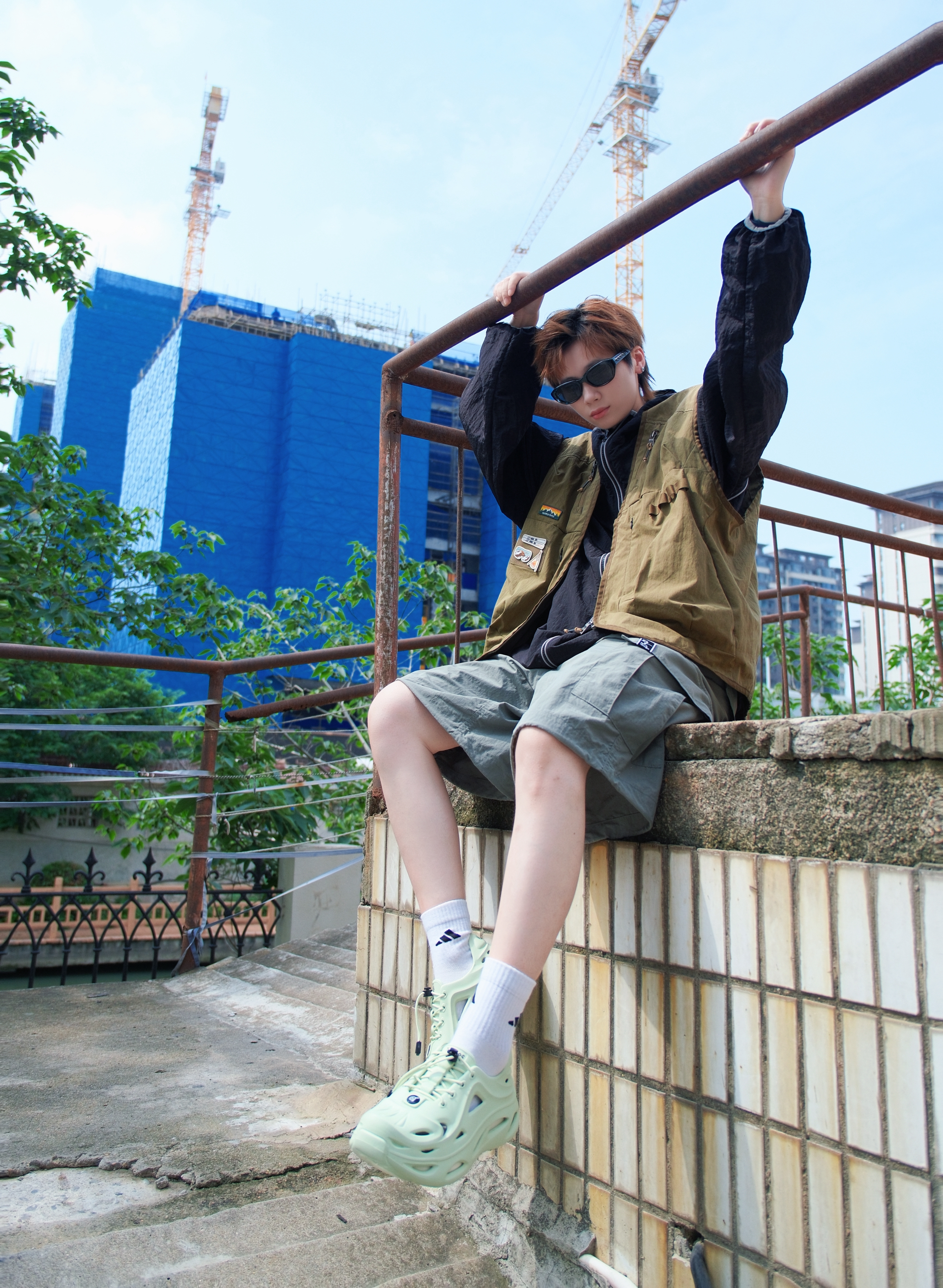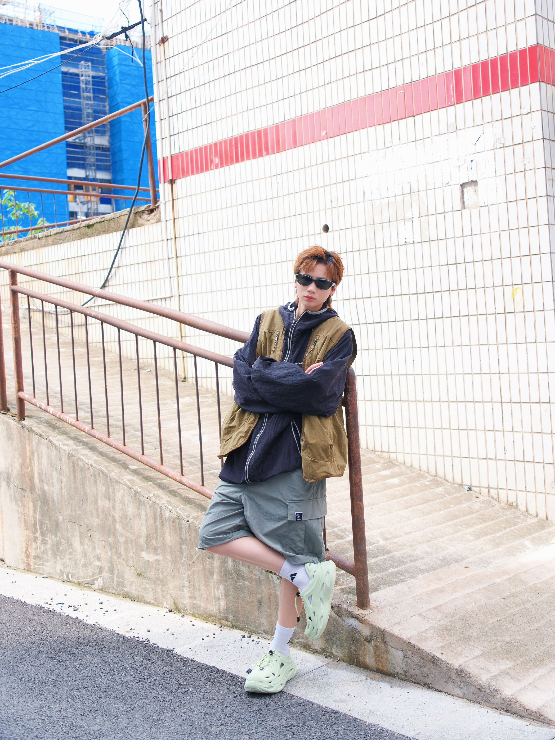 脱掉博肯拖,换上洞洞鞋 也算是完成了季节性的交替 今天来一套防晒又舒适的夏日look 上身一件黑色防晒衣 叠穿咖色马甲,有点户外感 下面搭配浅色的牛仔短裤 再来一双抹茶色的洞洞鞋 马卡龙配色穿起来很有夏天的感觉 束口鞋带,脚感轻盈防滑 夏天去溯溪也是OK的