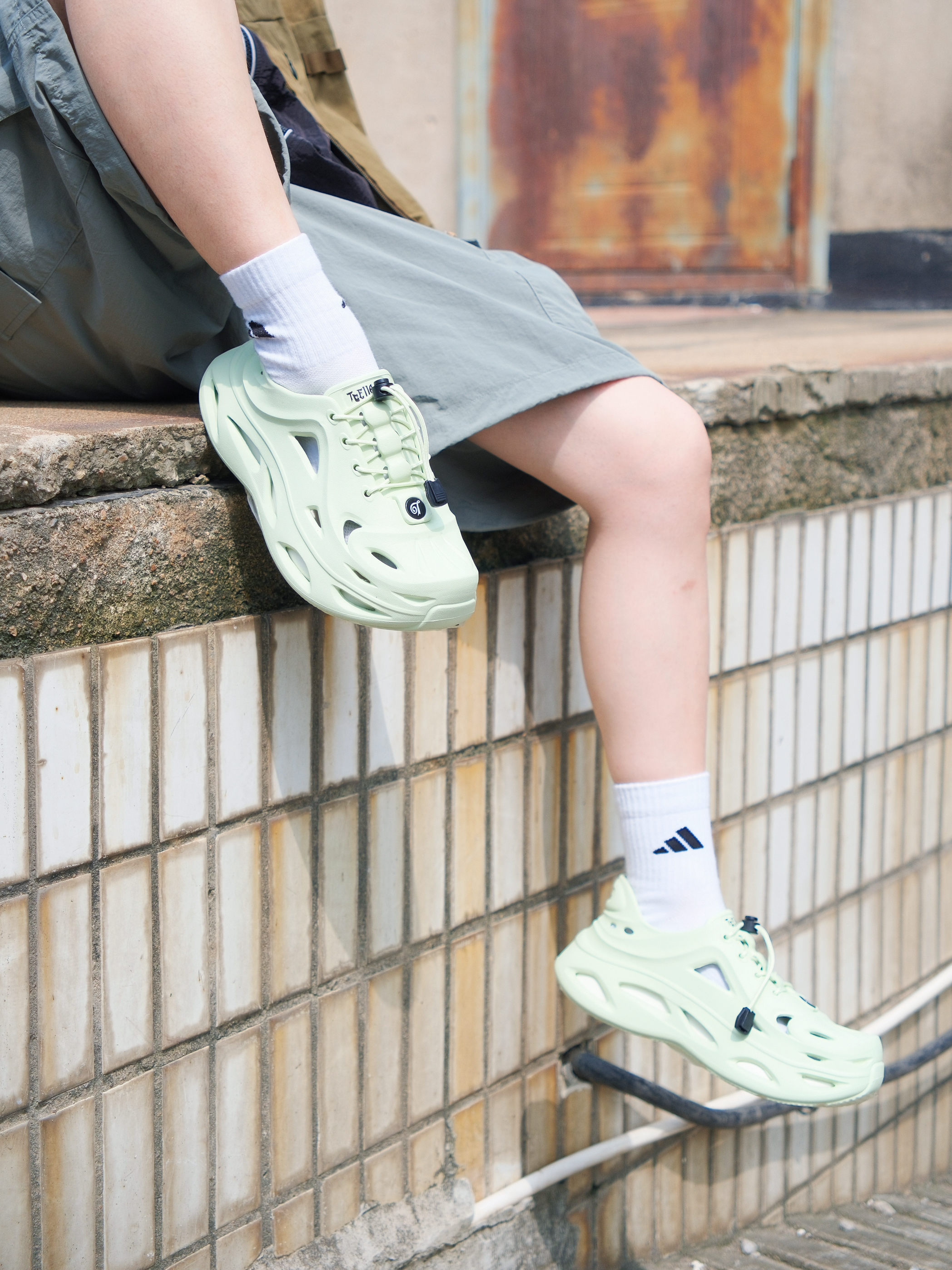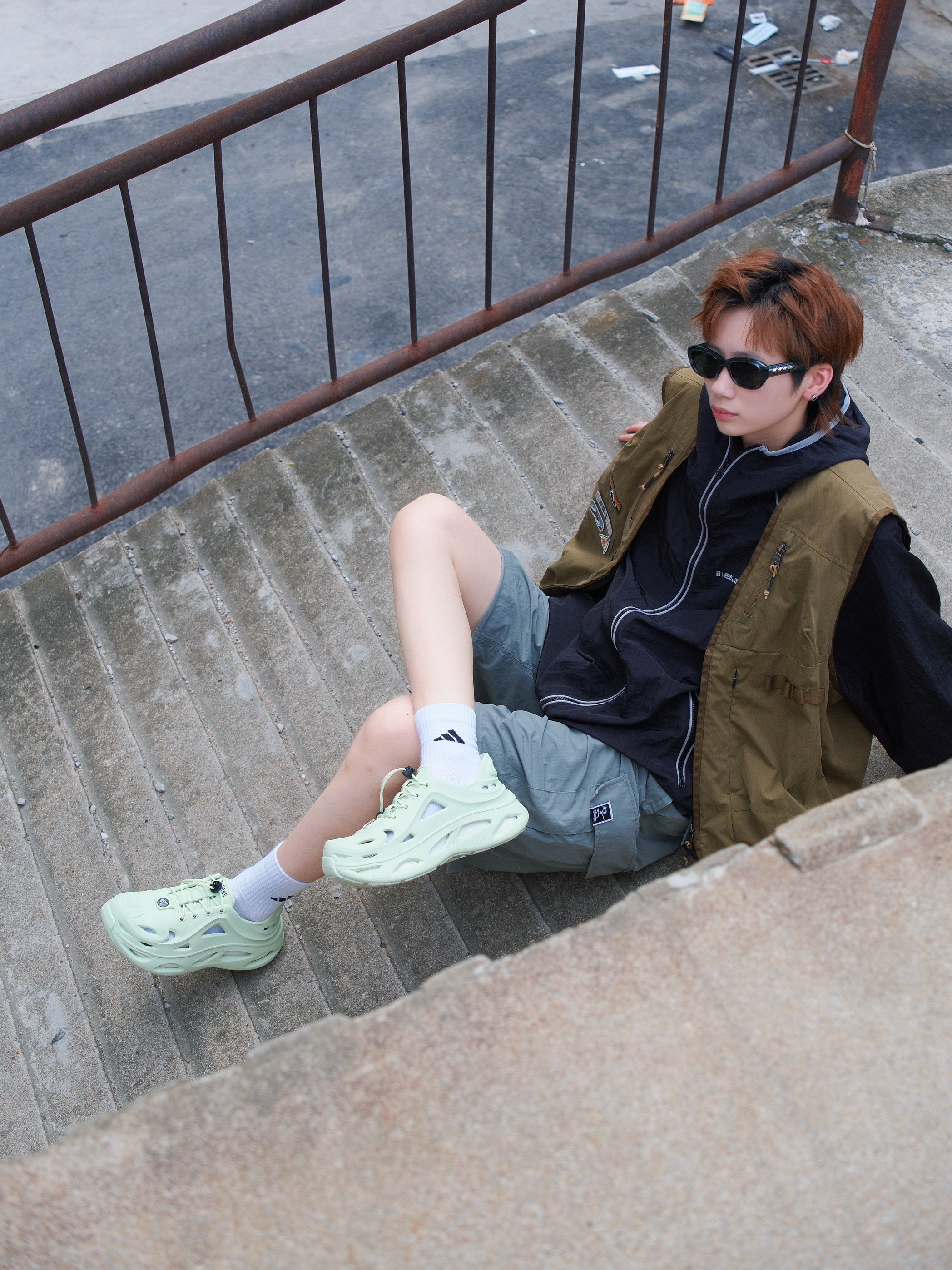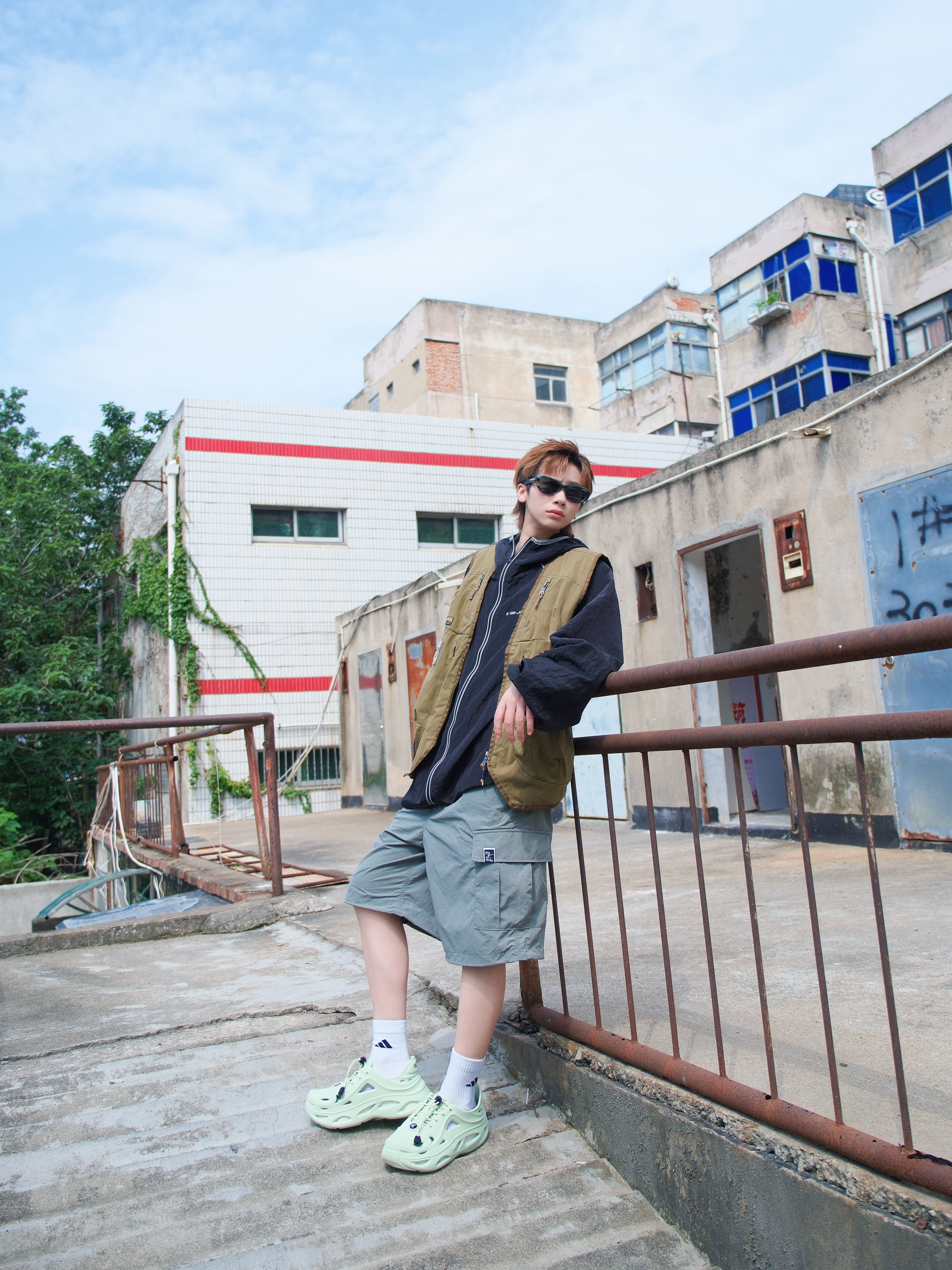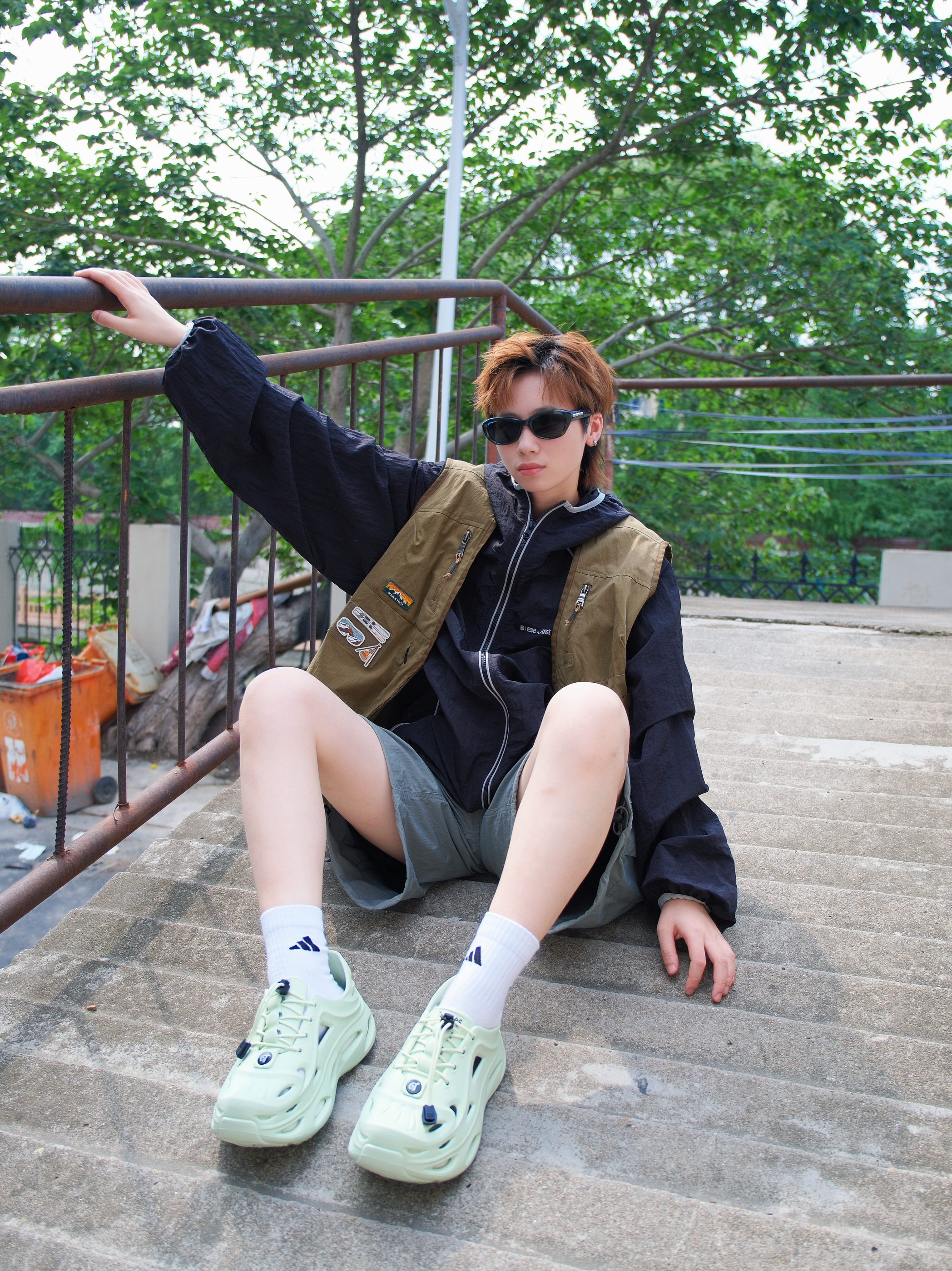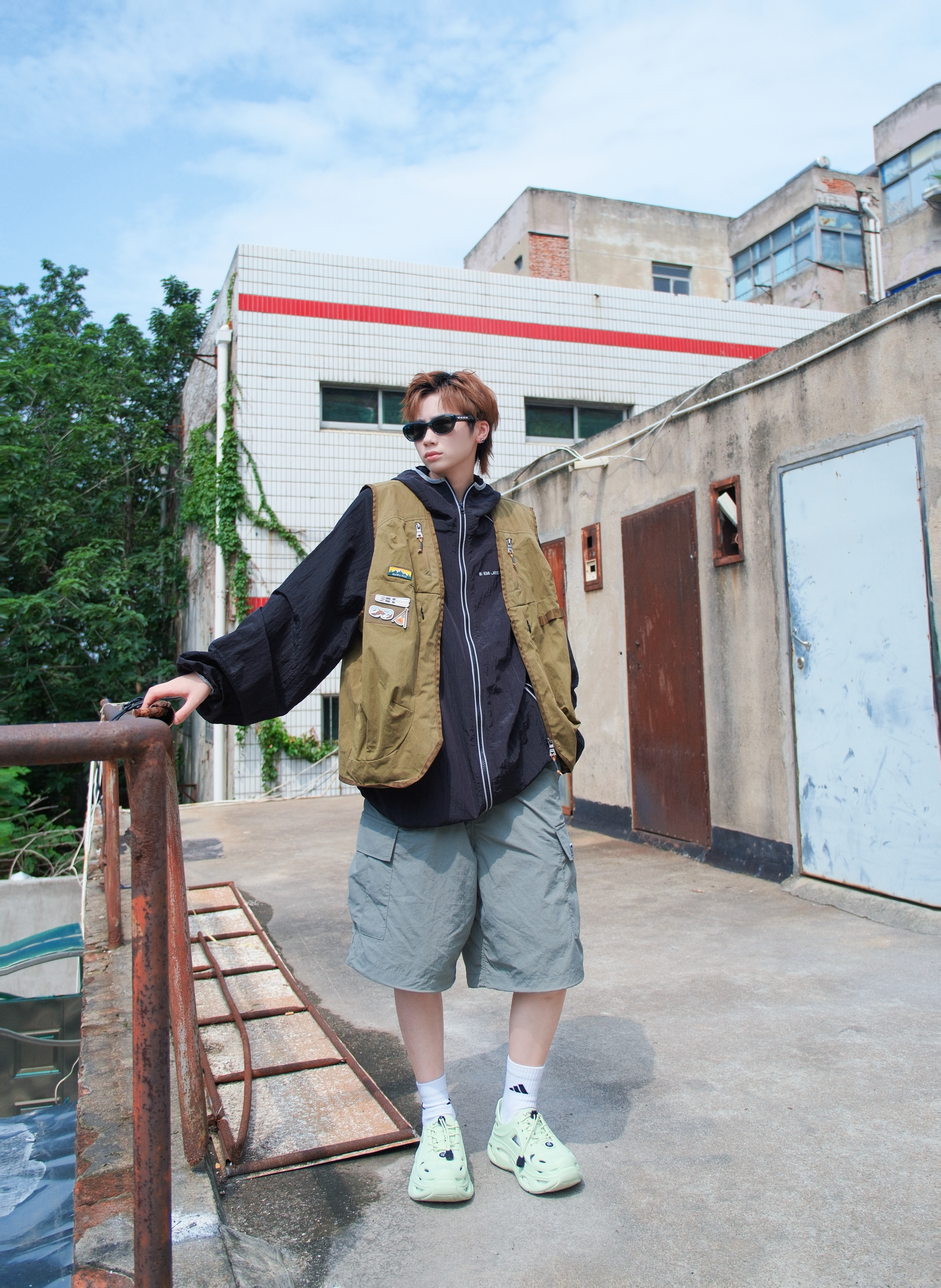 脱掉博肯拖,换上洞洞鞋 也算是完成了季节性的交替 今天来一套防晒又舒适的夏日look 上身一件黑色防晒衣 叠穿咖色马甲,有点户外感 下面搭配浅色的牛仔短裤 再来一双抹茶色的洞洞鞋 马卡龙配色穿起来很有夏天的感觉 束口鞋带,脚感轻盈防滑 夏天去溯溪也是OK的
