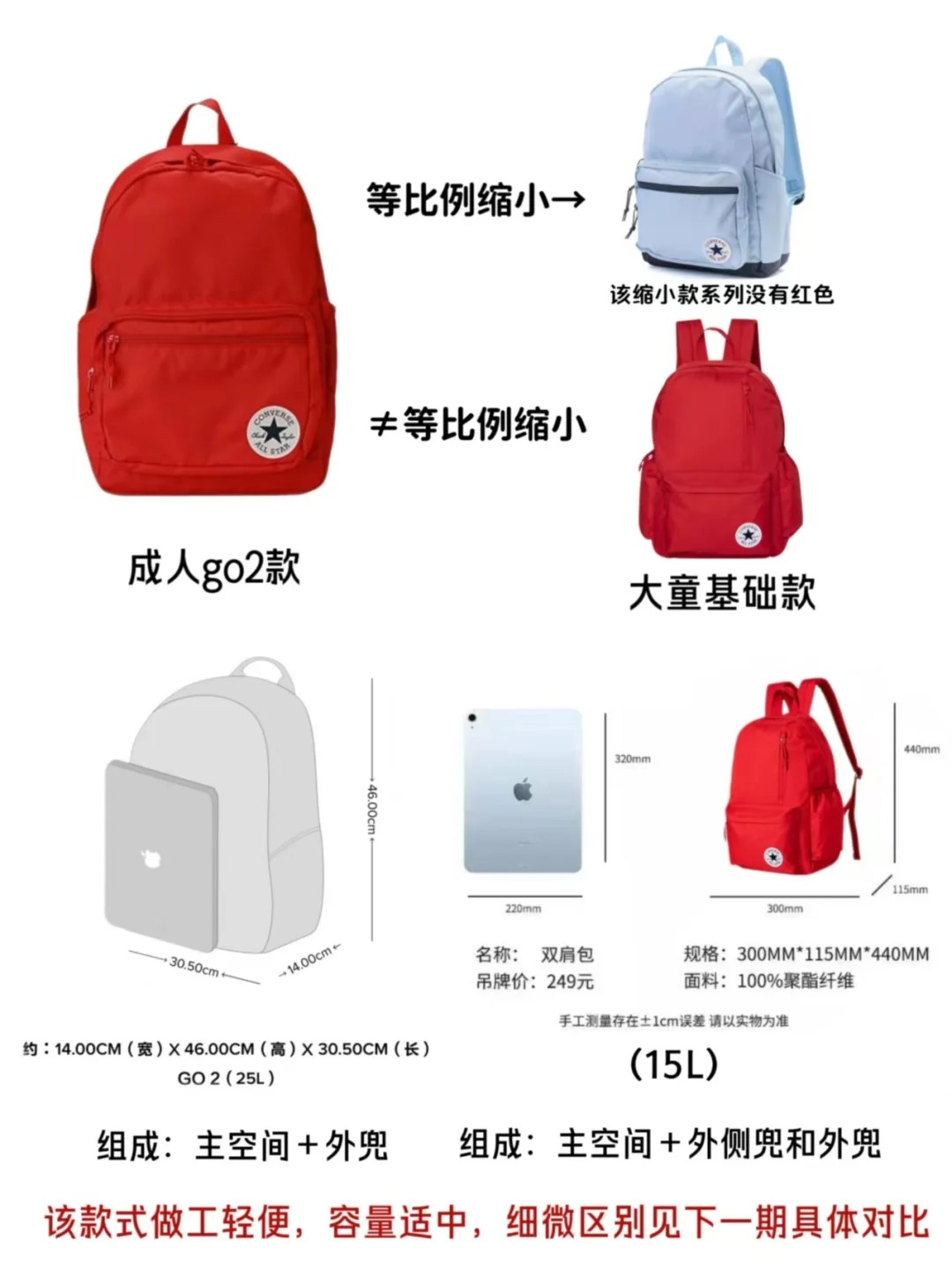 ★成人经典款27L,做工厚实略重,适合175左右及以上 ★大童经典款17L,做工适中不重,适合172左右及以下 ✔主空间+外隔层+外侧兜和外兜 ★成人 go2 款25L,做工简约轻便,适合168左右及以上 ★大童基础款15L,做工简约轻便,适合165左右及以下 ✔主空间+外兜(大童基础款有外侧兜) 以上是根据 上身效果 建议适合的身高人群,仅作参考,需求大容量可忽略,官方可装体积也是大概范围,具体...