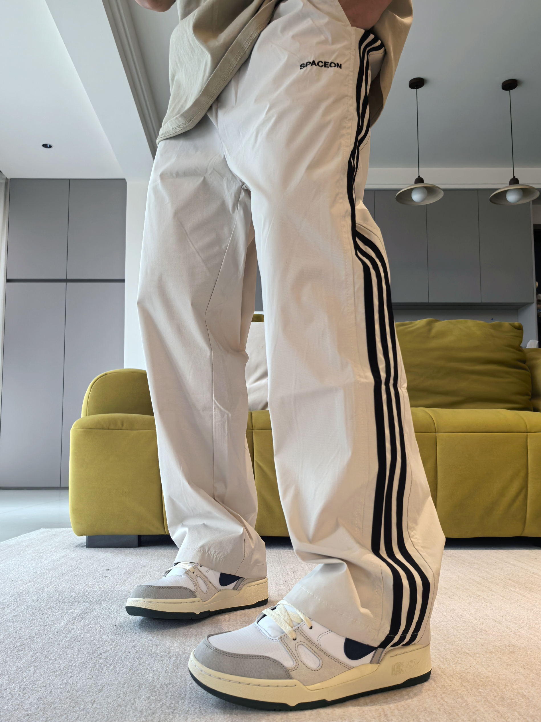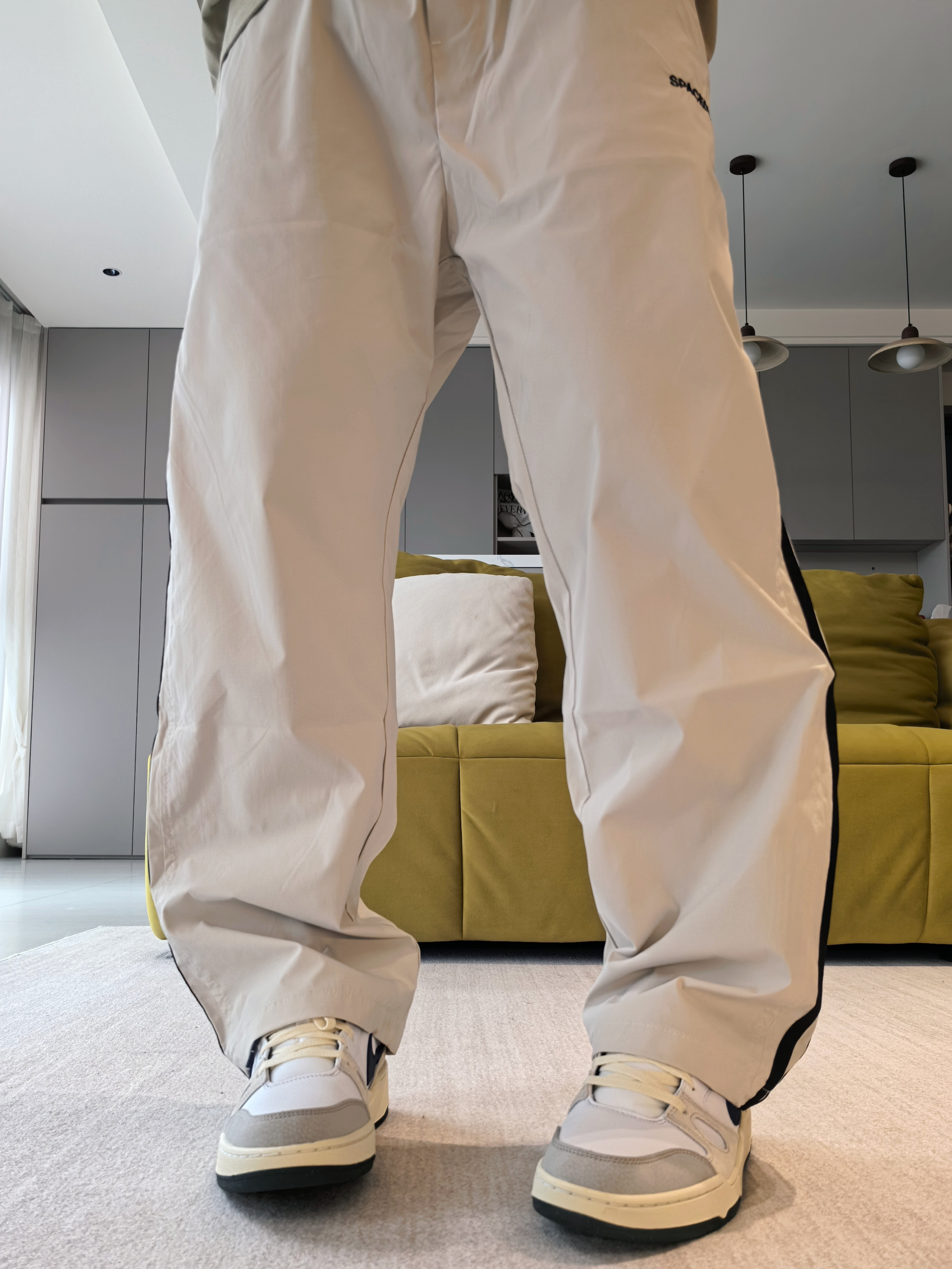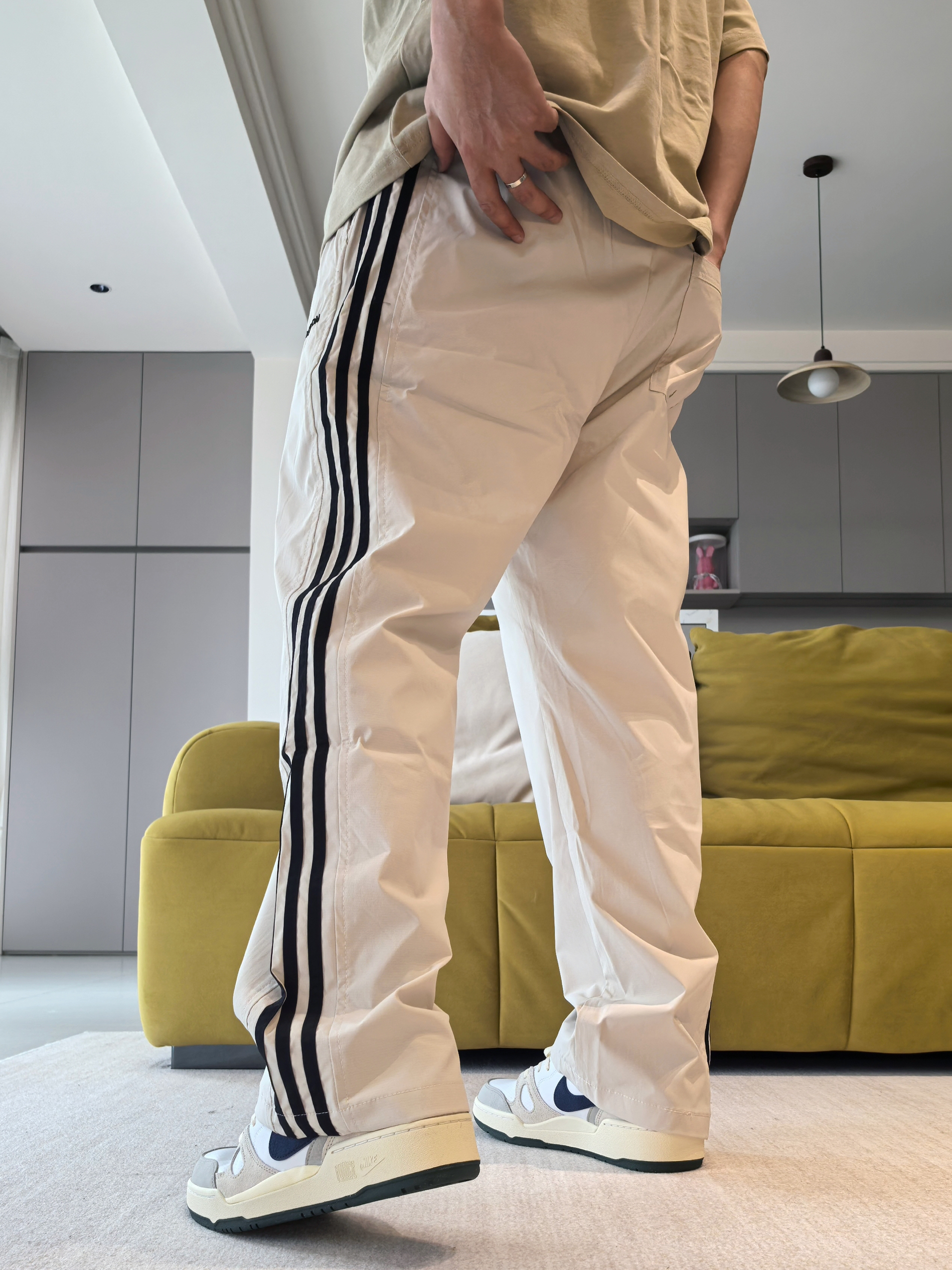 🔥是有它的原因的 毕竟颜值不差,大部分上脚都能百搭到位 ------ 主要注意的就是细节做工,以及鞋头尺码问题 同时脚感要多磨合! 一丢丢伞兵裤造型 小腿位置微微的弯弧度造型,上身后很校园 ------ 👖侧边的黑色竖杠确实经典美潮 造型上融合了许多裤型的特点 上身的感觉就是妥妥的校园休闲裤