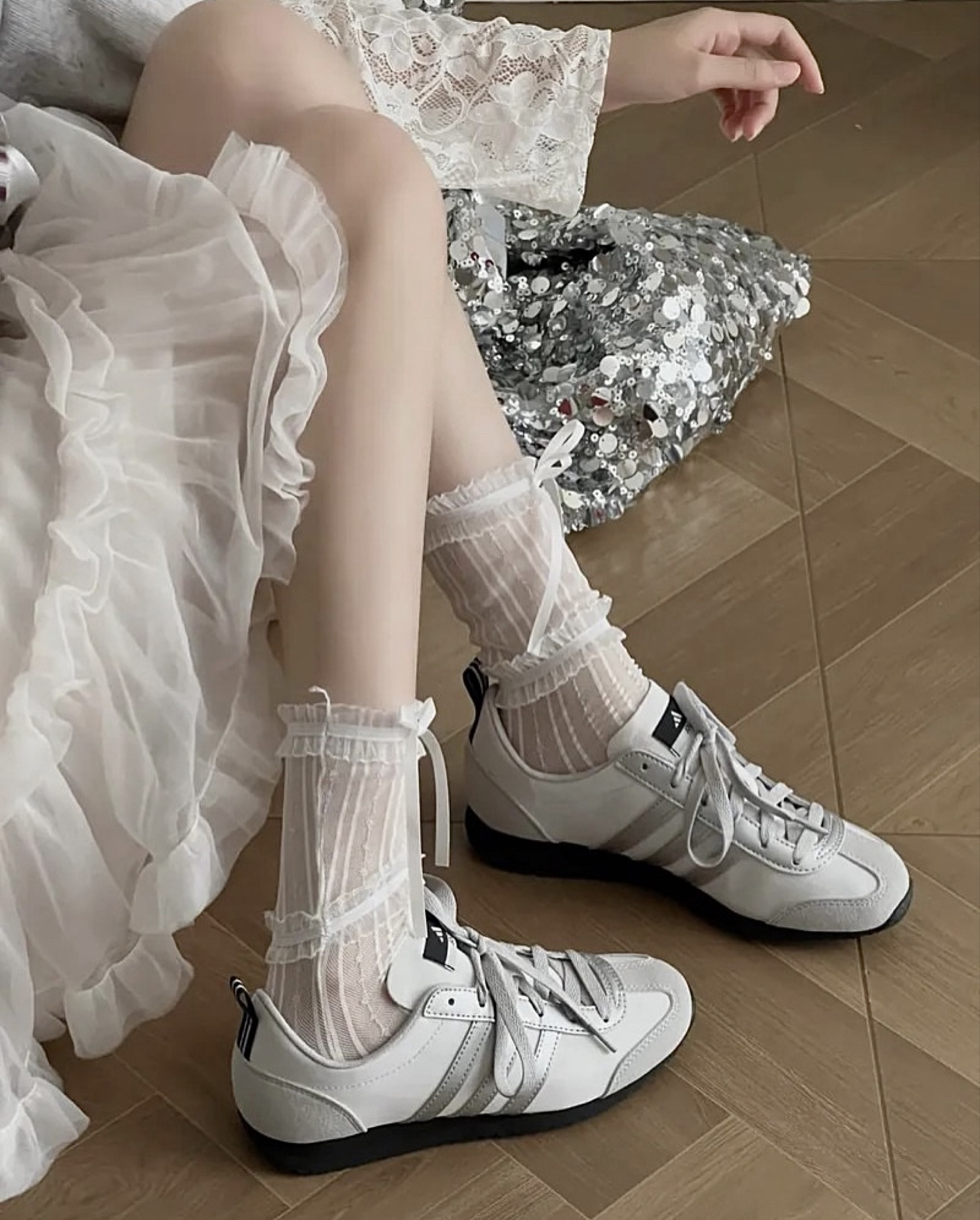 银白配色超亮眼,时尚感直接拉满,走在街上回头率爆表。 搭配上精致的蕾丝袜,再系上柔美的蝴蝶结,甜酷风稳稳拿捏 无论是日常出街还是拍照打卡,都能轻松成为焦点~