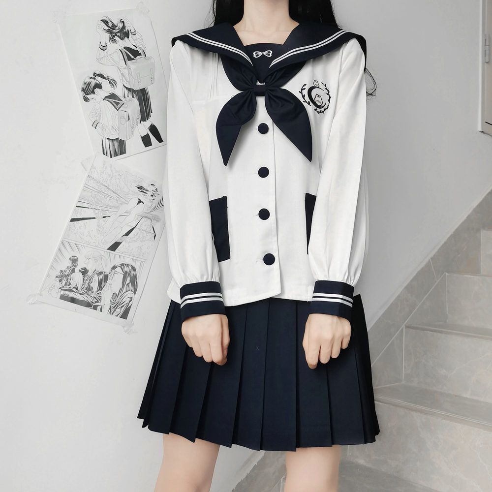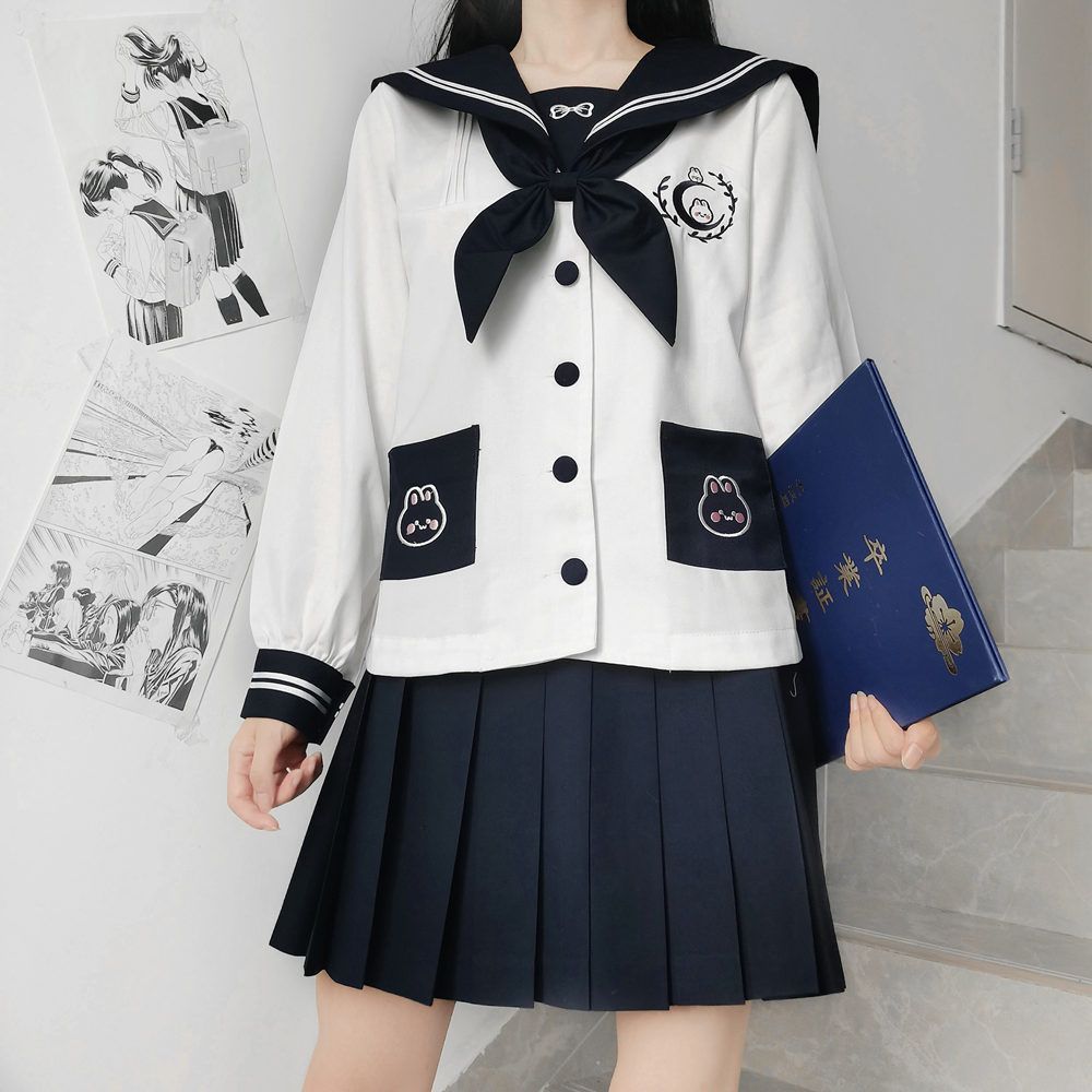 晨光漫过走廊时,奶白色襟线晃出三道软萌的弧线——这不是普通中间服,是原创设计「月中兔」把幼稚园绘本穿在身上的软妹杀!260g云朵棉面料像被暖炉烘过的奶霜,贴肤软到能捏出水,后腰处刺绣的垂耳兔正抱着月牙儿打哈欠,隔壁班学妹追着问:"学姐!你制服上的兔子会动吗?"